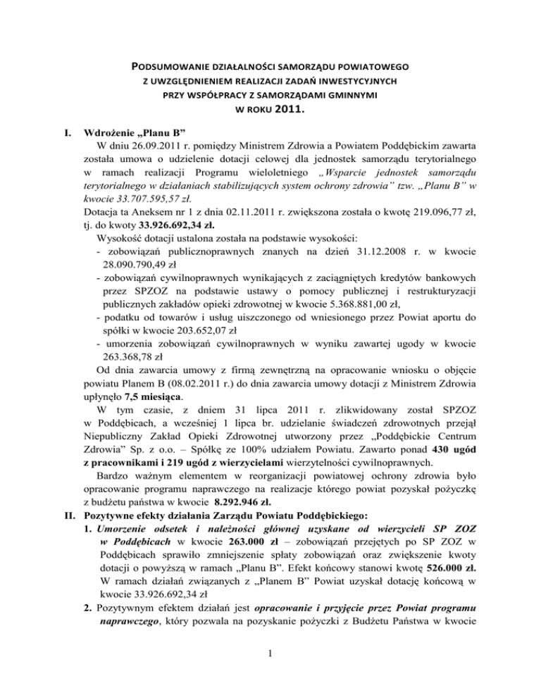 PODSUMOWANIE DZIAŁALNOŚCI SAMORZĄDU POWIATOWEGO Z UWZGLĘDNIENIEM REALIZACJI ZADAO INWESTYCYJNYCH PRZY WSPÓŁPRACY Z SAMORZĄDAMI GMINNYMI W ROKU 2011. Wdrożenie „Planu B” W dniu 26.09.2011 r. pomiędzy Ministrem Zdrowia a Powiatem Poddębickim zawarta została umowa o udzielenie dotacji celowej dla jednostek samorządu terytorialnego w ramach realizacji Programu wieloletniego „Wsparcie jednostek samorządu terytorialnego w działaniach stabilizujących system ochrony zdrowia” tzw. „Planu B” w kwocie 33.707.595,57 zł. Dotacja ta Aneksem nr 1 z dnia 02.11.2011 r. zwiększona została o kwotę 219.096,77 zł, tj. do kwoty 33.926.692,34 zł. Wysokość dotacji ustalona została na podstawie wysokości: - zobowiązań publicznoprawnych znanych na dzień 31.12.2008 r. w kwocie 28.090.790,49 zł - zobowiązań cywilnoprawnych wynikających z zaciągniętych kredytów bankowych przez SPZOZ na podstawie ustawy o pomocy publicznej i restrukturyzacji publicznych zakładów opieki zdrowotnej w kwocie 5.368.881,00 zł, - podatku od towarów i usług uiszczonego od wniesionego przez Powiat aportu do spółki w kwocie 203.652,07 zł - umorzenia zobowiązań cywilnoprawnych w wyniku zawartej ugody w kwocie 263.368,78 zł Od dnia zawarcia umowy z firmą zewnętrzną na opracowanie wniosku o objęcie powiatu Planem B (08.02.2011 r.) do dnia zawarcia umowy dotacji z Ministrem Zdrowia upłynęło 7,5 miesiąca. W tym czasie, z dniem 31 lipca 2011 r. zlikwidowany został SPZOZ w Poddębicach, a wcześniej 1 lipca br. udzielanie świadczeń zdrowotnych przejął Niepubliczny Zakład Opieki Zdrowotnej utworzony przez „Poddębickie Centrum Zdrowia” Sp. z o.o. – Spółkę ze 100% udziałem Powiatu. Zawarto ponad 430 ugód z pracownikami i 219 ugód z wierzycielami wierzytelności cywilnoprawnych. Bardzo ważnym elementem w reorganizacji powiatowej ochrony zdrowia było opracowanie programu naprawczego na realizacje którego powiat pozyskał pożyczkę z budżetu państwa w kwocie 8.292.946 zł. II. Pozytywne efekty działania Zarządu Powiatu Poddębickiego: 1. Umorzenie odsetek i należności głównej uzyskane od wierzycieli SP ZOZ w Poddębicach w kwocie 263.000 zł – zobowiązań przejętych po SP ZOZ w Poddębicach sprawiło zmniejszenie spłaty zobowiązań oraz zwiększenie kwoty dotacji o powyższą w ramach „Planu B”. Efekt końcowy stanowi kwotę 526.000 zł. W ramach działań związanych z „Planem B” Powiat uzyskał dotację końcową w kwocie 33.926.692,34 zł 2. Pozytywnym efektem działań jest opracowanie i przyjęcie przez Powiat programu naprawczego, który pozwala na pozyskanie pożyczki z Budżetu Państwa w kwocie I. 1 8.292.946 zł, która była źródłem pozyskania środków niezbędnych do rozliczenia dotacji uzyskanej z „Planu B” (udział własny 20%). 3. Zwiększenie dochodów Powiatu z tytułu odsetek bankowych od środków pozostających na rachunkach bankowych w stosunku do roku 2010 o 60.000 zł. Powyższy efekt pozwoli na skuteczne systematyczne gromadzenie środków na lokatach terminowych. 4. W wyniku intensywnych działań Zarządu Powiatu uzyskano: - oszczędności w ramach renegocjacji umów z bankiem obsługującym dawny SP ZOZ - oszczędności w kosztach działania samego Starostwa. Łącznie uzyskano ok. 120.000 zł. Uzyskane oszczędności przeznaczono między innymi na modernizację chodnika na ul. Południowej w Poddębicach oraz zakup kostki brukowej celem wbudowania jej na terenie gminy Uniejów, Zadzim i Pęczniew. III. Realizacji zadań w zakresie inwestycji drogowych 1. „Przebudowa drogi powiatowej nr 3709 E Panaszew – Kałów – Puczniew – Lutomiersk, na odcinku Panaszew – Ciężków długości 2,0 km”. Dokończono rozpoczęte w 2010r. roboty budowlane. Wartość zadania wyniosła 750 472,33 zł, (roboty budowlane – 745 592,33 zł., nadzór inwestorski – 4 880,00 zł.) w tym: środki własne Powiatu – 375 236,17 zł. pomoc finansowa Gminy Poddębice - 375 236,16 zł. Realizacja zadnia była możliwa dzięki nawiązaniu współpracy z Gminą Poddębice. Wielkość pomocy udzielonej przez Gminę wyniosła 50% kosztów inwestycji. 2. „Przebudowa drogi powiatowej nr 3747E ul. 1 Maja w Poddębicach na odcinku długości 0,256 km” Dokończono rozpoczęte w 2010r. roboty budowlane. Wartość zadania - 200 503,35 zł (roboty budowlane – 198 714,92 zł., nadzór inwestorski 1 788,43 zł.) 3. „Wykonanie nawierzchni z mieszanki kruszywa łamanego ze skały magmowej na drodze powiatowej nr 3719 E Sarnów – Malanów o długości 2,94 km” Wartość zadania - 609 723,30 zł (dostawa kruszywa – 415 887,60 zł., roboty budowlane – 189 530,70 zł., nadzór inwestorski 4 305,00 zł.) w tym: środki własne Powiatu – 441 723,30 zł. pomoc finansowa Gminy Dalików - 20 000,00 zł. budżet Województwa Łódzkiego – 148 000,00 zł. 4. Przebudowa chodnika drogi powiatowej nr 3716E ul. Południowa w Poddębicach Roboty rozpoczęto dzięki nawiązaniu współpracy z Gminą Poddębice. Na okoliczność tego zostało zawarte Porozumienie / umowa, w którym to Gmina Poddębice zobowiązała się do sfinansowania 50% kosztów inwestycji. Wartość zadania wyniosła 82 855,10 zł w tym: środki własne Powiatu – 41 427,55 zł. pomoc finansowa Gminy Poddębice - 41 427,55 zł. 2 5. Likwidacja szkód spowodowanych przez powódź z 2010r.: a) „Wykonanie nawierzchni z mieszanek mineralno – asfaltowych standard I, grubość warstwy ścieralnej po zagęszczeniu 4 cm na drodze powiatowej nr 1700 E w miejscowości Lubola i Wierzchy na łącznym odcinku 4,00 km”, Wartość zadania - 646 542,74 zł ( roboty budowlane – 641 622,74 zł., nadzór inwestorski 4 920,00 zł.) w tym: środki własne Powiatu – 133 244,74 zł. budżet państwa – 513 298,00 zł. b) „Wykonanie nawierzchni z mieszanek mineralno – asfaltowych standard I, grubość warstwy ścieralnej po zagęszczeniu 4 cm na drodze powiatowej nr 3732 E na o