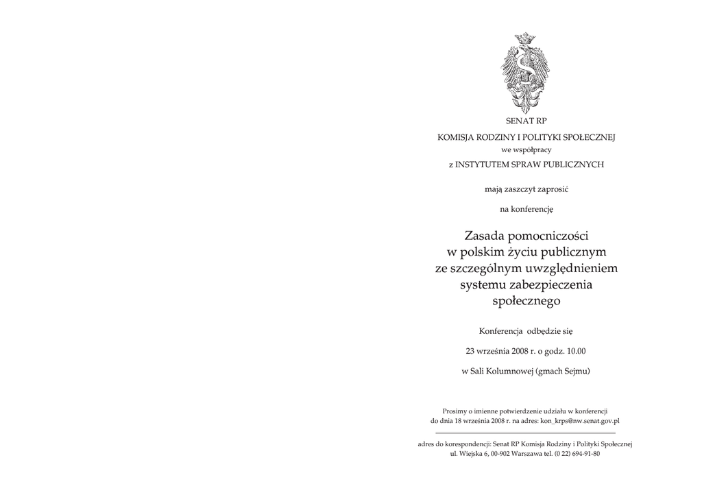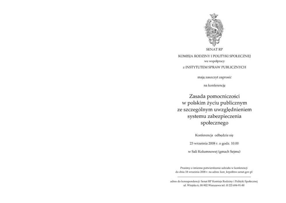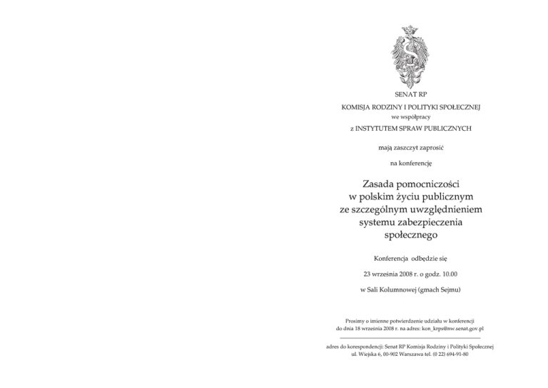 SENAT RP KOMISJA RODZINY I POLITYKI SPO£ECZNEJ we wspó³pracy z INSTYTUTEM SPRAW PUBLICZNYCH maj¹ zaszczyt zaprosiæ na konferencjê Zasada pomocniczoœci w polskim ¿yciu publicznym ze szczególnym uwzglêdnieniem systemu zabezpieczenia spo³ecznego Konferencja odbêdzie siê 23 wrzeœnia 2008 r. o godz. 10.00 w Sali Kolumnowej (gmach Sejmu) Prosimy o imienne potwierdzenie udzia³u w konferencji do dnia 18 wrzeœnia 2008 r. na adres: [email protected] adres do korespondencji: Senat RP Komisja Rodziny i Polityki Spo³ecznej ul. Wiejska 6, 00-902 Warszawa tel. (0 22) 694-91-80 PROGRAM 10.00 – Otwarcie konferencji Bogdan Borusewicz, Marsza³ek Senatu Rzeczypospolitej Polskiej Michael H. Gerdts, Ambasador Niemiec w Polsce Senator Mieczys³aw Augustyn, przewodnicz¹cy Komisji Rodziny i Polityki Spo³ecznej Senatu Rzeczypospolitej Polskiej prowadzenie obrad: senator Mieczys³aw Augustyn Czêœæ I ZASADA POMOCNICZOŒCI W PERSPEKTYWIE USTROJOWEJ 10.10 – Zasada pomocniczoœci jako norma konstytucyjna. Czy preambu³a zobowi¹zuje? prof. Miros³aw Granat, sêdzia Trybuna³u Konstytucyjnego 10.30 – Zasada subsydiarnoœci a dobro publiczne prof. Hubert Izdebski, Uniwersytet Warszawski 10.50 – Respektowanie zasady pomocniczoœci a efektywnoœæ realizacji zadañ publicznych dr Micha³ Boni, sekretarz stanu, szef Zespo³u Doradców Strategicznych Prezesa Rady Ministrów 11.10 – Zasada pomocniczoœci w prawodawstwie i polityce Unii Europejskiej dr Jan Olbrycht, pose³ do Parlamentu Europejskiego Czêœæ II Czêœæ III 13.15 – WDRA¯ANIE ZASADY SUBSYDIARNOŒCI W POLSCE PANEL DYSKUSYJNY moderator: senator Mieczys³aw Augustyn Zasada pomocniczoœci w perspektywie zmian w systemie zabezpieczenia spo³ecznego Jaros³aw Duda, sekretarz stanu w Ministerstwie Pracy i Polityki Spo³ecznej Subsydiarnoœæ w relacjach organizacji pozarz¹dowych z sektorem publicznym – wnioski z monitoringu ustawy o dzia³alnoœci po¿ytku publicznego i wolontariacie dr Marek Rymsza, Instytut Spraw Publicznych Realizacja zasady pomocniczoœci w œwietle badañ prowadzonych przez Stowarzyszenie Klon/Jawor Jakub Wygnañski, Stowarzyszenie Klon/Jawor Wspó³praca miêdzysektorowa na poziomie samorz¹du terytorialnego Ryszard Grobelny, prezes Zwi¹zku Miast Polskich REALIZACJA ZASADY POMOCNICZOŒCI – PRZYK£ADY Z ZAGRANICY. WNIOSKI DLA POLSKI 11.30 – Przezwyciê¿anie barier w stosowaniu zasady subsydiarnoœci – doœwiadczenia niemieckie w œwietle dzia³añ podejmowanych przez rz¹d i parlament na poziomie federalnym i krajów zwi¹zkowych dr Petra Rosenbaum, Federalne Ministerstwo Rodziny, Seniorów, Kobiet i M³odzie¿y Republiki Federalnej Niemiec 11.50 – Przezwyciê¿anie barier w stosowaniu zasady subsydiarnoœci – doœwiadczenia Caritas Niemcy i niemieckich organizacji pozarz¹dowych dr Thomas Becker, Caritas Niemcy 12.10 – Zasada pomocniczoœci i zasada partnerstwa w rozwi¹zaniach prawno-instytucjonalnych Wielkiej Brytanii. Wnioski dla Polski prof. W³odzimierz Okrasa, Uniwersytet Kardyna³a Stefana Wyszyñskiego, rektor Wy¿szej Szko³y Biznesu w Pile 12.30 – Pytania i odpowiedzi 15.00 – KONKLUZJE I WNIOSKI prof. Zbigniew WoŸniak, Uniwersytet im. Adama Mickiewicza w Poznaniu 12.45 – 13.15 Przerwa 15.20 – ZAKOÑCZENIE Przezwyciê¿anie barier w stosowaniu zasady subsydiarnoœci w Polsce – doœwiadczenia Caritas Polska Ksi¹dz dr Marian Subocz, dyrektor Caritas Polska Gospodarka rynkowa, ochrona godnoœci ludzkiej i implementacja zasady pomocniczoœci: utopia czy program polityczny? Krzysztof Balon, Niemiecki Parytetowy Zwi¹zek Socjalny 14.15 – DYSKUSJA Wprowadzenie: dr Krzysztof Wiêckiewicz, dyrektor Departamentu Po¿ytku Publicznego w Ministerstwie Pracy i Polityki Spo³ecznej