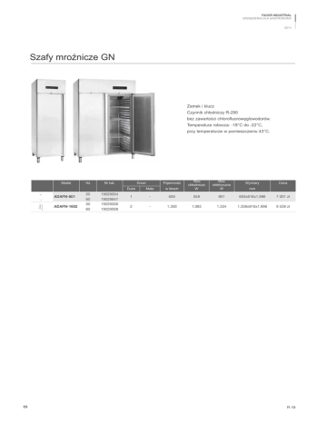 FAGOR INDUSTRIAL URZĄDZENIA DLA GASTRONOMII 2014 Szafy mroźnicze GN Zamek i klucz Czynnik chłodniczy R-290 bez zawartości chlorofluorowęglowodorów. Temperatura robocza: -18°C do -22°C, przy temperaturze w pomieszczeniu 43°C. Model ADAFN-801 ADAFN-1602 ES Hz 50 60 50 60 Duże Małe w litrach Moc chłodnicza W 1 - 600 558 901 693x816x1.996 7 001 zł 2 - 1.300 1.085 1.334 1.358x816x1.996 9 559 zł Drzwi Nr kat. 19029004 19029647 19029006 19029008 Pojemność Moc elektryczna W Wymiary Cena mm R-19 FAGOR INDUSTRIAL URZĄDZENIA DLA GASTRONOMII 2014 Szafy mroźnicze GN Czynnik chłodniczy R-404 A bez zawartości chlorofluorowęglowodorów. Temperatura robocza: -18°C do -22°C, przy temperaturze w pomieszczeniu 38°C. Klasa klimatyczna 5. Model CPAFN-801 CPAFN-802 CPAFN-1602 CPAFN-1603 CPAFN-1604 Hz 50 60 50 60 50 60 50 60 50 60 Duże Małe w litrach Moc chłodnicza W 1 - 600 558 901 653x796x1.996 6 710 zł - 2 600 558 901 653x796x1.996 7 237 zł 2 - 1.300 1.085 1.334 1.318x796x1.996 9 161 zł 1 2 1.300 1.085 1.334 1.318x796x1.996 9 435 zł - 4 1.300 1.085 1.334 1.318x796x1.996 9 718 zł Drzwi Nr kat. 19027308 19028995 19027309 19028997 19027320 19028998 19027321 19028999 19027322 19029000 Pojemność Moc elektryczna W Wymiary Cena mm Szafa mieszana GN: chłodzenie + zamrażanie Dwa niezależne komory z grupami i sterowaniem elektronicznym. Komora chłodnicza: Czynnik chłodniczy R-134A bez zawartości chlorofluorowęglowodorów. Wymuszony obieg powietrza. Temperatura pracy: -2°C do +8°C, w temperaturze w pomieszczeniu 38°C. Model CPAF-1602-MIX ES Hz 50 60 Duże Małe w litrach Moc chłodnicza W 1 1 600+600 275+558 Drzwi Nr kat. 19027323 19029805 Komora mroźnicza: Czynnik chłodniczy R-404A bez zawartości chlorofluorowęglowodorów. Wymuszony obieg powietrza. Temperatura pracy: -18°C do -22°C, przy temperaturze w pomieszczeniu 38°C. Pojemność Moc elektryczna W 1.312 Wymiary Cena mm 1.318x796x1.996 11 155 zł R-23 Chłodnictwo | Szafy Szafy | Stoły | Szybkoschładzarko-zamrażarki | Pozostałe produkty Seria Gastronorm szaf mroźniczych Wymuszony obieg powietrza. Czynnik chłodniczy R-404 A bez zawartości chlorofluorowęglowodorów. Temperatura pracy: -18°C do -22°C, przy temperaturze w pomieszczeniu 38°C. Elektroniczna regulacja temperatury i rozmrażania. Podświetlany wyłącznik główny. Model CAFN-801 CAFN-802 CAFN-1602 CAFN-1603 CAFN-1604 Hz 50 60 50 60 50 60 50 60 50 60 Drzwi Kod 19029744 19029745 19029746 19029747 19029748 19029749 19029750 19029751 19029752 19029753 Pojemność w litrach Moc chłodzenia chłodzenia W Moc elektryczna Wymiary W mm Cena Duże Małe 1 - 700 438 690 693x826x2.008 5 834 zł - 2 700 438 690 693x826x2.008 6 293 zł 2 - 1.400 1.000 1.012 1.388x826x2.008 7 966 zł 1 2 1.400 1.000 1.012 1.388x826x2.008 8 425 zł - 4 1.400 1.000 1.012 1.388x826x2.008 8 884 zł Seria szaf mieszanych Gastronorm (chłodzenie + zamrażanie) Dwie niezależne komory z oddzielnymi kompresorami, parownikami i sterowaniem elektronicznym. Komora chłodnicza: Czynnik chłodniczy R-134a bez zawartości chlorofluorowęglowodorów.. Wymuszony obieg powietrza. Temperatura pracy: -2°C do +8°C, przy temperaturze w pomieszczeniu 38°C. Komora mroźna: Czynnik chłodniczy R-404 A bez zawartości chlorofluorowęglowodorów. Wymuszony obieg powietrza. Temperatura pracy: -18°C to -22°C, przy temperaturze w pomieszczeniu 38°C. Model CAF-1602 MIX R-28 Hz 50 60 Drzwi Kod 19029771 19029772 Pojemność Moc chłodzenia Moc elektryczna Wymiary Duże Małe w litrach W W mm 1 1 700+700 300+438 1.058 1.388x826x2.008 Cena 9 700 zł FAGOR INDUSTRIAL URZĄDZENIA DLA GASTRONOMII 2014 Szafy mroźne Snack Wymuszony obieg powietrza. Czynnik chłodniczy R-404 A. Bez zawartości chlorofluorowtglowodorów. Temperatura pracy: -18°C do -22°C, przy temperaturze w pomieszczeniu 38°C. Elektroniczna regulacja temperatury i rozmrażania z wyświetlaczem. Podświetlany wyłącznik główny. Agregat na dole urządzenia. Model CAFN-701 CAFN-702 CAFN-1402 CAFN-1403 CAFN-1404 Hz 50 60 50 60 50 60 50 60 50 60 Drzwi Kod Pojemność w litrach Moc chłodnicza Moc elektryczna W W Wymiary Cena mm Duże Małe 1 - 600 438 690 693x726x2.067 5 732 zł - 2 600 438 690 693x726x2.067 6 191 zł 2 - 1.200 1.085 1.012 1.388x726x2.067 7 864 zł 1 2 1.200 1.085 1.012 1.388x726x2.067 8 323 zł - 4 1.200 1.085 1.012 1.388x726x2.067 8 782 zł 19029686 19029687 19029688 19029689 19029690 19029691 19029692 19029693 19029695 19029696 Szafy mieszane Snack (chłodzenie + zamrażanie) Dwie niezależne komory z oddzielnymi kompresorami, parownikami i sterowaniem elektronicznym. Komora chłodnicza: Czynnik chłodniczy R-134a bez zawartości chlorofluorowęglowodorów. Wymuszony obieg powietrza. Temperatura pracy: -2°C do +8°C, przy temperaturze w pomieszczeniu 38°C. Komora mroźna: Czynnik chłodniczy R-404A bez zawartości chlorofluorowęglowodorów. Wymuszony obieg powietrza. Temperatura pracy: -18°C do -22°C, przy temperaturze w pomieszczeniu 38°C. Model CAF-1402 MIX ES Hz 50 60 Drzwi Kod 19029721 19029722 Pojemność Moc chłodnicza Moc elektryczna Wymiary Duże Małe w litrach W W mm 1 1 600+600 300+438 1.058 1.388x726x2.067 Cena 9 598 zł R-31