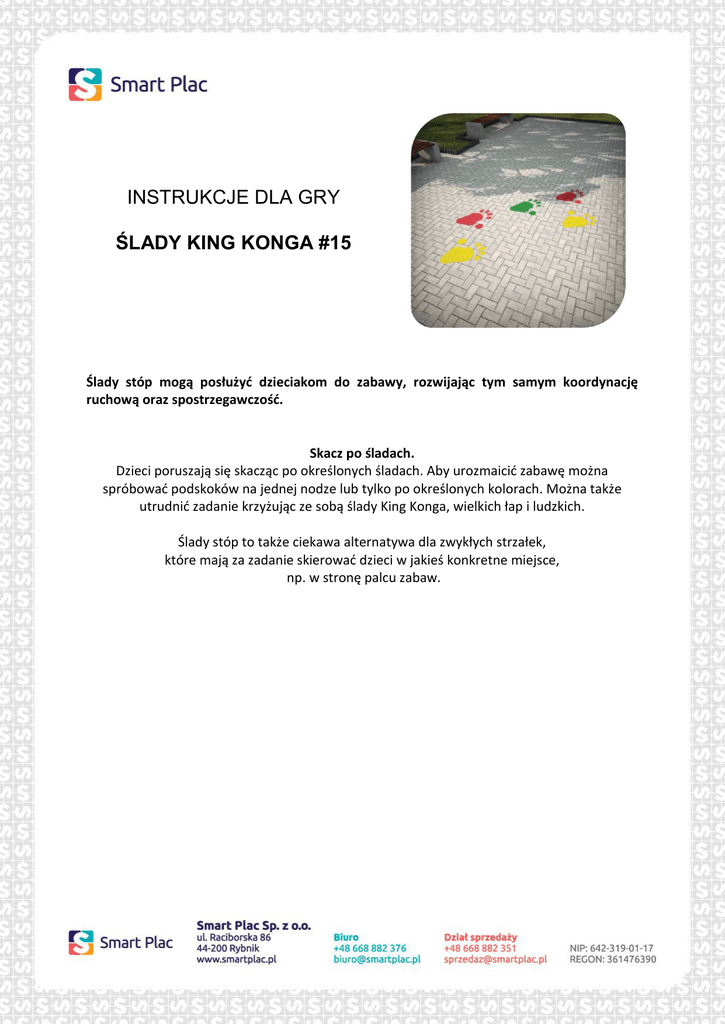 INSTRUKCJE DLA GRY ŚLADY KING KONGA #15 Ślady stóp mogą posłużyd dzieciakom do zabawy, rozwijając tym samym koordynację ruchową oraz spostrzegawczośd. Skacz po śladach. Dzieci poruszają się skacząc po określonych śladach. Aby urozmaicid zabawę można spróbowad podskoków na jednej nodze lub tylko po określonych kolorach. Można także utrudnid zadanie krzyżując ze sobą ślady King Konga, wielkich łap i ludzkich. Ślady stóp to także ciekawa alternatywa dla zwykłych strzałek, które mają za zadanie skierowad dzieci w jakieś konkretne miejsce, np. w stronę palcu zabaw.