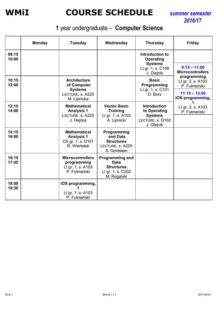 WMiI COURSE SCHEDULE summer semester 2016/17 1 year undergraduate – Computer Science Monday Tuesday Wednesday 08:15 10:00 10:15 12:00 Introduction to Operating Systems LI gr. 1, s. C109 J. Olejnik Architecture of Computer Systems LECTURE, s. A225 M. Lipnicka Basic Programming LI gr. 1, s. C101 D. Bors 12:15 14:00 Mathematical Analysis 1 LECTURE, s. A225 J. Hejduk Vector Basic Training LI gr. 1, s. A103 A. Lipnicki 14:15 16:00 Mathematical Analysis 1 CK gr. 1, s. D101 R. Wiertelak Programming and Data Structures LECTURE, s. A225 S. Goldstein 16:15 17:45 Microcontrollers programming LI gr. 1, s. A103 P. Fulmański Programming and Data Structures LI gr. 1, s. C202 M. Rogalski 18:00 19:30 iOS programming, 1 LI gr. 1, s. A103 P. Fulmański DLIa-1 Thursday Strona 1 z 1 Introduction to Operating Systems LECTURE, s. D102 J. Olejnik Friday 9:15 – 11:00 Microcontrollers programming LI gr. 2, s. A103 P. Fulmański 11:15 – 13:00 iOS programming, 1 LI gr. 2, s. A103 P. Fulmański 2017-03-01
