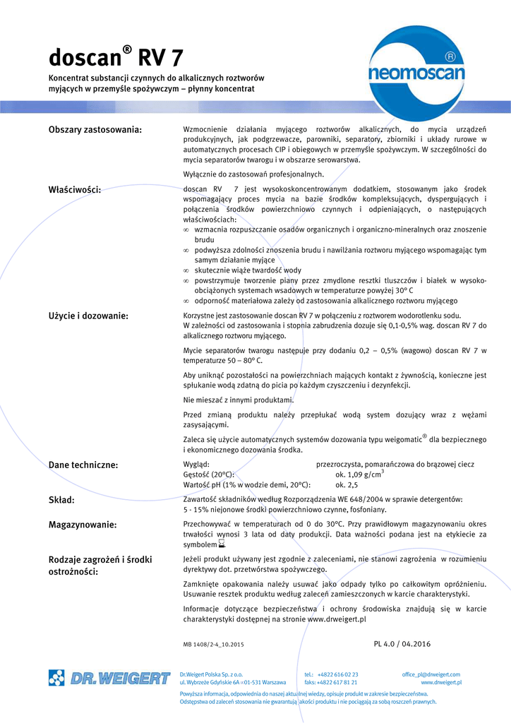 ® doscan RV 7 Koncentrat substancji czynnych do alkalicznych roztworów myjących w przemyśle spożywczym – płynny koncentrat Obszary zastosowania: Wzmocnienie działania myjącego roztworów alkalicznych, do mycia urządzeń produkcyjnych, jak podgrzewacze, parowniki, separatory, zbiorniki i układy rurowe w automatycznych procesach CIP i obiegowych w przemyśle spożywczym. W szczególności do mycia separatorów twarogu i w obszarze serowarstwa. Wyłącznie do zastosowań profesjonalnych. Właściwości: doscan RV 7 jest wysokoskoncentrowanym dodatkiem, stosowanym jako środek wspomagający proces mycia na bazie środków kompleksujących, dyspergujących i połączenia środków powierzchniowo czynnych i odpieniających, o następujących właściwościach: • wzmacnia rozpuszczanie osadów organicznych i organiczno-mineralnych oraz znoszenie brudu • podwyższa zdolności znoszenia brudu i nawilżania roztworu myjącego wspomagając tym samym działanie myjące • skutecznie wiąże twardość wody • powstrzymuje tworzenie piany przez zmydlone resztki tluszczów i białek w wysokoobciążonych systemach wsadowych w temperaturze powyżej 30° C • odporność materiałowa zależy od zastosowania alkalicznego roztworu myjącego Użycie i dozowanie: Korzystne jest zastosowanie doscan RV 7 w połączeniu z roztworem wodorotlenku sodu. W zależności od zastosowania i stopnia zabrudzenia dozuje się 0,1-0,5% wag. doscan RV 7 do alkalicznego roztworu myjącego. Mycie separatorów twarogu następuje przy dodaniu 0,2 – 0,5% (wagowo) doscan RV 7 w temperaturze 50 – 80° C. Aby uniknąć pozostałości na powierzchniach mających kontakt z żywnością, konieczne jest spłukanie wodą zdatną do picia po każdym czyszczeniu i dezynfekcji. Nie mieszać z innymi produktami. Przed zmianą produktu należy przepłukać wodą system dozujący wraz z wężami zasysającymi. ® Zaleca się użycie automatycznych systemów dozowania typu weigomatic dla bezpiecznego i ekonomicznego dozowania środka. Dane techniczne: Wygląd: przezroczysta, pomarańczowa do brązowej ciecz 3 Gęstość (20°C): ok. 1,09 g/cm Wartość pH (1% w wodzie demi, 20°C): ok. 2,5 Skład: Zawartość składników według Rozporządzenia WE 648/2004 w sprawie detergentów: 5 - 15% niejonowe środki powierzchniowo czynne, fosfoniany. Magazynowanie: Przechowywać w temperaturach od 0 do 30°C. Przy prawidłowym magazynowaniu okres trwałości wynosi 3 lata od daty produkcji. Data ważności podana jest na etykiecie za symbolem . Rodzaje zagrożeń i środki ostrożności: Jeżeli produkt używany jest zgodnie z zaleceniami, nie stanowi zagrożenia w rozumieniu dyrektywy dot. przetwórstwa spożywczego. Zamknięte opakowania należy usuwać jako odpady tylko po całkowitym opróżnieniu. Usuwanie resztek produktu według zaleceń zamieszczonych w karcie charakterystyki. Informacje dotyczące bezpieczeństwa i ochrony środowiska znajdują się w karcie charakterystyki dostępnej na stronie www.drweigert.pl PL 4.0 / 04.2016 MB 1408/2-4_10.2015 Dr.Weigert Polska Sp. z o.o. ul. Wybrzeże Gdyńskie 6A • 01-531 Warszawa tel.: +4822 616 02 23 faks: +4822 617 81 21 [email protected] www.drweigert.pl Powyższa informacja, odpowiednia do naszej aktualnej wiedzy, opisuje produkt w zakresie bezpieczeństwa. Odstępstwa od zaleceń stosowania nie gwarantują jakości produktu i nie pociągają za sobą roszczeń prawnych.