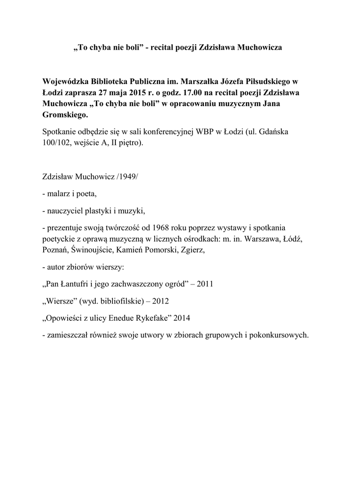 „To chyba nie boli” - recital poezji Zdzisława Muchowicza Wojewódzka Biblioteka Publiczna im. Marszałka Józefa Piłsudskiego w Łodzi zaprasza 27 maja 2015 r. o godz. 17.00 na recital poezji Zdzisława Muchowicza „To chyba nie boli” w opracowaniu muzycznym Jana Gromskiego. Spotkanie odbędzie się w sali konferencyjnej WBP w Łodzi (ul. Gdańska 100/102, wejście A, II piętro). Zdzisław Muchowicz /1949/ - malarz i poeta, - nauczyciel plastyki i muzyki, - prezentuje swoją twórczość od 1968 roku poprzez wystawy i spotkania poetyckie z oprawą muzyczną w licznych ośrodkach: m. in. Warszawa, Łódź, Poznań, Świnoujście, Kamień Pomorski, Zgierz, - autor zbiorów wierszy: „Pan Łantufri i jego zachwaszczony ogród” – 2011 „Wiersze” (wyd. bibliofilskie) – 2012 „Opowieści z ulicy Enedue Rykefake” 2014 - zamieszczał również swoje utwory w zbiorach grupowych i pokonkursowych.