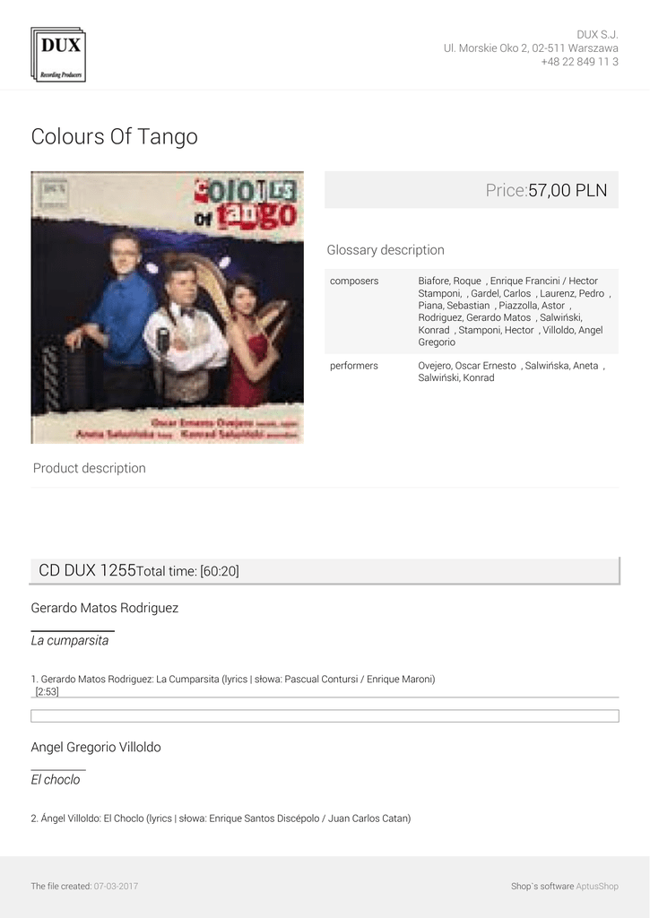 DUX S.J. Ul. Morskie Oko 2, 02-511 Warszawa +48 22 849 11 3 Colours Of Tango Price:57,00 PLN Glossary description composers Biafore, Roque ∎, Enrique Francini / Hector Stamponi, ∎, Gardel, Carlos ∎, Laurenz, Pedro ∎, Piana, Sebastian ∎, Piazzolla, Astor ∎, Rodriguez, Gerardo Matos ∎, Salwiński, Konrad ∎, Stamponi, Hector ∎, Villoldo, Angel Gregorio ∎ performers Ovejero, Oscar Ernesto ∎, Salwińska, Aneta ∎, Salwiński, Konrad ∎ Product description CD DUX 1255Total time: [60:20] Gerardo Matos Rodriguez La cumparsita 1. Gerardo Matos Rodriguez: La Cumparsita (lyrics | słowa: Pascual Contursi / Enrique Maroni) [2:53] Angel Gregorio Villoldo El choclo 2. Ángel Villoldo: El Choclo (lyrics | słowa: Enrique Santos Discépolo / Juan Carlos Catan) The file created: 07-03-2017 Shop`s software AptusShop DUX S.J. Ul. Morskie Oko 2, 02-511 Warszawa +48 22 849 11 3 [4:09] Astor Piazzolla Balada para un loco 3. Astor Piazzolla: Balada para un loco (lyrics | słowa: Horacio Ferrer) [5:12] Pedro Laurenz Milonga de mis amores 4. Pedro Laurenz: Milonga de mis amores [3:31] Enrique Francini / Hector Stamponi Pedacito de cielo 5. Enrique Francini / Hector Stamponi: Pedacito de cielo (lyrics | słowa: Hombro Exposito) [3:49] Astor Piazzolla Chiquilin de Bachin 6. Astor Piazzolla: Chiquilin de Bachin (lyrics | słowa: Horacio Ferrer) [3:49] Astor Piazzolla S’il vous plaît 7. Astor Piazzolla: S’il vous plaît [3:06] The file created: 07-03-2017 Shop`s software AptusShop DUX S.J. Ul. Morskie Oko 2, 02-511 Warszawa +48 22 849 11 3 Carlos Gardel Por una cabeza 8. Carlos Gardel: Por una cabeza (lyrics | słowa: Alfredo Le Pera) [4:03] Konrad Salwiński Estrella de medianoche 9. Konrad Salwiński: Estrella de medianoche (lyrics | słowa: Oscar Ovejero) [6:08] Roque Biafore El Flore 10. Roque Biafore: El Floreo [2:42] Hector Stamponi Flor de lino 11. Hector Stamponi: Flor de lino (lyrics | słowa: Homero Exposito) [3:22] Astor Piazzolla Oblivion 12. Astor Piazzolla: Oblivion [4:51] Carlos Gardel The file created: 07-03-2017 Shop`s software AptusShop DUX S.J. Ul. Morskie Oko 2, 02-511 Warszawa +48 22 849 11 3 El dia que me quieras 13. Carlos Gardel: El dia que me quieras (lyrics | słowa: Alfredo Le Pera) [4:35] Astor Piazzolla Libertango 14. Astor Piazzolla: Libertango [4:08] Sebastian Piana Milonga Sentimenta 15. Sebastian Piana: Milonga Sentimental (lyrics | słowa: Homero Manzi) [3:00] Performers: Oscar Ernesto Ovejero /vocal/ Aneta Salwińska /harp/ Konrad Salwiński /accordion/ The file created: 07-03-2017 Powered by TCPDF (www.tcpdf.org) Shop`s software AptusShop