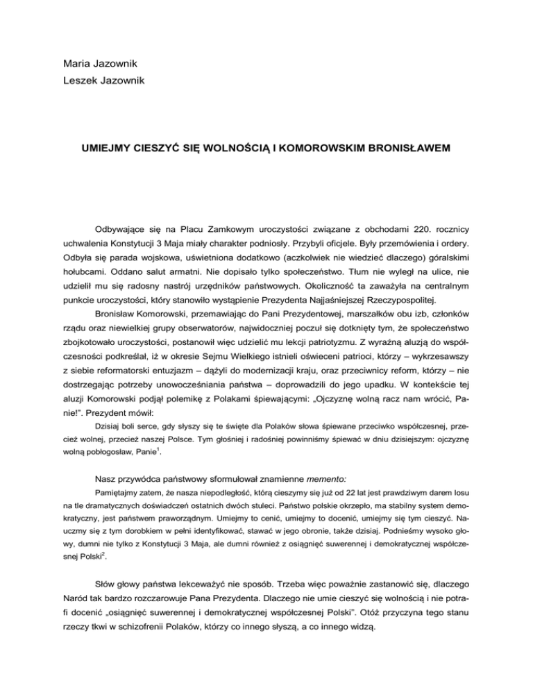 Maria Jazownik Leszek Jazownik UMIEJMY CIESZYĆ SIĘ WOLNOŚCIĄ I KOMOROWSKIM BRONISŁAWEM Odbywające się na Placu Zamkowym uroczystości związane z obchodami 220. rocznicy uchwalenia Konstytucji 3 Maja miały charakter podniosły. Przybyli oficjele. Były przemówienia i ordery. Odbyła się parada wojskowa, uświetniona dodatkowo (aczkolwiek nie wiedzieć dlaczego) góralskimi hołubcami. Oddano salut armatni. Nie dopisało tylko społeczeństwo. Tłum nie wyległ na ulice, nie udzielił mu się radosny nastrój urzędników państwowych. Okoliczność ta zaważyła na centralnym punkcie uroczystości, który stanowiło wystąpienie Prezydenta Najjaśniejszej Rzeczypospolitej. Bronisław Komorowski, przemawiając do Pani Prezydentowej, marszałków obu izb, członków rządu oraz niewielkiej grupy obserwatorów, najwidoczniej poczuł się dotknięty tym, że społeczeństwo zbojkotowało uroczystości, postanowił więc udzielić mu lekcji patriotyzmu. Z wyraźną aluzją do współczesności podkreślał, iż w okresie Sejmu Wielkiego istnieli oświeceni patrioci, którzy – wykrzesawszy z siebie reformatorski entuzjazm – dążyli do modernizacji kraju, oraz przeciwnicy reform, którzy – nie dostrzegając potrzeby unowocześniania państwa – doprowadzili do jego upadku. W kontekście tej aluzji Komorowski podjął polemikę z Polakami śpiewającymi: „Ojczyznę wolną racz nam wrócić, Panie!”. Prezydent mówił: Dzisiaj boli serce, gdy słyszy się te święte dla Polaków słowa śpiewane przeciwko współczesnej, przecież wolnej, przecież naszej Polsce. Tym głośniej i radośniej powinniśmy śpiewać w dniu dzisiejszym: ojczyznę wolną pobłogosław, Panie1. Nasz przywódca państwowy sformułował znamienne memento: Pamiętajmy zatem, że nasza niepodległość, którą cieszymy się już od 22 lat jest prawdziwym darem losu na tle dramatycznych doświadczeń ostatnich dwóch stuleci. Państwo polskie okrzepło, ma stabilny system demokratyczny, jest państwem praworządnym. Umiejmy to cenić, umiejmy to docenić, umiejmy się tym cieszyć. Nauczmy się z tym dorobkiem w pełni identyfikować, stawać w jego obronie, także dzisiaj. Podnieśmy wysoko głowy, dumni nie tylko z Konstytucji 3 Maja, ale dumni również z osiągnięć suwerennej i demokratycznej współczesnej Polski2. Słów głowy państwa lekceważyć nie sposób. Trzeba więc poważnie zastanowić się, dlaczego Naród tak bardzo rozczarowuje Pana Prezydenta. Dlaczego nie umie cieszyć się wolnością i nie potrafi docenić „osiągnięć suwerennej i demokratycznej współczesnej Polski”. Otóż przyczyna tego stanu rzeczy tkwi w schizofrenii Polaków, którzy co innego słyszą, a co innego widzą. Słyszą Polacy od Pana Prezydenta, że mają napawać się sukcesami Rzeczypospolitej, ale przecierają oczy ze zdumienia i stawiają pytanie: Gdzież one są?! Czy sukces stanowi złodziejska prywatyzacja, w której wyniku w ciągu nieco ponad dwudziestu lat społeczeństwo polskie zostało niemal całkowicie wydziedziczone? Czy sukcesem jest likwidacja większości zakładów przemysłowych i przejęcie za bezcen ich majątków przez obcy kapitał? Czy może sukces polega na tym, że z ulic polskich miast znikają sklepy i warsztaty usługowe, a jak grzyby po deszczu wyrastają banki i dyskonty pożyczkowe, zapowiadające, że w krótkim czasie zaczniemy przypominać te kraje Ameryki Południowej, w których poszczególni obywatele, tworząc wielką armię bezrobotnych, mają po kilka kart kredytowych? Czy może sukces polega na doprowadzeniu do ruiny polskiego rolnictwa i uruchomieniu programu masowego rozdawnictwa polskiej ziemi? A może sukcesem jest bliski załamania system emerytalny? Może powinniśmy się cieszyć tym, iż mimo pozbycia się majątku narodowego, stoimy w obliczu błyskawicznie narastającego długu zewnętrznego i wewnętrznego? A może euforię powinno wzbudzać to, że – jak wskazują statystyki – ok. 60% polskich rodzin osiąga dochody poniżej minimum socjalnego, że jedna czwarta Polaków żyje na skraju ubóstwa i że co ósme polskie dziecko jest niedożywione? Czy może wreszcie powinniśmy radować się historyczną szansą poszukiwania pracy w krajach Europy Zachodniej i występującą na niespotykaną dotychczas skalę emigracją zarobkową? Społeczeństwo doskonale zdaje sobie sprawę, że kraj nasz przeszedł potężną transformację: w okresie PRL-u mieliśmy Naród w kraju, a rząd na uchodźstwie, dziś całkowicie odwrotnie – rząd mamy w kraju, a Naród na uchodźstwie. Polacy nie potrafią się taką transformacją cieszyć, bo wcale nie o nią im chodziło wówczas, gdy skupiali się pod sztandarami „Solidarności”. Każe się Pan Prezydent radować odzyskaną niepodległością. Dziwnym trafem zakres niezależności naszego kraju wcale nie budzi euforii Polaków. Unia Europejska miała stanowić federację suwerennych państw, zachowujących autonomię i kultywujących rodzime tradycje. Stała się jednak eurokołchozem zarządzanym przez absurdalnie rozrosłą armię urzędników, którzy – pobierając olbrzymie honoraria – doprowadzają do biurokratyzacji i uniformizacji każdego odcinka życia społecznego. Co więcej, intensywnie dążą do osłabiania państw narodowych, przy jednoczesnym pielęgnowaniu separatyzmów lokalnych. Urzeczywistniają w ten sposób – wyrastający z idei społecznych Róży Luksemburg – program hodowli unijnych bezpaństwowców, odczuwających raczej więzi kastowe niż narodowe. Oczywiście destrukcja państwa umożliwia swobodne przejmowanie majątku narodowego przez obcy kapitał, nadto zaś sprawia, że struktury państwowe ograniczają się wyłącznie do zapewniania bezpieczeństwa zewnętrznego i wewnętrznego, wyrzekają się natomiast funkcji socjalnych, przez co obywatele skazani zostają na samotne zmagania się ze świetnie zorganizowanym światem międzynarodowych korporacji. Tymczas