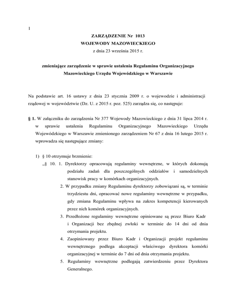 1 ZARZĄDZENIE Nr 1013 WOJEWODY MAZOWIECKIEGO z dnia 23 września 2015 r. zmieniające zarządzenie w sprawie ustalenia Regulaminu Organizacyjnego Mazowieckiego Urzędu Wojewódzkiego w Warszawie Na podstawie art. 16 ustawy z dnia 23 stycznia 2009 r. o wojewodzie i administracji rządowej w województwie (Dz. U. z 2015 r. poz. 525) zarządza się, co następuje: § 1. W załączniku do zarządzenia Nr 377 Wojewody Mazowieckiego z dnia 31 lipca 2014 r. w sprawie ustalenia Regulaminu Organizacyjnego Mazowieckiego Urzędu Wojewódzkiego w Warszawie zmienionego zarządzeniem Nr 67 z dnia 16 lutego 2015 r. wprowadza się następujące zmiany: 1) § 10 otrzymuje brzmienie: „§ 10. 1. Dyrektorzy opracowują regulaminy wewnętrzne, w których dokonują podziału zadań dla poszczególnych oddziałów i samodzielnych stanowisk pracy w komórkach organizacyjnych. 2. W przypadku zmiany Regulaminu dyrektorzy zobowiązani są, w terminie trzydziestu dni, opracować nowe regulaminy wewnętrzne w przypadku, gdy zmiana Regulaminu wpływa na zakres kompetencji kierowanych przez nich komórek organizacyjnych. 3. Przedłożone regulaminy wewnętrzne opiniowane są przez Biuro Kadr i Organizacji bez zbędnej zwłoki w terminie do 14 dni od dnia otrzymania projektu. 4. Zaopiniowany przez Biuro Kadr i Organizacji projekt regulaminu wewnętrznego podlega akceptacji właściwego dyrektora komórki organizacyjnej w terminie do 7 dni od dnia otrzymania projektu. 5. Regulaminy wewnętrzne podlegają zatwierdzeniu przez Dyrektora Generalnego. 6. Dyrektorzy nadzorują sporządzanie lub aktualizację opisów stanowisk pracy oraz ustalanie na piśmie lub aktualizację zakresów czynności pracowników.”; 2) w § 16 w ust. 1: a) po pkt 12 kropkę zastępuje się średnikiem i dodaje się pkt 13 i 14 w brzmieniu: „13) realizacja zadań Wojewody dotyczących przeprowadzenia i organizacji naboru na członków Komisji Dyscyplinarnej dla Nauczycieli przy Wojewodzie Mazowieckim; 14) koordynowanie realizacji zadań Wojewody w zakresie prowadzonych postępowań dyscyplinarnych nauczycieli.”, b) uchyla się pkt 8; 3) w § 20 w pkt 13 po lit. c średnik zastępuje się przecinkiem i dodaje się lit. d i e w brzmieniu: „d) zamieszczanie na stronie internetowej Urzędu - w Biuletynie Informacji Publicznej - skanu wpływających petycji oraz pozostałych ustawowo wymaganych danych i aktualizacja informacji o przebiegu postępowania w sprawie petycji, e) sporządzanie corocznych informacji zbiorczych o petycjach rozpatrzonych w roku poprzednim oraz ich publikacja w Biuletynie Informacji Publicznej urzędu;”; 4) w § 21 w ust. 2: a) pkt 3 otrzymuje brzmienie: „3) Oddział Rozstrzygnięć Finansowych, Kontroli i Systemu….....FCR-III;”, b) pkt 5 otrzymuje brzmienie: „5) Oddział Certyfikacji i Funduszy Europejskich ………………..FCR-V;”, c) uchyla się pkt 6 i 7, d) uchyla się pkt 11; 5) w § 23: a) ust. 1 otrzymuje brzmienie: „1. Wydziałem Geodezji kieruje dyrektor przy pomocy zastępcy.”, b) ust. 3 otrzymuje brzmienie: „3. W skład Wydziału Geodezji wchodzą następujące komórki organizacyjne, posługujące się przy znakowaniu prowadzonych spraw i akt symbolami: 1) Oddział Nadzoru Geodezyjnego ……………….…….….WG-I; 2) Oddział Analiz i Budżetu ……………………..................WG-II; 3) Oddział Katastru ……………………………….….……..WG-III; 4) Oddział Kontroli …… ……………………………..….…WG-IV; 5) Samodzielne Stanowisko do spraw Ogólnych ………...…WG-V.”; 6) w § 26 w pkt 1 w lit. c po tiret 16 średnik zastępuje się przecinkiem i dodaje się tiret siedemnaste w brzmieniu: „- strategicznej inwestycji w zakresie sieci przesyłowej;”; 7) § 27 otrzymuje brzmienie: „§ 27. 1. Wydziałem Skarbu Państwa i Nieruchomości kieruje dyrektor przy pomocy zastępcy. 2. W skład Wydziału Skarbu Państwa i Nieruchomości wchodzą następujące komórki organizacyjne, posługujące się przy znakowaniu prowadzonych spraw i akt symbolami: 1) Oddział Przedsiębiorstw Państwowych ..............................SPN-I; 2) Oddział Uwłaszczeń ……………………...…....….……....SPN-II; 3) Oddział Nieruchomości Drogowych….………...................SPN-III; 4) Oddział Gospodarki Nieruchomościami Skarbu Państwa...SPN-IV; 5) Oddział Zwrotu Nieruchomości i Odszkodowań ...............SPN-V; 6) Oddział Komunalizacji ………………………………..….SPN-VI; 7) Oddział Ogólny...............................................................….SPN-VII; 8) Oddział Rekompensat ……………………………..……...SPN-VIII; 9) Samodzielne Stanowisko do spraw Dotacji.........................SPN-IX; 10) Samodzielne Stanowiska do spraw Analiz Operatów Szacunkowych......................................................................SPN-X; 11) Samodzielne Stanowisko do spraw Rewindykacji …….….SPN-XI; 12) Oddziały Skarbu Państwa i Nieruchomości w delegaturach, posługujące się symbolami określonymi w § 51 ust. 5.”; 8) w § 28: a) w pkt 7 lit. k otrzymuje brzmienie: „k) rozstrzyganie, jako organ II instancji oraz jako organ wyższego stopnia, w sprawach z zakresu gospodarowania nieruchomościami Skarbu Państwa pozostającymi w użytkowaniu, zarządzie i użytkowaniu wieczystym państwowych osób prawnych lub trwałym zarządzie państwowych jednostek organizacyjnych;”, b) po pkt 40 kropkę zastępuje się średnikiem i dodaje się pkt 41 - 43 w brzmieniu: „41) prowadzenie postępowań administracyjnych w sprawach ustanowienia trwałego zarządu na rzecz zakładającego lotnisko użytku publicznego oraz zarządzającego lotniskiem w trybie przepisów o szczególnych zasadach przygotowania i realizacji inwestycji w zakresie lotnisk użytku publicznego; 42) rozpatrywanie odwołań od decyzji starosty o nadaniu nieruchomości przez Państwo; 43) analiza rocznych sprawozdań starostów z g