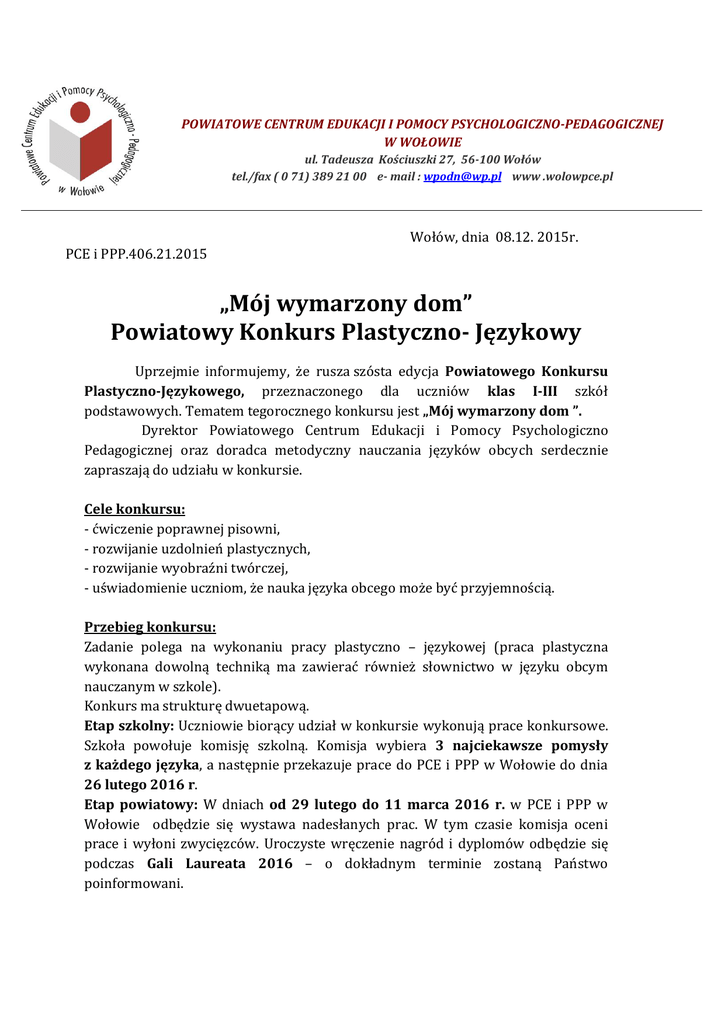 POWIATOWE CENTRUM EDUKACJI I POMOCY PSYCHOLOGICZNO-PEDAGOGICZNEJ W WOŁOWIE ul. Tadeusza Kościuszki 27, 56-100 Wołów tel./fax ( 0 71) 389 21 00 e- mail : [email protected] www .wolowpce.pl Wołów, dnia 08.12. 2015r. PCE i PPP.406.21.2015 „Mój wymarzony dom” Powiatowy Konkurs Plastyczno- Językowy Uprzejmie informujemy, że rusza szósta edycja Powiatowego Konkursu Plastyczno-Językowego, przeznaczonego dla uczniów klas I-III szkół podstawowych. Tematem tegorocznego konkursu jest „Mój wymarzony dom ”. Dyrektor Powiatowego Centrum Edukacji i Pomocy Psychologiczno Pedagogicznej oraz doradca metodyczny nauczania języków obcych serdecznie zapraszają do udziału w konkursie. Cele konkursu: - ćwiczenie poprawnej pisowni, - rozwijanie uzdolnień plastycznych, - rozwijanie wyobraźni twórczej, - uświadomienie uczniom, że nauka języka obcego może być przyjemnością. Przebieg konkursu: Zadanie polega na wykonaniu pracy plastyczno – językowej (praca plastyczna wykonana dowolną techniką ma zawierać również słownictwo w języku obcym nauczanym w szkole). Konkurs ma strukturę dwuetapową. Etap szkolny: Uczniowie biorący udział w konkursie wykonują prace konkursowe. Szkoła powołuje komisję szkolną. Komisja wybiera 3 najciekawsze pomysły z każdego języka, a następnie przekazuje prace do PCE i PPP w Wołowie do dnia 26 lutego 2016 r. Etap powiatowy: W dniach od 29 lutego do 11 marca 2016 r. w PCE i PPP w Wołowie odbędzie się wystawa nadesłanych prac. W tym czasie komisja oceni prace i wyłoni zwycięzców. Uroczyste wręczenie nagród i dyplomów odbędzie się podczas Gali Laureata 2016 – o dokładnym terminie zostaną Państwo poinformowani. Wymagania: -samodzielność wykonania, - estetyka wykonania, - bezbłędny zapis i poprawność językowa, - dobór oryginalnych technik artystycznych, - format A4, Na odwrocie każdej pracy powinny znajdować się dokładne dane: imię i nazwisko uczestnika, nazwa szkoły, klasa, nazwisko uczącego nauczyciela. Bez tych danych praca nie bierze udziału w konkursie. Udział w konkursie jest jednoznaczny z wyrażeniem zgody na przetwarzanie danych osobowych oraz udostępnianie wizerunku przez PCEiPPP w Wołowie do celów informacyjnych i promocyjnych. Osoba odpowiedzialna: mgr Ewa Nowak – doradca metodyczny nauczania języków obcych Pytania związane z organizacją konkursu prosimy kierować do: P. Ewy Nowak – doradca metodyczny 696– 018 – 736, mail: [email protected] Serdecznie zapraszamy do udziału w konkursie. Z poważaniem Doradca metodyczny mgr Ewa Nowak DYREKTOR mgr Krystyna Adaśko