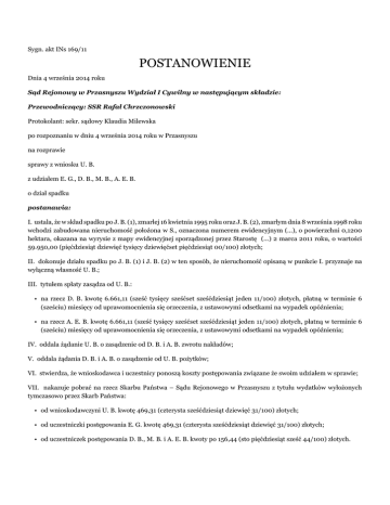 Sygn. akt INs 169/11 POSTANOWIENIE Dnia 4 września 2014 roku Sąd Rejonowy w Przasnyszu Wydział I Cywilny w następującym składzie: Przewodniczący: SSR Rafał Chrzczonowski Protokolant: sekr. sądowy Klaudia Milewska po rozpoznaniu w dniu 4 września 2014 roku w Przasnyszu na rozprawie sprawy z wniosku U. B. z udziałem E. G., D. B., M. B., A. E. B. o dział spadku postanawia: I. ustala, że w skład spadku po J. B. (1), zmarłej 16 kwietnia 1995 roku oraz J. B. (2), zmarłym dnia 8 września 1998 roku wchodzi zabudowana nieruchomość położona w S., oznaczona numerem ewidencyjnym (...), o powierzchni 0,1200 hektara, okazana na wyrysie z mapy ewidencyjnej sporządzonej przez Starostę (...) 2 marca 2011 roku, o wartości 59.950,00 (pięćdziesiąt dziewięć tysięcy dziewięćset pięćdziesiąt 00/100) złotych; II. dokonuje działu spadku po J. B. (1) i J. B. (2) w ten sposób, że nieruchomość opisaną w punkcie I. przyznaje na wyłączną własność U. B.; III. tytułem spłaty zasądza od U. B.: • na rzecz D. B. kwotę 6.661,11 (sześć tysięcy sześćset sześćdziesiąt jeden 11/100) złotych, płatną w terminie 6 (sześciu) miesięcy od uprawomocnienia się orzeczenia, z ustawowymi odsetkami na wypadek opóźnienia; • na rzecz A. E. B. kwotę 6.661,11 (sześć tysięcy sześćset sześćdziesiąt jeden 11/100) złotych, płatną w terminie 6 (sześciu) miesięcy od uprawomocnienia się orzeczenia, z ustawowymi odsetkami na wypadek opóźnienia; IV. oddala żądanie U. B. o zasądzenie od D. B. i A. B. zwrotu nakładów; V. oddala żądania D. B. i A. B. o zasądzenie od U. B. pożytków; VI. stwierdza, że wnioskodawca i uczestnicy ponoszą koszty postępowania związane że swoim udziałem w sprawie; VII. nakazuje pobrać na rzecz Skarbu Państwa – Sądu Rejonowego w Przasnyszu z tytułu wydatków wyłożonych tymczasowo przez Skarb Państwa: • od wnioskodawczyni U. B. kwotę 469,31 (czterysta sześćdziesiąt dziewięć 31/100) złotych; • od uczestniczki postępowania E. G. kwotę 469,31 (czterysta sześćdziesiąt dziewięć 31/100) złotych; • od uczestniczek postępowania D. B., M. B. i A. E. B. kwoty po 156,44 (sto pięćdziesiąt sześć 44/100) złotych. Sąd Okręgowy w Ostrołęce Wydział I Cywilny po rozpoznaniu na rozprawie w dniu 5 marca 2015 roku na skutek apelacji wnioskodawczyni od postanowienia Sądu Rejonowego w Przasnyszu z dnia 4 września 2014 roku, sygn. akt INs 169/11. postanawia: oddalić apelację. Sygn. akt I Ns 169/11 UZASADNIENIE U. B. wniosła o ustalenie, że w skład spadku po zmarłych 16.04.1995r. J. B. (1) i 8.09.1998r. J. B. (2) wchodzi nieruchomość o pow. 0,12 ha położona w S., zabudowana budynkiem mieszkalnym, budynkiem inwentarsko – składowym, szopą drewnianą i garażem drewnianym oraz o przyznanie tej nieruchomości na wyłączną własność wnioskodawczyni, ze stosownymi spłatami na rzecz uczestników. W uzasadnieniu wnioskodawczyni podnosiła, że w skład spadku po jej rodzicach wchodzi aktualnie jedynie nieruchomość opisana we wniosku – innymi składnikami spadku strony rozporządziły zgodnie. Wnioskodawczyni włada wskazaną nieruchomością, a w szczególności zamieszkuje w budynku mieszkalnym wraz z dziećmi. Rzeczoznawca wycenił nieruchomość na 69109 złotych. Wnioskodawczyni zapowiedziała, że będzie wnosić o zaliczenie jej nakładów na budynki, jakie poniosła w okresie po otwarciu spadku, a które były konieczne dla utrzymania budynków w stanie zdatnym do dalszego ich użytkowania, a nadto będzie wnosić o zaliczenie darowizn uczynionych przez J. B. (2) na rzecz E. G. i A. B. (1). Na rozprawie dnia 21 stycznia 2013r. wnioskodawczyni wniosła o zasądzenie na jej rzecz od D. B. i A. B. kwot po 3868,55 złotych tytułem zwrotu nakładów, obliczonych jako 1/9 kwoty 34817,21 złotych. Uczestniczka E. G. przyłączyła się do wniosku, nie kwestionując twierdzeń i wniosków wnioskodawczyni. Uczestniczka M. B. przyłączyła się do wniosku co do zasady, z tym, że nie zgodziła się na dokonywanie rozliczeń. Uczestniczka A. B. (2) przyłączyła się do wniosku, z tym, że nie zgadzała się, by spłata była pomniejszona o nakłady na budynek. Obie wskazane uczestniczki podniosły w piśmie z dnia 5 września 2011r., że dokonując nakładów wnioskodawczyni zdawała sobie sprawę, że jest jedynie jedną ze współwłaścicielek, przekraczając zakres zwykłego zarządu powinna uzyskać zgodę pozostałych współwłaścicieli – bez niej nakłady należy traktować jako dokonane w złej wierze. Mogą więc podlegać rozliczeniu wyłącznie w sytuacji, gdy były nakładami koniecznymi. Nadto podnosiły, że dokonując częściowego działu spadku (sprzedaż gruntów rolnych wchodzących w skład spadku), wnioskodawczyni zobowiązała się spłacić pozostałych spadkobierców stosownie do ich udziałów – w porozumieniu nie było mowy o rozliczeniu nakładów. Jednocześnie zgłosiły roszczenie o rozliczenie uzyskanych przez wnioskodawczynię pożytków ze spadku, polegających na nieodpłatnym korzystaniu przez nią z nieruchomości w okresie od otwarcia spadku do chwili obecnej. Uczestniczka D. B. przyłączyła się do stanowiska swoich córek. Następnie M. B. wycofała swoje roszczenie o rozliczenie pożytków. Ona oraz uczestniczka E. G. zrzekły się też spłat. Sąd Rejonowy ustalił następujący stan faktyczny: J. B. (1) i J. B. (2) byli małżeństwem. W skład ich majątku wspólnego wchodziła między innymi zabudowana nieruchomość położona w S. o powierzchni 0,1200 ha, oznaczona numerem ewidencyjnym (...). J. B. (1) zmarła 16 kwietnia 1995r. Spadek po niej nabyli mąż J. B. (2) i dzieci A. B. (1), E. G. i U. B. po ¼ części każde z nich. J. B. (2) zmarł 8 września 1998r. Spadek po nim nabyły dzieci: A. B. (1), E. G. i U. B. po 1/3 części każde z nich. A. B. (1) zmarł 29 grudnia 2002r. Spadek po nim nabyły żona D. B. i córki M. B. oraz A. B