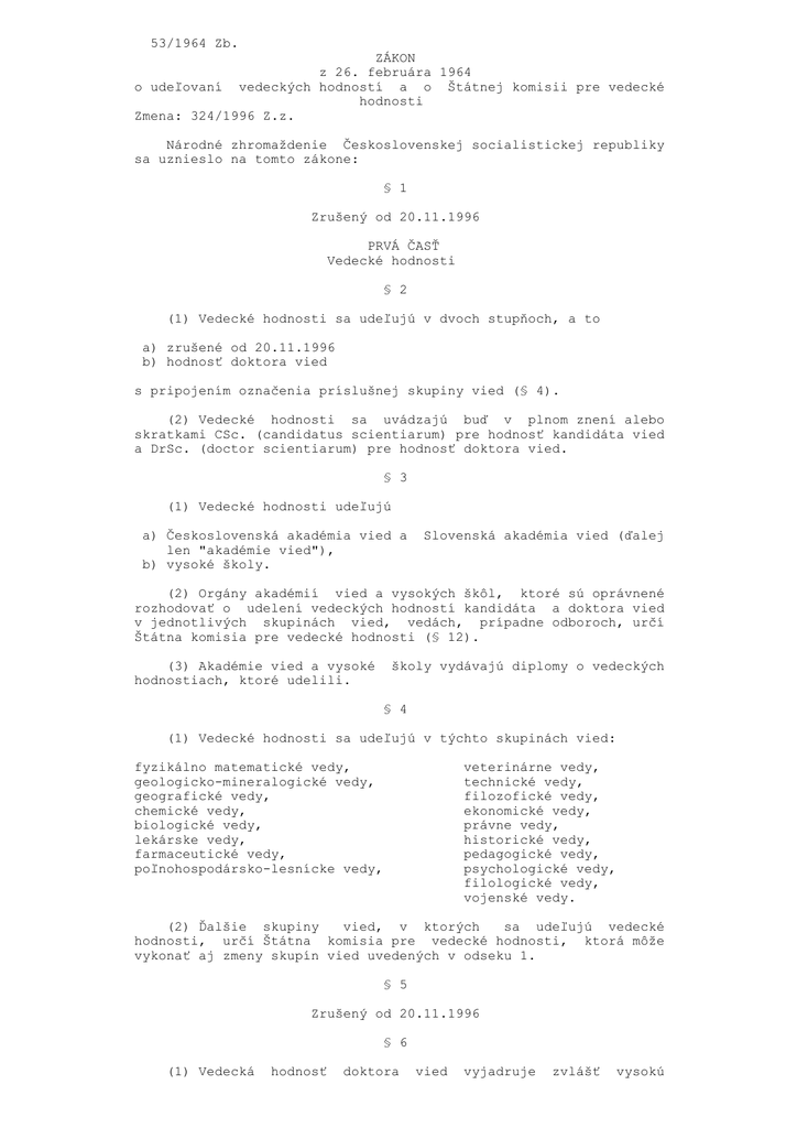 53/1964 Zb. ZÁKON z 26. februára 1964 o udeľovaní vedeckých hodností a o Štátnej komisii pre vedecké hodnosti Zmena: 324/1996 Z.z. Národné zhromaždenie Československej socialistickej republiky sa uznieslo na tomto zákone: § 1 Zrušený od 20.11.1996 PRVÁ ČASŤ Vedecké hodnosti § 2 (1) Vedecké hodnosti sa udeľujú v dvoch stupňoch, a to a) zrušené od 20.11.1996 b) hodnosť doktora vied s pripojením označenia príslušnej skupiny vied (§ 4). (2) Vedecké hodnosti sa uvádzajú buď v plnom znení alebo skratkami CSc. (candidatus scientiarum) pre hodnosť kandidáta vied a DrSc. (doctor scientiarum) pre hodnosť doktora vied. § 3 (1) Vedecké hodnosti udeľujú a) Československá akadémia vied a len "akadémie vied"), b) vysoké školy. Slovenská akadémia vied (ďalej (2) Orgány akadémií vied a vysokých škôl, ktoré sú oprávnené rozhodovať o udelení vedeckých hodností kandidáta a doktora vied v jednotlivých skupinách vied, vedách, prípadne odboroch, určí Štátna komisia pre vedecké hodnosti (§ 12). (3) Akadémie vied a vysoké hodnostiach, ktoré udelili. školy vydávajú diplomy o vedeckých § 4 (1) Vedecké hodnosti sa udeľujú v týchto skupinách vied: fyzikálno matematické vedy, geologicko-mineralogické vedy, geografické vedy, chemické vedy, biologické vedy, lekárske vedy, farmaceutické vedy, poľnohospodársko-lesnícke vedy, veterinárne vedy, technické vedy, filozofické vedy, ekonomické vedy, právne vedy, historické vedy, pedagogické vedy, psychologické vedy, filologické vedy, vojenské vedy. (2) Ďalšie skupiny vied, v ktorých sa udeľujú vedecké hodnosti, určí Štátna komisia pre vedecké hodnosti, ktorá môže vykonať aj zmeny skupín vied uvedených v odseku 1. § 5 Zrušený od 20.11.1996 § 6 (1) Vedecká hodnosť doktora vied vyjadruje zvlášť vysokú vedeckú kvalifikáciu preukázanú vytvorením závažných vedecky originálnych prác dôležitých pre rozvoj bádania v určitom vednom odbore alebo pre spoločenskú prax a charakterizujúcich vyhranenú vedeckú osobnosť. (2) Vedeckú spôsobilosť uvedenú v odseku 1 osvedčuje uchádzač verejnou obhajobou doktorskej dizertačnej práce. § 7 Zrušený od 20.11.1996 § 8 Spôsobilosť uchádzačov pre podľa § 5 až 7 sa osvedčuje obhajoby. nadobudnutie vedeckých hodností a overuje pred komisiami pre § 9 Na vyjadrenie vysokej pocty za zásluhy o pokrok na poli vedy a kultúry alebo spoločenských vzťahov a za významné zásluhy o socialistickú výstavbu možno udeliť vynikajúcim vedeckým alebo verejným pracovníkom domácim i zahraničným čestnú vedeckú hodnosť doktora vied. Na udelenie čestnej vedeckej hodnosti doktora vied podľa tohto zákona je potrebný súhlas Štátnej komisie pre vedecké hodnosti. § 10 Akadémie vied a vysoké školy môžu so súhlasom Štátnej komisie pre vedecké hodnosti nostrifikovať vedecké hodnosti získané v zahraničí, ak tieto hodnosti zodpovedajú svojou úrovňou vedeckým hodnostiam získavaným v Československej socialistickej republike. § 11 (1) Vedecké hodnosti strácajú občianskej a vedeckej cti. osoby, ktoré (2) Ak strata vedeckej hodnosti nenastane rozhodne o jej odňatí orgán, ktorý ju udelil. už sa spreneveria výrokom súdu, DRUHÁ ČASŤ Štátna komisia pre vedecké hodnosti § 12 (1) Štátna komisia pre vedecké hodnosti komisia") je celoštátny nadrezortný orgán týkajúcich sa udeľovania vedeckých hodností. (ďalej len "Štátna pre riešenie otázok (2) Štátna komisia má tieto hlavné úlohy: a) riadiť a koordinovať činnosť orgánov pri udeľovaní vedeckých hodností; b) dozerať na vysokú úroveň uchádzačov o vedecké hodnosti a zabezpečovať jej jednotné posudzovanie; c) zhromažďovať skúsenosti, ku ktorým dochádza pri udeľovaní vedeckých hodností, a na tomto základe postupne zdokonaľovať spôsob udeľovania vedeckých hodností. (3) Štátna komisia po dohode s Československou akadémiou vied, s Ministerstvom školstva a kultúry, so Štátnou komisiou pre rozvoj a koordináciu vedy a techniky a so zúčastnenými ústrednými orgánmi vydáva podrobné predpisy na vykonanie tohto zákona. (4) Štátna komisia sústavne dozerá na zachovávanie tohto zákona i vykonávacích predpisov k nemu a môže na základe opravného prostriedku a v odôvodnených prípadoch aj z vlastného podnetu zrušiť rozhodnutie orgánu, ktorý tieto predpisy vykonáva. (5) zrušený od 20.11.1996 § 13 Zrušený od 20.11.1996 § 14 Zrušený od 20.11.1996 TRETIA ČASŤ Záverečné ustanovenia § 15 Vedecké hodnosti nadobudnuté podľa § 2 a § 9 zákonného opatrenia Predsedníctva Národného zhromaždenia č. 64/1959 Zb. o udeľovaní vedeckých hodností a o Štátnej komisii pre vedecké hodnosti a podľa zákonného opatrenia Predsedníctva Národného zhromaždenia č. 10/1955 Zb., ktorým sa upravuje udeľovanie hodností doktora vied niektorým vedeckým pracovníkom, zostávajú nedotknuté. § 16 Akademické tituly a stavovské označenia, ktoré boli udelené pred 1. septembrom 1953, a absolventom lekárskych a veterinárnych fakúlt pred 1. januárom 1954, zostávajú nedotknuté. § 17 Výnimky z ustanovení § 5 až 7 povoľuje Štátna komisia. § 18 Zrušuje sa zákonné opatrenie Predsedníctva Národného zhromaždenia č. 64/1959 Zb. o udeľovaní vedeckých hodností a o Štátnej komisii pre vedecké hodnosti; podľa predpisov vydaných na vykonanie tohto zákonného opatrenia možno však konanie o udeľovaní vedeckých hodností uskutočňovať do vydania predpisov podľa § 12 ods. 3 tohto zákona. 1) -----------------------------------------------------------------1) Vyhláška Štátnej komisie pre vedecké hodnosti č. 200/1959 Ú.l. (Ú.v.); vyhláška Štátnej komisie pre vedecké hodnosti č. 11/1960 Zb.; vyhláška Štátnej komisie pre vedecké hodnosti č. 68/1961 Zb.; inštrukcia Štátnej ko