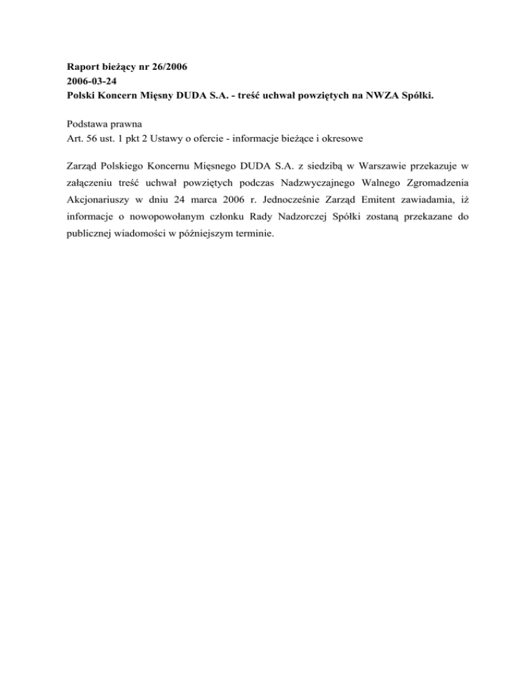 Raport bieżący nr 26/2006 2006-03-24 Polski Koncern Mięsny DUDA S.A. - treść uchwał powziętych na NWZA Spółki. Podstawa prawna Art. 56 ust. 1 pkt 2 Ustawy o ofercie - informacje bieżące i okresowe Zarząd Polskiego Koncernu Mięsnego DUDA S.A. z siedzibą w Warszawie przekazuje w załączeniu treść uchwał powziętych podczas Nadzwyczajnego Walnego Zgromadzenia Akcjonariuszy w dniu 24 marca 2006 r. Jednocześnie Zarząd Emitent zawiadamia, iż informacje o nowopowołanym członku Rady Nadzorczej Spółki zostaną przekazane do publicznej wiadomości w późniejszym terminie. Uchwala nr 1/24/03/2006 Nadzwyczajnego Walnego Zgromadzenia spólki Polski Koncern Miesny „DUDA” Spólka Akcyjna z siedziba w Warszawie z dnia 24 marca 2006 r. w sprawie wyboru Przewodniczacego Walnego Zgromadzenia ----------------Nadzwyczajne Walne Zgromadzenie spólki Polski Koncern Miesny „DUDA” Spólka Akcyjna z siedziba w Warszawie wybiera Tomasza Luczynskiego na Przewodniczacego Walnego Zgromadzenia.------------ Uchwala nr 2/24/03/2006 Nadzwyczajnego Walnego Zgromadzenia spólki Polski Koncern Miesny „DUDA” Spólka Akcyjna z siedziba w Warszawie z dnia 24 marca 2006 r. w sprawie wyboru Komisji Skrutacyjnej-------------------------------------------Nadzwyczajne Walne Zgromadzenie spólki Polski Koncern Miesny „DUDA” Spólka Akcyjna z siedziba w Warszawie wybiera Komisje Skrutacyjna w skladzie: Rafal Oleszak i Wojciech Duda.--------------------------------------------- Uchwala nr 3/24/03/2006 Nadzwyczajnego Walnego Zgromadzenia spólki Polski Koncern Miesny „DUDA” Spólka Akcyjna z siedziba w Warszawie z dnia 24 marca 2006 r. w sprawie uzupelnienia Rady Nadzorczej Spólki.---------------------------------§1 1. Dzialajac na podstawie art. 385 §1 ksh oraz §19 Statutu Nadzwyczajne Walne Zgromadzenie spólki pod firma Polski Koncern Miesny DUDA S.A. powoluje Marka Dybalskiego w sklad Rady Nadzorczej II kadencji.---------- 2. Kadencja nowego czlonka Rady Nadzorczej konczy sie wraz z uplywem kadencji Rady Nadzorczej, o której mowa w ust. 1.------------------------------ 3. Nowy czlonek Rady Nadzorczej otrzymuje wynagrodzenie na zasadach okreslonych dla Rady Nadzorczej II kadencji.-----------------------------------§2 Uchwala wchodzi w zycie z chwila podjecia. ------------------------------------------ Uchwala nr 4/24/03/2006 Nadzwyczajnego Walnego Zgromadzenia spólki Polski Koncern Miesny „DUDA” Spólka Akcyjna z siedziba w Warszawie z dnia 24 marca 2006 r. w sprawie ustalenia wynagrodzenia czlonków Rady Nadzorczej---------------§1 1. Dzialajac na podstawie art.392 §1 ksh oraz §20 ust. 15 Statutu Nadzwyczajne Walne Zgromadzenie spólki pod firma Polski Koncern Miesny DUDA S.A. ustala wynagrodzenie Przewodniczacego Rady Nadzorczej II kadencji na kwote 3.000,- zl (trzy tysiace zlotych) brutto miesiecznie a kazdego z pozostalych czlonków Rady Nadzorczej II kadencji na kwote 2.000,- zl (dwa tysiace zlotych) brutto miesiecznie.-------------------2. Wynagrodzenie, o którym mowa w ust. 1 bedzie wyplacane w terminach i trybie przyjetych przez Spólke dla wyplat pracowniczych.----------------------§2 Uchwala wchodzi w zycie z chwila podjecia, z moca obowiazujaca od dnia 01 kwietnia 2006 roku. ------------------------------------------------------------------- 2 Uchwala nr 5/24/03/2006 Nadzwyczajnego Walnego Zgromadzenia spólki Polski Koncern Miesny „DUDA” Spólka Akcyjna z siedziba w Warszawie z dnia 24 marca 2006 r. w sprawie zmiany Statutu-------------------------------------------------------------§1 Dzialajac na podstawie art. 430 Kodeksu spólek handlowych oraz §18 ust. 1 pkt d) Statutu, Nadzwyczajne Walne Zgromadzenie Polskiego Koncernu Miesnego DUDA SA zmienia Statut Spólki w ten sposób, ze w paragrafie 5 ust. 1 po punkcie 38 dodaje sie punkty od 39 do 43 o nastepujacym brzmieniu:------------------------------------------------------------------------------------39. Sprzedaz detaliczna paliw PKD 50.50.Z ,------------------------------------ 40. Sprzedaz hurtowa paliw stalych, cieklych, gazowych oraz produktów pochodnych PKD 51.51.Z ,---------------------------------------------------- 41. Przeladunek towarów w pozostalych punktach przeladunkowych PKD 63.11.C ,------------------------------------------------------------------- 42. Magazynowanie i przechowywanie towarów w pozostalych skladowiskach PKD 63.12.C ,------------------------------------------------43. Dzialalnosc pozostalych agencji transportowych PKD 63.40.C."-------§2 Uchwala wchodzi w zycie z dniem rejestracji przez Sad Rejestrowy zmian Statutu Spólki z niej wynikajacych. ----------------------------------------------------- 3