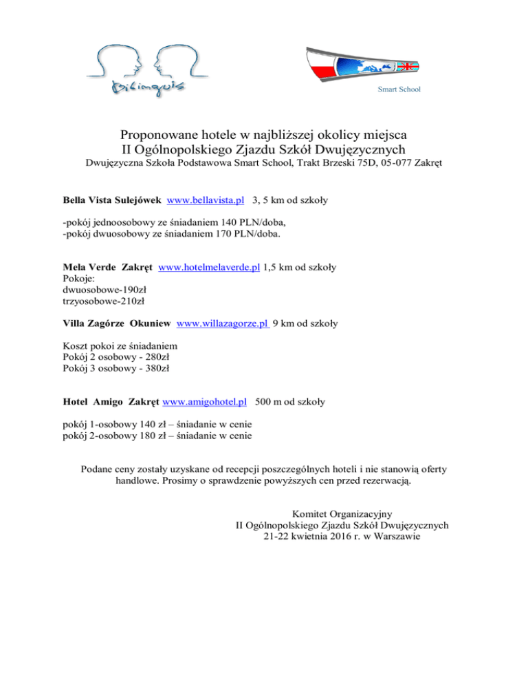 Smart School Proponowane hotele w najbliższej okolicy miejsca II Ogólnopolskiego Zjazdu Szkół Dwujęzycznych Dwujęzyczna Szkoła Podstawowa Smart School, Trakt Brzeski 75D, 05-077 Zakręt Bella Vista Sulejówek www.bellavista.pl 3, 5 km od szkoły -pokój jednoosobowy ze śniadaniem 140 PLN/doba, -pokój dwuosobowy ze śniadaniem 170 PLN/doba. Mela Verde Zakręt www.hotelmelaverde.pl 1,5 km od szkoły Pokoje: dwuosobowe-190zł trzyosobowe-210zł Villa Zagórze Okuniew www.willazagorze.pl 9 km od szkoły Koszt pokoi ze śniadaniem Pokój 2 osobowy - 280zł Pokój 3 osobowy - 380zł Hotel Amigo Zakręt www.amigohotel.pl 500 m od szkoły pokój 1-osobowy 140 zł – śniadanie w cenie pokój 2-osobowy 180 zł – śniadanie w cenie Podane ceny zostały uzyskane od recepcji poszczególnych hoteli i nie stanowią oferty handlowe. Prosimy o sprawdzenie powyższych cen przed rezerwacją. Komitet Organizacyjny II Ogólnopolskiego Zjazdu Szkół Dwujęzycznych 21-22 kwietnia 2016 r. w Warszawie