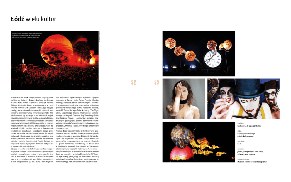 Fot. Materiały festiwalu Łódź wielu kultur Organizatorzy festiwalu chcą przywrócić Łodzi jej wielokulturowy charakter i rewitalizować zabytkową przestrzeń miasta przez sztukę 52 W Łodzi liczne wątki swojej historii znajdują Polacy, Niemcy, Rosjanie i Żydzi. Odwołując się do tego, w 2002 roku Witold Knychalski stworzył Festiwal Dialogu Czterech Kultur, przemianowany w 2010 roku na Festiwal Łódź Czterech Kultur. Jego ideą jest nawiązywanie do wielokulturowości miasta i tworzenie w nim kreatywnej, otwartej wspólnoty. Wielokulturowość tę pokazuje m.in. wieloletni projekt „Studnie”, rozpoczęty w 2013 roku, w ramach którego podwórka starych kamienic ożyły podczas koncertów zapomnianych melodii z łódzkiego getta w nowym, współczesnym opracowaniu oraz przedstawień teatralnych. Projekt ten jest związany z dążeniem do rewitalizacji zabytkowej przestrzeni Łodzi przez sztukę, usuwania niechęci mieszkańców do starych podwórek i budowania tożsamości z miastem oraz z chęcią otwarcia festiwalu na szersze rzesze mieszkańców i gości z innych miast Polski. Dlatego też większość imprez z programu festiwalu odbywa się w plenerze i jest nieodpłatna. Edycja z 2013 roku była dla festiwalu przełomowa pod względem dostępu publiczności do przygotowanych atrakcji: po raz pierwszy można je było oglądać również w Internecie. W efekcie liczba widzów festiwalu była o 3 tys. większa niż tych, którzy uczestniczyli w nim bezpośrednio (17 tys. osób). Transmisje on- line większości zaplanowanych wydarzeń oglądali internauci z Europy (m.in. Rosja, Francja, Irlandia, Niemcy), ale też ze Stanów Zjednoczonych i Australii. A wydarzeniami tymi były m.in. wielkie widowisko plenerowe francuskiego teatru Plasticiens Volants, spektakl Teatru Ósmego Dnia, koncerty: The Tiger Lillies, angielskiego zespołu muzycznego nominowanego do Nagrody Grammy, Sary Tenenberg-Bialas oraz Karstena Troyke – opiekunów spuścizny muzycznej w języku jidysz, Stevena Bernsteina, światowej sławy amerykańskiego trębacza żydowskiego pochodzenia, Mikołaja Trzaski, wybitnego saksofonisty i kompozytora. Festiwal Łódź Czterech Kultur jest intensywnie promowany poprzez outdoor, w stacjach telewizyjnych i radiowych oraz za pomocą działań niestandardowych. Na przykład w 2013 roku służyło temu 200 pendrive’ów z zaproszeniami na imprezę ukrytych w galerii handlowej Manufaktury w Łodzi oraz w knajpkach, sklepach i na ulicach w Warszawie, a także konkursy na profilu festiwalu na Facebooku. Ideą Festiwalu jest pozostawienie w Łodzi trwałego śladu po imprezie – projekt „Diamenty Łodzi” Joanny Rajkowskiej, polegający na ozdobieniu mozaiką z drobnych kawałków luster ścian kamienicy przy ul. Piotrkowskiej 3, na stałe wpisze się w pejzaż miasta. 53 NAZWA: Festiwal Łódź Czterech Kultur IDEA: nawiązywanie dialogu międzykulturowego MIEJSCE: Łódź TERMIN: jesień, począwszy od 2002 roku, od 2013 roku – wiosna ORGANIZACJA: Muzeum Miasta Łodzi (od 2013 roku)