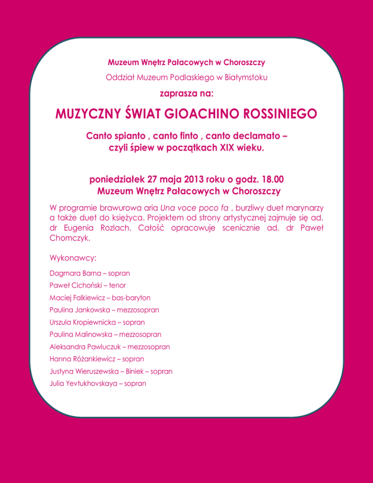 Muzeum Wnętrz Pałacowych w Choroszczy Oddział Muzeum Podlaskiego w Białymstoku zaprasza na: MUZYCZNY ŚWIAT GIOACHINO ROSSINIEGO Canto spianto , canto finto , canto declamato – czyli śpiew w początkach XIX wieku. poniedziałek 27 maja 2013 roku o godz. 18.00 Muzeum Wnętrz Pałacowych w Choroszczy W programie brawurowa aria Una voce poco fa , burzliwy duet marynarzy a także duet do księżyca. Projektem od strony artystycznej zajmuje się ad. dr Eugenia Rozlach. Całość opracowuje scenicznie ad. dr Paweł Chomczyk. Wykonawcy: Dagmara Barna – sopran Paweł Cichoński – tenor Maciej Falkiewicz – bas-baryton Paulina Jankowska – mezzosopran Urszula Kropiewnicka – sopran Paulina Malinowska – mezzosopran Aleksandra Pawluczuk – mezzosopran Hanna Różankiewicz – sopran Justyna Wieruszewska – Biniek – sopran Julia Yevtukhovskaya – sopran Przy fortepianie Krzysztof Kiercul