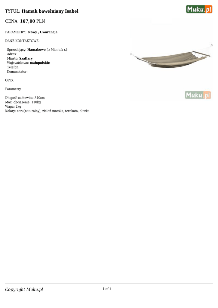 TYTUŁ: Hamak bawełniany Isabel CENA: 167,00 PLN PARAMETRY: Nowy , Gwarancja DANE KONTAKTOWE: Sprzedający: Hamakowo (.: Mientek :.) Adres: Miasto: Szaflary Województwo: małopolskie Telefon: Komunikator: OPIS: Parametry Długość całkowita: 340cm Max. obciażenie: 110kg Waga: 2kg Kolory: ecru(naturalny), zieleń morska, terakota, oliwka Copyright Muku.pl 1 of 1