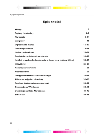 Z papieru wycinane Spis treści Wstęp Papiery i materiały 48 3 4–7 Narzędzia 8–14 Lampiony 15 Ogródek dla mamy 16–17 Dekoracje słoików 18–19 Łódka z zabawkami 20–21 Pamiętnik z miejscami na sekrety 22–23 Kafelek z wycinanką kurpiowską w kopercie z tektury falistej 24–25 Wizytówki 26–27 Koperty na wizytówki 28 Naprasowanki 29 Okrągłe obrazki w szalkach Petriego 30–31 Album na zdjęcia z obwolutą 32–35 Ramka z kartonu do passe-partout 36–37 Dekoracje na Wielkanoc 38–40 Dekoracje na Boże Narodzenie 41–43 Schematy 44–45