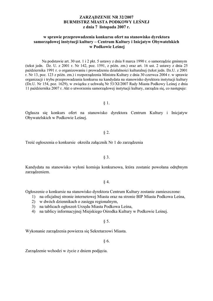 Treść Zarządzenia Burmistrza Miasta Podkowy Leśnej nr 32/2007 w