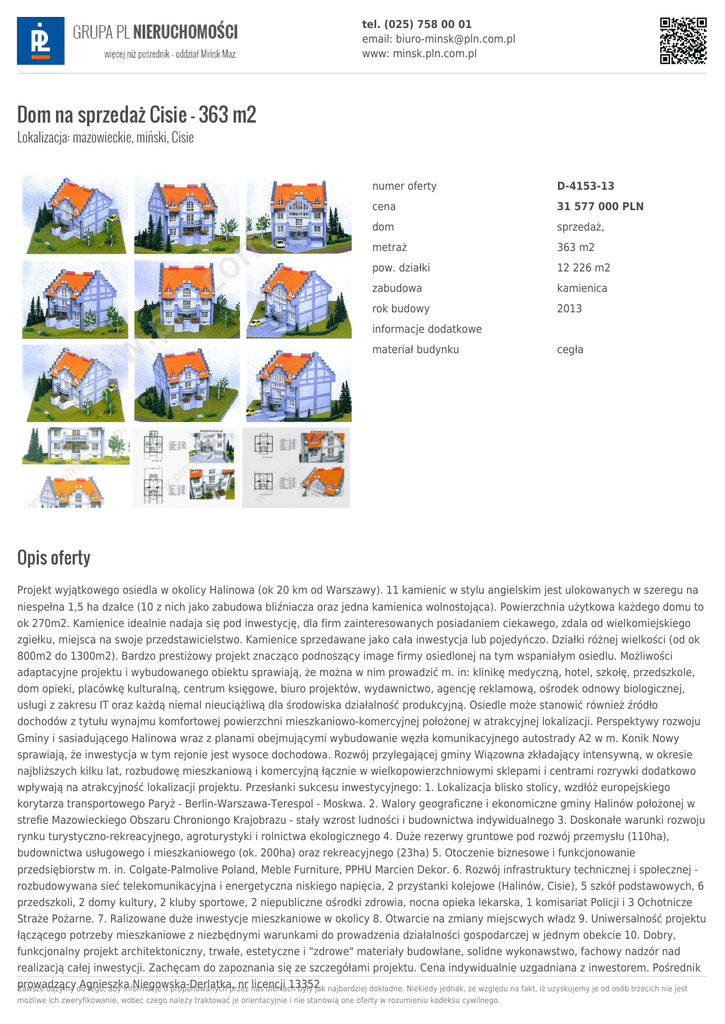 tel. (025) 758 00 01 email: [email protected] www: minsk.pln.com.pl Dom na sprzedaż Cisie - 363 m2 Lokalizacja: mazowieckie, miński, Cisie numer oferty D-4153-13 cena 31 577 000 PLN dom sprzedaż, metraż 363 m2 pow. działki 12 226 m2 zabudowa kamienica rok budowy 2013 informacje dodatkowe materiał budynku cegła Opis oferty Projekt wyjątkowego osiedla w okolicy Halinowa (ok 20 km od Warszawy). 11 kamienic w stylu angielskim jest ulokowanych w szeregu na niespełna 1,5 ha dzałce (10 z nich jako zabudowa bliźniacza oraz jedna kamienica wolnostojąca). Powierzchnia użytkowa każdego domu to ok 270m2. Kamienice idealnie nadaja się pod inwestycję, dla firm zainteresowanych posiadaniem ciekawego, zdala od wielkomiejskiego zgiełku, miejsca na swoje przedstawicielstwo. Kamienice sprzedawane jako cała inwestycja lub pojedyńczo. Działki różnej wielkości (od ok 800m2 do 1300m2). Bardzo prestiżowy projekt znacząco podnoszący image firmy osiedlonej na tym wspaniałym osiedlu. Możliwości adaptacyjne projektu i wybudowanego obiektu sprawiają, że można w nim prowadzić m. in: klinikę medyczną, hotel, szkołę, przedszkole, dom opieki, placówkę kulturalną, centrum księgowe, biuro projektów, wydawnictwo, agencję reklamową, ośrodek odnowy biologicznej, usługi z zakresu IT oraz każdą niemal nieuciążliwą dla środowiska działalność produkcyjną. Osiedle może stanowić również źródło dochodów z tytułu wynajmu komfortowej powierzchni mieszkaniowo-komercyjnej położonej w atrakcyjnej lokalizacji. Perspektywy rozwoju Gminy i sasiadującego Halinowa wraz z planami obejmującymi wybudowanie węzła komunikacyjnego autostrady A2 w m. Konik Nowy sprawiają, że inwestycja w tym rejonie jest wysoce dochodowa. Rozwój przylegającej gminy Wiązowna zkładający intensywną, w okresie najbliższych kilku lat, rozbudowę mieszkaniową i komercyjną łącznie w wielkopowierzchniowymi sklepami i centrami rozrywki dodatkowo wpływają na atrakcyjność lokalizacji projektu. Przesłanki sukcesu inwestycyjnego: 1. Lokalizacja blisko stolicy, wzdłóż europejskiego korytarza transportowego Paryż - Berlin-Warszawa-Terespol - Moskwa. 2. Walory geograficzne i ekonomiczne gminy Halinów położonej w strefie Mazowieckiego Obszaru Chroniongo Krajobrazu - stały wzrost ludności i budownictwa indywidualnego 3. Doskonałe warunki rozwoju rynku turystyczno-rekreacyjnego, agroturystyki i rolnictwa ekologicznego 4. Duże rezerwy gruntowe pod rozwój przemysłu (110ha), budownictwa usługowego i mieszkaniowego (ok. 200ha) oraz rekreacyjnego (23ha) 5. Otoczenie biznesowe i funkcjonowanie przedsiębiorstw m. in. Colgate-Palmolive Poland, Meble Furniture, PPHU Marcien Dekor. 6. Rozwój infrastruktury technicznej i społecznej rozbudowywana sieć telekomunikacyjna i energetyczna niskiego napięcia, 2 przystanki kolejowe (Halinów, Cisie), 5 szkół podstawowych, 6 przedszkoli, 2 domy kultury, 2 kluby sportowe, 2 niepubliczne ośrodki zdrowia, nocna opieka lekarska, 1 komisariat Policji i 3 Ochotnicze Straże Pożarne. 7. Ralizowane duże inwestycje mieszkaniowe w okolicy 8. Otwarcie na zmiany miejscwych władz 9. Uniwersalność projektu łączącego potrzeby mieszkaniowe z niezbędnymi warunkami do prowadzenia działalności gospodarczej w jednym obekcie 10. Dobry, funkcjonalny projekt architektoniczny, trwałe, estetyczne i "zdrowe" materiały budowlane, solidne wykonawstwo, fachowy nadzór nad realizacją całej inwestycji. Zachęcam do zapoznania się ze szczegółami projektu. Cena indywidualnie uzgadniana z inwestorem. Pośrednik prowadzący Agnieszka Niegowska-Derlatka, nr nas licencji 13352 Zawsze dążymy do tego, aby informacje o proponowanych przez ofertach były jak najbardziej dokładne. Niekiedy jednak, ze względu na fakt, iż uzyskujemy je od osób trzecich nie jest możliwe ich zweryfikowanie, wobec czego należy traktować je orientacyjnie i nie stanowią one oferty w rozumieniu kodeksu cywilnego. tel. (025) 758 00 01 email: [email protected] www: minsk.pln.com.pl Lokalizacja Osoba kontaktowa Jarosław Matak województwo mazowieckie powiat miński [email protected] miasto Cisie Chętnie udzielę dodatkowych informacji związanych z tą ofertą. Zapraszam do kontaktu! tel. 512206707 Zawsze dążymy do tego, aby informacje o proponowanych przez nas ofertach były jak najbardziej dokładne. Niekiedy jednak, ze względu na fakt, iż uzyskujemy je od osób trzecich nie jest możliwe ich zweryfikowanie, wobec czego należy traktować je orientacyjnie i nie stanowią one oferty w rozumieniu kodeksu cywilnego.