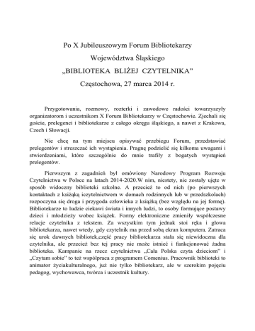 Po X Jubileuszowym Forum Bibliotekarzy Województwa Śląskiego „BIBLIOTEKA BLIŻEJ CZYTELNIKA” Częstochowa, 27 marca 2014 r. Przygotowania, rozmowy, rozterki i zawodowe radości towarzyszyły organizatorom i uczestnikom X Forum Bibliotekarzy w Częstochowie. Zjechali się goście, prelegenci i bibliotekarze z całego okręgu śląskiego, a nawet z Krakowa, Czech i Słowacji. Nie chcę na tym miejscu opisywać przebiegu Forum, przedstawiać prelegentów i streszczać ich wystąpienia. Pragnę podzielić się kilkoma uwagami i stwierdzeniami, które szczególnie do mnie trafiły z bogatych wystąpień prelegentów. Pierwszym z zagadnień był omówiony Narodowy Program Rozwoju Czytelnictwa w Polsce na latach 2014-2020.W nim, niestety, nie zostały ujęte w sposób widoczny biblioteki szkolne. A przecież to od nich (po pierwszych kontaktach z ksiżąką iczytelnictwem w domach rodzinnych lub w przedszkolach) rozpoczyna się droga i przygoda człowieka z książką (bez względu na jej formę). Bibliotekarze to ludzie ciekawi świata i innych ludzi, to osoby formujące postawy dzieci i młodzieży wobec książek. Formy elektroniczne zmieniły współczesne relacje czytelnika z tekstem. Za wszystkim tym jednak stoi ręka i głowa bibliotekarza, nawet wtedy, gdy czytelnik ma przed sobą ekran komputera. Zatraca się urok dawnych bibliotek,część pracy bibliotekarza stała się niewidoczna dla czytelnika, ale przecież bez tej pracy nie może istnieć i funkcjonować żadna biblioteka. Kampanie na rzecz czytelnictwa „Cała Polska czyta dzieciom” i „Czytam sobie” to też wspólpraca z programem Comenius. Pracownik biblioteki to animator życiakulturalnego, już nie tylko bibliotekarz, ale w szerokim pojęciu pedagog, wychowawca, twórca i uczestnik kultury. Biblioteka to ważny element dydaktyczny i wychowawczy szkoły. Każda, nie tylko ta super wyposażona w multimedia. Nauczyciel bibliotekarz często odrywany jest od swoich podstawowych zadań, wykonuje dodatkowe zadania w szkole, podejmuje nowe przedsięwzięcia, wykazuje tyle kreatywności w tych trudnych czasach. Biblioteka szkolna to taka część placówki oświatowowychowawczej, dla której nie ustalono standardów, wymogów ani wymagań dotyczących miejsca i obsługi. Prof. Jan Malicki podkreślił zaś, że uniwersytet to budynki wokół biblioteki i właśnie biblioteka jest szczególnym miejscem w strukturze oświatowej. Biblioteka ma trzy poziomy – I materiały dla czytelnika projektowanego, II materiały udostępniane i czytelnik realny przychodzący do biblioteki, III działalność bibliograficzna, popularyzująca, przeznaczona dla czytelnika przyszłego, pośredniego. Czytelnik był, jest i będzie bardzo zróżnicowany. Model działań biblioteki wywodzi się z całego okresu historii bibliotek. Biblioteka jest też postrzegana w układzie horyzontalnym pomiędzy różnymi instytucjami, obecnie jako biblioteka synkretyczna, niekonwencjonalna. Darina Janovska zwróciła uwagę na biblioteki cyfrowe i zdigitalizowane zbiory wielu bibliotek, szczególnie uniwersyteckich i narodowych, na współpracę i wymianę doświadczeń z bibliotekami innych typów. Zbiory dostępne są poprzez sieć, a czasopisma bibliotekarskie i inne wydawane w formie tradycyjnej (papierowej) i elektronicznej (cyfrowej) docierają do większej rzeszy czytelnków. Monika Krakowska z Uniwersytetu Jagiellońskiego zwróciła uwagę na indywidualizację potrzeb czytelników i z tym związane zachowania informacyjne użytkowników. Obecnie często biblioteka jest traktowana jako tzw. III miejsce (odskocznia od codzienności,miejsce spokojne, bezpieczne, pozytywne). Kompetencje emocjonalne czytelnika to emocjonalny mózg użytkowników, ich pamięć emocjonalna. Współcześnie obserwuje się zmianę modelu mentalnego dotyczącą biblioteki w szkole, pojawiają się modele mentalne obrazujące miejsce biblioteki w środowisku i w życiu młodego użytkownika. Według przeprowadzonych przez Bielski Oddział TNBSP badań ankietowych nastąpiła ewolucja w pracy nauczyciela bibliotekarza – obecnie 80 % czasu pracy to opieka i praca z uczniem, a tylko 10-20 % czasu poświęca się na prace biblioteczne. Halina Molinova z Regionalnej Biblioteki w Karwinie pokazała, iż pozyskane środki z UE w ramach różnych projektów pozwoliły na rozwój i zmiany w funkcjonowaniu biblioteki, na otwarcie się dla osób niepełnosprawnych i mniejszości narodowe jako nowych użytkowników biblioteki. Małgorza Gwadera z Uniwersytetu Śląskiego analizując Narodowy Program Rozwoju Cztelnictwa na lata 2014-2020 zwróciła uwagę na promocję i upowszechnianie czytelnictwa dla rozwoju kultury i kreatywności Polaków. Niestety brak jest społecznegoaplauzu dla tego programu. Program Biblioteka+ Literatura i Czasopisma podkreśla priorytet – zakup nowości książkowych dla bibliotek publicznych, nie obejmuje swym zasięgiem bibliotek szkolnych. Brak jest spójności działań ministerstw zajmujących się kulturą, oświatą i dorobkiem narodowym. Generalnie program skierowany jest do osób już czytających (do tzw. elity czytającej), a nie do tzw. analfabetów funkcjonalnych, którzy utracili umiejętność czytania lub zbyt słabo ją posiedli w czasie edukacji szkolnej, co pokazują testy sprawdzające. Współcześnie czytanie jest defensywne, czytelnikiem nikt się nie rodzi, czytelnka trzeba wychować, wyposażyć go w odpowiednie umiejętności, a polska szkoła lokuje się dziś poza obrębem polskiej kultury, pozostaje tylko na poziomie edukacji. I w tym miejscu ogromną rolę może i powinna odegrać biblioteka szkolna, dobrze zorganizowana, wyposażona, z kompetentnym, dobrze wykształconym i wciąż rozwijającym swoje umiejętności nauczycielem bibliotekarzem, czego sobie i innym bibliotekarzom życzę. Bożena Szatan-Fedko Bielsko-Biała