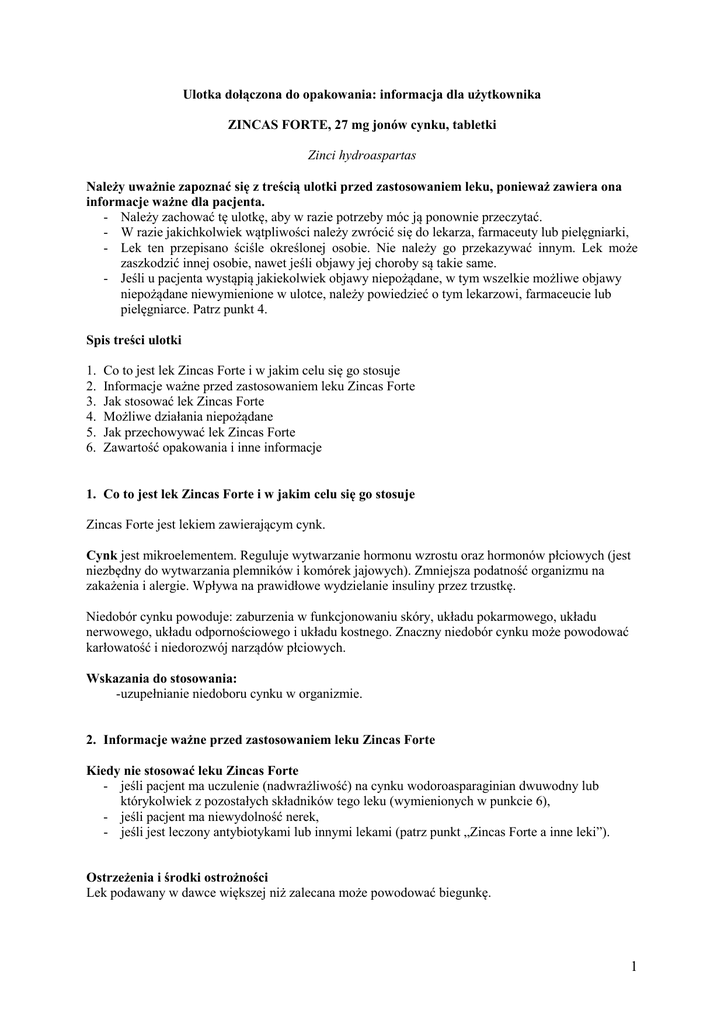 Ulotka dołączona do opakowania: informacja dla użytkownika ZINCAS FORTE, 27 mg jonów cynku, tabletki Zinci hydroaspartas Należy uważnie zapoznać się z treścią ulotki przed zastosowaniem leku, ponieważ zawiera ona informacje ważne dla pacjenta. - Należy zachować tę ulotkę, aby w razie potrzeby móc ją ponownie przeczytać. - W razie jakichkolwiek wątpliwości należy zwrócić się do lekarza, farmaceuty lub pielęgniarki, - Lek ten przepisano ściśle określonej osobie. Nie należy go przekazywać innym. Lek może zaszkodzić innej osobie, nawet jeśli objawy jej choroby są takie same. - Jeśli u pacjenta wystąpią jakiekolwiek objawy niepożądane, w tym wszelkie możliwe objawy niepożądane niewymienione w ulotce, należy powiedzieć o tym lekarzowi, farmaceucie lub pielęgniarce. Patrz punkt 4. Spis treści ulotki 1. 2. 3. 4. 5. 6. Co to jest lek Zincas Forte i w jakim celu się go stosuje Informacje ważne przed zastosowaniem leku Zincas Forte Jak stosować lek Zincas Forte Możliwe działania niepożądane Jak przechowywać lek Zincas Forte Zawartość opakowania i inne informacje 1. Co to jest lek Zincas Forte i w jakim celu się go stosuje Zincas Forte jest lekiem zawierającym cynk. Cynk jest mikroelementem. Reguluje wytwarzanie hormonu wzrostu oraz hormonów płciowych (jest niezbędny do wytwarzania plemników i komórek jajowych). Zmniejsza podatność organizmu na zakażenia i alergie. Wpływa na prawidłowe wydzielanie insuliny przez trzustkę. Niedobór cynku powoduje: zaburzenia w funkcjonowaniu skóry, układu pokarmowego, układu nerwowego, układu odpornościowego i układu kostnego. Znaczny niedobór cynku może powodować karłowatość i niedorozwój narządów płciowych. Wskazania do stosowania: -uzupełnianie niedoboru cynku w organizmie. 2. Informacje ważne przed zastosowaniem leku Zincas Forte Kiedy nie stosować leku Zincas Forte - jeśli pacjent ma uczulenie (nadwrażliwość) na cynku wodoroasparaginian dwuwodny lub którykolwiek z pozostałych składników tego leku (wymienionych w punkcie 6), - jeśli pacjent ma niewydolność nerek, - jeśli jest leczony antybiotykami lub innymi lekami (patrz punkt „Zincas Forte a inne leki”). Ostrzeżenia i środki ostrożności Lek podawany w dawce większej niż zalecana może powodować biegunkę. 1 Dzieci Leku Zincas Forte nie należy stosować u dzieci w wieku poniżej 12 lat. Zincas Forte a inne leki Należy powiedzieć lekarzowi lub farmaceucie o wszystkich lekach przyjmowanych przez pacjenta obecnie lub ostatnio, a także o lekach, które pacjent planuje stosować. Nie należy stosować leku Zincas Forte jednocześnie z następującymi lekami: - antybiotyki z grupy tetracyklin (np. doksycyklina), ponieważ cynk zmniejsza ich wchłanianie, - zawierające kwas acetylosalicylowy, - leki przeciwbólowe zwane niesteroidowymi lekami przeciwzapalnymi (NLPZ), np. ibuprofen, indometacyna, - leki zwiększające wytwarzanie moczu, np. hydrochlorotiazyd, - kortykosteroidy, zwane sterydami, np. hydrokortyzon, - leki i suplementy diety zawierające wapń, żelazo i miedź, ponieważ zmniejszają wchłanianie cynku, - substancje chelatujące, np.penicylamina – lek stosowany w leczeniu m.in. zatrucia ołowiem lub miedzią. Stosowanie leku Zincas Forte z jedzeniem i piciem Lek należy przyjmować po posiłku, popijając wodą (patrz punkt 3). Nie należy przyjmować leku Zincas Forte jednocześnie z produktami mlecznymi (mleko i jego przetwory). Produkty te zmniejszają wchłanianie cynku. Ciąża, karmienie piersią i wpływ na płodność Jeśli pacjentka jest w ciąży lub karmi piersią, przypuszcza że może być w ciąży lub gdy planuje mieć dziecko, powinna poradzić się lekarza lub farmaceuty przed zastosowaniem tego leku. Leku Zincas Forte nie należy stosować w okresie ciąży i karmienia piersią. Prowadzenie pojazdów i obsługiwanie maszyn Brak danych dotyczących szkodliwego wpływu leku Zincas Forte na zdolność prowadzenia pojazdów i obsługiwania maszyn. Zincas Forte zawiera sacharozę. Jedna tabletka zawiera 12,24 mg sacharozy. Należy wziąć to pod uwagę u pacjentów chorych na cukrzycę. Jeżeli stwierdzono wcześniej u pacjenta nietolerancję niektórych cukrów, pacjent powinien skontaktować się z lekarzem przed przyjęciem leku. 3. Jak stosować lek Zincas Forte Ten lek należy zawsze stosować zgodnie z zaleceniami lekarza. W razie wątpliwości należy zwrócić się do lekarza lub farmaceuty. Stosowanie u dorosłych i młodzieży w wieku powyżej 12 lat Zalecana dawka: 1 tabletka na dobę. Zincas Forte należy przyjmować doustnie, po posiłku, popijając wodą. Jeśli dolegliwości nie ustąpią po 30 dniach stosowania leku, należy skontaktować się z lekarzem. Zastosowanie większej niż zalecana dawki leku Zincas Forte W razie przyjęcia większej niż zalecana dawki leku, należy zwrócić się do lekarza lub farmaceuty. Mogą wystąpić objawy zatrucia lekiem Zincas Forte (wymienione w punkcie 4). 2 Pominięcie zastosowania dawki leku Zincas Forte W przypadku pominięcia dawki leku należy przyjąć lek tak szybko, jak to jest możliwe. Nie należy stosować dawki podwójnej w celu uzupełnienia pominiętej dawki. 4. Możliwe działania niepożądane Jak każdy lek, lek ten może powodować działania niepożądane, chociaż nie u każdego one wystąpią. Podczas stosowania zgodnie z zalecanym dawkowaniem, nie obserwowano działań niepożądanych. Większe dawki leku mogą powodować wystąpienie objawów niepożądanych, takich jak: - nudności, bóle brzucha, biegunka, - metaliczny smak w ustach, - ból głowy. Długotrwałe stosowanie leku Zincas Forte może spowodować niedobór miedzi i niedokrwistość. Zgłaszanie działań niepożądanych Jeśli wystąpią jakiekolwiek objawy niepożądane, w tym wszelkie objawy niepożądane niewymienione w ulotce, należy powiedzieć o tym lekarzowi lub farmaceucie, lub pielęgniarce. Działania niepożądane można