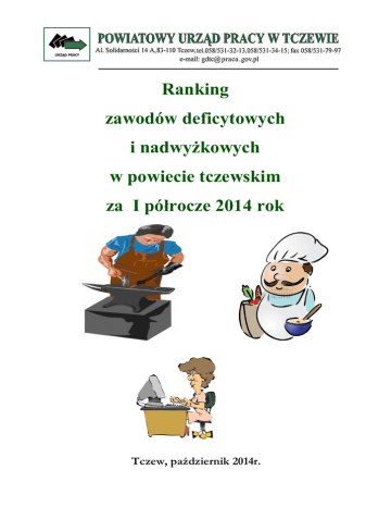 Ranking zawodów deficytowych i nadwyżkowych w powiecie tczewskim za I półrocze 2014 rok Tczew, październik 2014r. SPIS TREŚCI WSTĘP ……………………………………………………………………………... 3 ROZDZIAŁ I Ogólna charakterystyka rynku pracy ……………………………………………….. 7 ROZDZIAŁ II Analiza bezrobocia według zawodów /grup zawodów/ ……………………………. 17 ROZDZIAŁ III Analiza ofert pracy według zawodów /grup zawodowych/ ………………………… 23 ROZDZIAŁ IV Analiza zawodów deficytowych i nadwyżkowych…………………………………. 29 WNIOSKI …………………………………………………………………………. 41 2 WSTĘP Cel opracowania Monitoring zawodów deficytowych i nadwyżkowych stanowi jedną z form obserwacji lokalnego rynku pracy prowadzoną przez urzędy pracy. Jako niezbędny element polityki przeciwdziałania bezrobociu i promocji zatrudnienia jest analizą zachodzących na danym obszarze zmian, zarówno w strukturze zatrudnienia jak i strukturze zawodowej osób bezrobotnych. Przedstawiony raport zawodów deficytowych i nadwyżkowych jest źródłem informacji dla: określenia kierunków i natężenia zmian zachodzących w strukturze zawodowo-kwalifikacyjnej na lokalnym rynku pracy, stworzenia bazy informacyjnej dla opracowania przyszłych struktur zawodowo-kwalifikacyjnych w układzie lokalnym, określenia odpowiednich kierunków szkolenia bezrobotnych, zapewniając większą efektywność organizowanych szkoleń, wskazywania zmian zachodzących na rynku pracy, które mogą być wykorzystywane przez szkoły ponadgimnazjalne w procesie kształcenia młodzieży, podnoszenia jakości poradnictwa zawodowego poprzez wskazanie zawodów deficytowych i nadwyżkowych, usprawnienia pośrednictwa pracy poprzez uzyskanie informacji o planowanych ofertach pracy na przyszły rok oraz przewidywanej liczbie absolwentów według zawodów, ułatwienia realizacji programów specjalnych dla aktywizacji osób długotrwale bezrobotnych w celu promowania ich ponownego zatrudnienia. Opracowanie analiz rynku pracy, w tym prowadzenie monitoringu zawodów deficytowych i nadwyżkowych jest zadaniem zarówno województwa jak i samorządu powiatu w zakresie polityki rynku pracy zgodnym z zapisami Ustawy z dnia 20 kwietnia 2004r o promocji zatrudnienia i instytucjach rynku pracy. 3 Nowa statystyka z zakresu stosowania zawodów i specjalności bezrobotnych zarejestrowanych w urzędach pracy sporządzana jest na podstawie Rozporządzenia Ministra Pracy i Polityki Społecznej z dnia 27 kwietnia 2010r. w sprawie klasyfikacji zawodów i specjalności na potrzeby rynku pracy oraz zakresu jej stosowania (Dz.U. z 2014r., poz. 760 z późn. zmianami). Załącznikiem do rozporządzenia jest struktura klasyfikacji, która stanowi pogrupowany spis zawodów i specjalności (prac) wykonywanych na rynku pracy. Konieczność opracowania nowej klasyfikacji zawodów i specjalności została podyktowana przede wszystkim zmianą Międzynarodowego Standardu Klasyfikacji Zawodów, który jest zalecany krajom członkowskim Unii Europejskiej przez EUROSTAT do stosowania w badaniach statystycznych. Opracowanie nowej klasyfikacji wynikało m.in. z takich potrzeb jak: pojawienie się nowych zawodów i specjalności odzwierciedlających zmiany, jakie zaszły na rynku pracy wraz z wprowadzeniem nowych technologii charakterystycznych dla gospodarki opartej na wiedzy, wyłączenia z ewidencji tych zawodów i specjalności, które już nie funkcjonują na rynku pracy lub wykonywane są przez nieliczne osoby, uwzględnienie zawodów w aktualnej klasyfikacji zawodów szkolnictwa zawodowego, ujęcie aktualnych zawodów regulowanych prawnie, zapewnienie ujednolicenia nazewnictwa i grupowania zawodów/specjalności dla ułatwienia międzynarodowego pośrednictwa pracy (w tym EURES). Niezbędnym źródłem informacji do prowadzenia monitoringu zawodów deficytowych i nadwyżkowych w powiecie tczewskim są dane zgromadzone w statystykach Powiatowego Urzędu Pracy w Tczewie jako zbiór zawodów i specjalności zarejestrowanych osób bezrobotnych oraz ofert pracy. W poniższym opracowaniu szczegółowej analizie zostaną poddane grupy duże ( kod 2 cyfrowy) i grupy elementarne (kod 4 cyfrowy). Prezentowany raport ma charakter głównie diagnostyczny, daje możliwość oceny rozwoju lokalnej gospodarki poprzez śledzenie struktury bezrobotnych 4 według ostatniego miejsca pracy i zgłaszanych ofert pracy w ujęciu klasyfikacji działalności. Przez Zawód nadwyżkowy należy rozumieć zawód, na który występuje na rynku pracy mniejsze zapotrzebowanie, niż liczba osób poszukujących pracy w tym zawodzie. Przez zawód deficytowy należy rozumieć zawód, na który występuje na rynku pracy wyższe zapotrzebowanie, niż liczba osób poszukujących pracy w tym zawodzie. Przez Zawód w równowadze należy rozumieć zawód, na który występuje na danym rynku pracy takie samo zapotrzebowanie jak liczba osób poszukujących pracy w tym zawodzie. Klasyfikacja jest pięciopoziomowym, hierarchicznie usystematyzowanym zbiorem zawodów i specjalności występujących na rynku pracy. Struktura klasyfikacji oparta jest na systemie pojęć, z których najważniejsze to zawód, specjalność, umiejętność oraz kwalifikacje zawodowe. Zawód zdefiniowany został jako zbiór zadań wyodrębnionych w wyniku społecznego podziału pracy, wykonywanych stale lub z niewielkimi zmianami przez poszczególne osoby i wymagających odpowiednich kwalifikacji zdobytych w wyniku kształcenia i praktyki. Zawód może dzielić się na specjalności. Specjalność jest wynikiem podziału pracy w ramach zawodu, zawiera część czynności o podobnym charakterze. Umiejętność określono jako sprawdzoną możliwość wykonywania odpowiedniej klasy zadań w ramach zawodu, natomiast przez kwalifikacje zawodowe rozumiane są układy wiedzy i umiejętności 