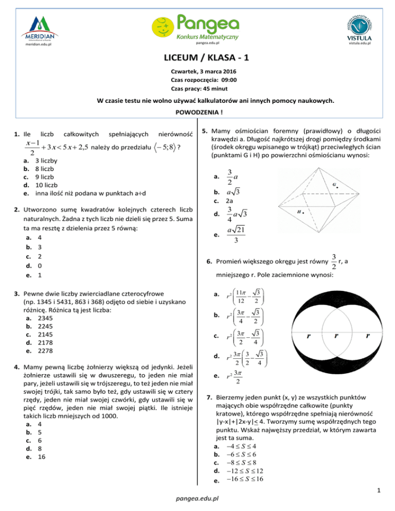 pangea.edu.pl meridian.edu.pl vistula.edu.pl LICEUM / KLASA - 1 Czwartek, 3 marca 2016 Czas rozpoczęcia: 09:00 Czas pracy: 45 minut W czasie testu nie wolno używać kalkulatorów ani innych pomocy naukowych. POWODZENIA ! 1. Ile x −1 a. b. c. d. e. 2 liczb całkowitych spełniających nierówność + 3 x < 5 x + 2,5 należy do przedziału − 5; 8 ? 3 liczby 8 liczb 9 liczb 10 liczb inna ilość niż podana w punktach a÷d 5. Mamy ośmiościan foremny (prawidłowy) o długości krawędzi a. Długość najkrótszej drogi pomiędzy środkami (środek okręgu wpisanego w trójkąt) przeciwległych ścian (punktami G i H) po powierzchni ośmiościanu wynosi: 3 a 2 b. a 3 a. c. 2a 2. Utworzono sumę kwadratów kolejnych czterech liczb naturalnych. Żadna z tych liczb nie dzieli się przez 5. Suma ta ma resztę z dzielenia przez 5 równą: a. 4 b. 3 c. 2 d. 0 e. 1 3. Pewne dwie liczby zwierciadlane czterocyfrowe (np. 1345 i 5431, 863 i 368) odjęto od siebie i uzyskano różnicę. Różnica tą jest liczba: a. 2345 b. 2245 c. 2145 d. 2178 e. 2278 4. Mamy pewną liczbę żołnierzy większą od jedynki. Jeżeli żołnierze ustawili się w dwuszeregu, to jeden nie miał pary, jeżeli ustawili się w trójszeregu, to też jeden nie miał swojej trójki, tak samo było też, gdy ustawili się w cztery rzędy, jeden nie miał swojej czwórki, gdy ustawili się w pięć rzędów, jeden nie miał swojej piątki. Ile istnieje takich liczb mniejszych od 1000. a. 4 b. 5 c. 6 d. 8 e. 16 d. e. 3 a 3 4 a 21 3 6. Promień większego okręgu jest równy 3 r, a 2 mniejszego r. Pole zaciemnione wynosi: a. 11π 3 − r 2 12 2 b. r 2 3π − 3 4 2 3 2 3π c. d. e. r − 4 2 3π 3 3 r2 − 2 2 4 3π r2 2 7. Bierzemy jeden punkt (x, y) ze wszystkich punktów mających obie współrzędne całkowite (punkty kratowe), którego współrzędne spełniają nierówność |y-x|+|2x-y|< 4. Tworzymy sumę współrzędnych tego punktu. Wskaż najwęższy przedział, w którym zawarta jest ta suma. a. −4 ≤ S ≤ 4 b. −6 ≤ S ≤ 6 c. −8 ≤ S ≤ 8 d. −12 ≤ S ≤ 12 e. −16 ≤ S ≤ 16 pangea.edu.pl 1 8. Długości odcinków zaznaczono na rysunku. Jakie jest pole pierścienia kołowego? a. b. c. d. e. 4π 16π 18π 32π 36π proste. Długość odcinka FE wynosi: a. b. 9. Mamy trapez prostokątny o podstawach długości a i a/n. Ramię prostopadłe ma długość b. Przekątne przecinają się pod kątem prostym. Wtedy iloraz a/b jest równy: a. n b. 2n c. n d. n 2 e. n 3 c. d. 2 5 3 4 3 8 7 39 208 e. 1 3 14. Dane są 4 różne liczby naturalne k, l, n, m. Ile rozwiązań, czyli czwórek liczb (k; l; n; m), ma nierówność 1 1 + k l 10. Świeczarz to w średniowiecznej Polsce wytwórca świec, który poza wyrabianiem świec, kupował wosk do ich produkcji. Stożkową świecę przypadkowo pocięto na n części płaszczyznami równoległymi do podstawy stożka tak, że każda część ma jednakową wysokość. Za pierwszą część (najmniejszą, z wierzchołkiem stożka) świeczarz zapłacił 1 zł. Ile powinien zapłacić za ostatnią (przy podstawie) n-tą część świecy? a. n b. n 2 − 1 c. 2n 2 − 1 d. 4n 2 − 1 e. 3n 2 − 3n + 1 11. Ile jest wszystkich liczb naturalnych spełniających równość 2016 + 4n = p , gdzie p jest liczbą pierwszą? a. b. c. d. e. 13. Trójkąt ABC jest równoboczny. Jego bok ma długość 1. 1 Długość odcinka DC wynosi . Kąty DEB i EFB są 4 n+9 0 1 3 4 co najmniej 5 1 n + + 1 m > 1 , jeśli kolejność tych 4 liczb nie ma znaczenia, tzn. inna ich kolejność w danej czwórce nie zwiększa ilości rozwiązań? a. 1 b. 3 c. 5 d. 7 e. >100 15. Przednie opony samochodu osobowego zdzierają się po 15000 km, a tylne po 25000 km. Po ilu przejechanych kilometrach należy zamienić opony miejscami, aby jeździć jak najdłużej samochodem na tym samym zestawie opon (po zdarciu opony nie mogą być eksploatowane)? a. 9000 km b. 9375 km c. 10000 km d. 8775 km e. 9550 km Proszę przenieść odpowiedzi do karty odpowiedzi!!! 12. Dany jest prostopadłościan, mający taką właściwość, że po przecięciu go płaszczyzną przechodzącą przez środki najdłuższych krawędzi otrzymujemy dwa prostopadłościany podobne do pierwotnego. Najdłuższa krawędź ma długość 10. Wtedy najkrótsza ma długość: a. 5 b. 5 2 Pytanie nr 1 przygotowane przez Życzymy powodzenia! c. 5 3 3 d. 5 3 2 e. 3 3 5 pangea.edu.pl 2