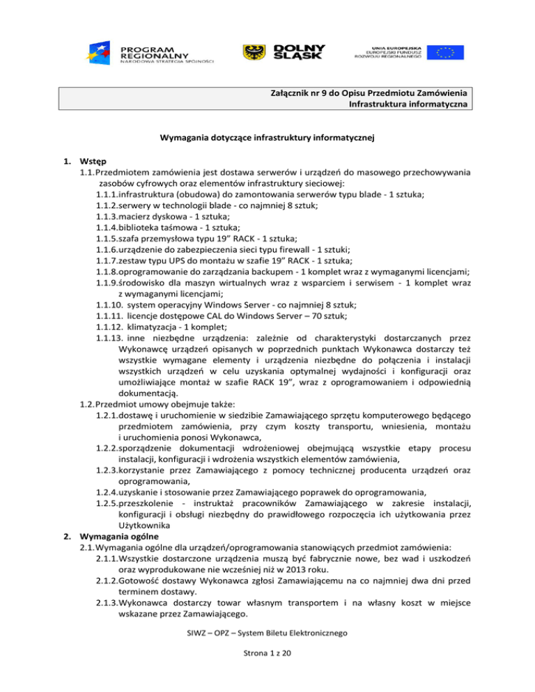 Załącznik nr 9 do Opisu Przedmiotu Zamówienia Infrastruktura informatyczna Wymagania dotyczące infrastruktury informatycznej 1. Wstęp 1.1. Przedmiotem zamówienia jest dostawa serwerów i urządzeń do masowego przechowywania zasobów cyfrowych oraz elementów infrastruktury sieciowej: 1.1.1.infrastruktura (obudowa) do zamontowania serwerów typu blade - 1 sztuka; 1.1.2.serwery w technologii blade - co najmniej 8 sztuk; 1.1.3.macierz dyskowa - 1 sztuka; 1.1.4.biblioteka taśmowa - 1 sztuka; 1.1.5.szafa przemysłowa typu 19” RACK - 1 sztuka; 1.1.6.urządzenie do zabezpieczenia sieci typu firewall - 1 sztuki; 1.1.7.zestaw typu UPS do montażu w szafie 19” RACK - 1 sztuka; 1.1.8.oprogramowanie do zarządzania backupem - 1 komplet wraz z wymaganymi licencjami; 1.1.9.środowisko dla maszyn wirtualnych wraz z wsparciem i serwisem - 1 komplet wraz z wymaganymi licencjami; 1.1.10. system operacyjny Windows Server - co najmniej 8 sztuk; 1.1.11. licencje dostępowe CAL do Windows Server – 70 sztuk; 1.1.12. klimatyzacja - 1 komplet; 1.1.13. inne niezbędne urządzenia: zależnie od charakterystyki dostarczanych przez Wykonawcę urządzeń opisanych w poprzednich punktach Wykonawca dostarczy też wszystkie wymagane elementy i urządzenia niezbędne do połączenia i instalacji wszystkich urządzeń w celu uzyskania optymalnej wydajności i konfiguracji oraz umożliwiające montaż w szafie RACK 19”, wraz z oprogramowaniem i odpowiednią dokumentacją. 1.2. Przedmiot umowy obejmuje także: 1.2.1.dostawę i uruchomienie w siedzibie Zamawiającego sprzętu komputerowego będącego przedmiotem zamówienia, przy czym koszty transportu, wniesienia, montażu i uruchomienia ponosi Wykonawca, 1.2.2.sporządzenie dokumentacji wdrożeniowej obejmującą wszystkie etapy procesu instalacji, konfiguracji i wdrożenia wszystkich elementów zamówienia, 1.2.3.korzystanie przez Zamawiającego z pomocy technicznej producenta urządzeń oraz oprogramowania, 1.2.4.uzyskanie i stosowanie przez Zamawiającego poprawek do oprogramowania, 1.2.5.przeszkolenie - instruktaż pracowników Zamawiającego w zakresie instalacji, konfiguracji i obsługi niezbędny do prawidłowego rozpoczęcia ich użytkowania przez Użytkownika 2. Wymagania ogólne 2.1. Wymagania ogólne dla urządzeń/oprogramowania stanowiących przedmiot zamówienia: 2.1.1.Wszystkie dostarczone urządzenia muszą być fabrycznie nowe, bez wad i uszkodzeń oraz wyprodukowane nie wcześniej niż w 2013 roku. 2.1.2.Gotowość dostawy Wykonawca zgłosi Zamawiającemu na co najmniej dwa dni przed terminem dostawy. 2.1.3.Wykonawca dostarczy towar własnym transportem i na własny koszt w miejsce wskazane przez Zamawiającego. SIWZ – OPZ – System Biletu Elektronicznego Strona 1 z 20 2.1.4.Dostarczony sprzęt musi posiadać wszystkie wymagane prawem polskim certyfikaty bezpieczeństwa. 2.1.5.Serwis musi być świadczony zgodnie z normą ISO 9001-2008 lub nowszą. 2.1.6.Wszystkie elementy zamówienia w momencie zakupu muszą być w pełni gotowe do pracy z systemami operacyjnymi Windows oraz Linux/Unix. Wykonawca dostarczy wszystkie potrzebne sterowniki oraz oprogramowanie na CD/DVD do działania urządzeń w systemach operacyjnych Windows oraz Linux/Unix. 2.1.7.Wszystkie urządzenia powinny być zgodne z normami UE w zakresie oznaczania sprzętu znakiem CE. 2.1.8.Urządzenia i ich komponenty muszą być oznakowane przez producentów w taki sposób, aby możliwa była bezproblemowa identyfikacja zarówno produktu jak i producenta. 2.1.9.Zależnie od charakterystyki danego urządzenia, Wykonawca zapewni zawarte w cenie zamówienia oraz dostarczy wszystkie inne pozostałe elementy oraz przewody niezbędne zarówno do prawidłowego zasilania, połączenia i współpracy tego urządzenia z maksymalną wydajnością z wszystkimi pozostałymi urządzeniami objętymi zamówieniem oraz do instalacji w szafie RACK 19” wraz z oprogramowaniem i odpowiednią dokumentacją. 2.1.10. Zależnie od charakterystyki danego urządzenia i jego funkcjonalności Wykonawca dostarczy wszystkie wymagane dodatkowe licencje o ile takie są wymagana celem spełniania wymienionych przez Zamawiającego wymagań. 2.1.11. Wykonawca w cenie zamówienia dostarczy Zamawiającemu wszelkie niezbędne nośniki instalacyjne wymagane podczas montażu, instalacji i konfiguracji wszystkich elementów zamówienia (oprócz systemów operacyjnych, które dostarczy Zamawiający). 2.2. Wymagane jest załączenie do oferty kart katalogowych producentów specyfikowanych urządzeń i oprogramowania, na podstawie których Zamawiający stwierdzi poprawność konfiguracji oraz zgodność zaoferowanego sprzętu z wymaganiami określonymi w opisie przedmiotu zamówienia. 2.3. Wykonawca przed terminem dostawy będzie współpracował z Zamawiającym celem uzgodnienia sposobu podłączenia wyspecyfikowanych w niniejszym zamówieniu urządzeń z urządzeniami i siecią posiadaną przez Zamawiającego (dotyczy to w szczególności okablowania sieciowego oraz zasilającego - podłączenie zasilania wykona Wykonawca prowadząc niezbędne okablowanie z szafy rozdzielni elektrycznej). Współpraca ta będzie dotyczyła również uzgodnienia konfiguracji oprogramowania w dostarczonych przez Wykonawcę urządzeniach. 2.4. W ramach etapu montażu, konfiguracji i wdrożenia Wykonawca będzie współpracował ze wskazaną przez Zamawiającego osobą. Współpraca w szczególności powinna obejmować m.in.: praktyczne przedstawienie konfiguracji oferowanego sprzętu, praktycznego przedstawienia spraw dotyczących montażu i wymiany podzespołów, diagnozowania awarii, instalacji i obsługi dostarczonego oprogramowania diagnostycznego i konfiguracyjnego. 2.5. W ramach etapu wdrożenia Wykonawca zobowiązany jest do opracowania w formie pisemnej procedur: 2.5.1.Wykonywania „kopii obrazów” serwerów Blade. 2.5.2.Wykonywania kopii bezpieczeństwa konfiguracji macierzy dyskowej i elementów aktywnych sieci. 2.5.3.Uruch