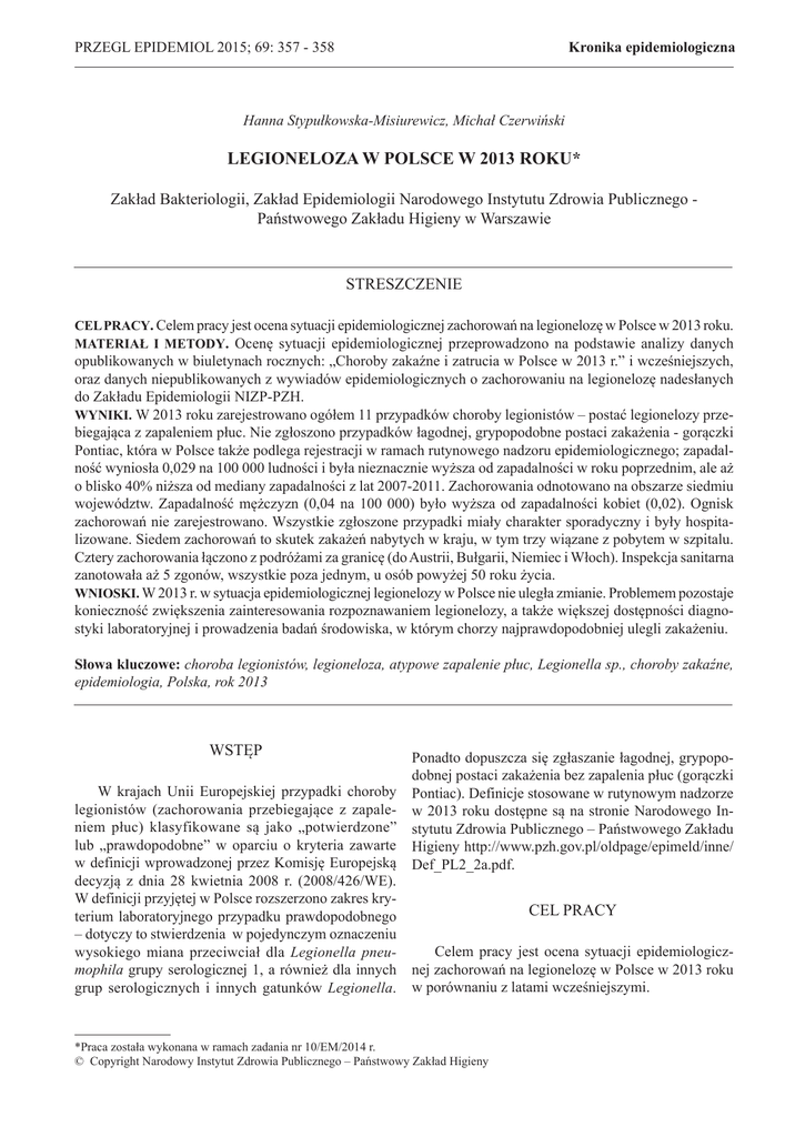 Kronika epidemiologiczna PRZEGL EPIDEMIOL 2015; 69: 357 - 358 Hanna Stypułkowska-Misiurewicz, Michał Czerwiński LEGIONELOZA W POLSCE W 2013 ROKU* Zakład Bakteriologii, Zakład Epidemiologii Narodowego Instytutu Zdrowia Publicznego Państwowego Zakładu Higieny w Warszawie STRESZCZENIE CEL PRACY. Celem pracy jest ocena sytuacji epidemiologicznej zachorowań na legionelozę w Polsce w 2013 roku. MATERIAŁ I METODY. Ocenę sytuacji epidemiologicznej przeprowadzono na podstawie analizy danych opublikowanych w biuletynach rocznych: „Choroby zakaźne i zatrucia w Polsce w 2013 r.” i wcześniejszych, oraz danych niepublikowanych z wywiadów epidemiologicznych o zachorowaniu na legionelozę nadesłanych do Zakładu Epidemiologii NIZP-PZH. WYNIKI. W 2013 roku zarejestrowano ogółem 11 przypadków choroby legionistów – postać legionelozy przebiegająca z zapaleniem płuc. Nie zgłoszono przypadków łagodnej, grypopodobne postaci zakażenia - gorączki Pontiac, która w Polsce także podlega rejestracji w ramach rutynowego nadzoru epidemiologicznego; zapadalność wyniosła 0,029 na 100 000 ludności i była nieznacznie wyższa od zapadalności w roku poprzednim, ale aż o blisko 40% niższa od mediany zapadalności z lat 2007-2011. Zachorowania odnotowano na obszarze siedmiu województw. Zapadalność mężczyzn (0,04 na 100 000) było wyższa od zapadalności kobiet (0,02). Ognisk zachorowań nie zarejestrowano. Wszystkie zgłoszone przypadki miały charakter sporadyczny i były hospitalizowane. Siedem zachorowań to skutek zakażeń nabytych w kraju, w tym trzy wiązane z pobytem w szpitalu. Cztery zachorowania łączono z podróżami za granicę (do Austrii, Bułgarii, Niemiec i Włoch). Inspekcja sanitarna zanotowała aż 5 zgonów, wszystkie poza jednym, u osób powyżej 50 roku życia. WNIOSKI. W 2013 r. w sytuacja epidemiologicznej legionelozy w Polsce nie uległa zmianie. Problemem pozostaje konieczność zwiększenia zainteresowania rozpoznawaniem legionelozy, a także większej dostępności diagnostyki laboratoryjnej i prowadzenia badań środowiska, w którym chorzy najprawdopodobniej ulegli zakażeniu. Słowa kluczowe: choroba legionistów, legioneloza, atypowe zapalenie płuc, Legionella sp., choroby zakaźne, epidemiologia, Polska, rok 2013 WSTĘP W krajach Unii Europejskiej przypadki choroby legionistów (zachorowania przebiegające z zapaleniem płuc) klasyfikowane są jako „potwierdzone” lub „prawdopodobne” w oparciu o kryteria zawarte w definicji wprowadzonej przez Komisję Europejską decyzją z dnia 28 kwietnia 2008 r. (2008/426/WE). W definicji przyjętej w Polsce rozszerzono zakres kryterium laboratoryjnego przypadku prawdopodobnego – dotyczy to stwierdzenia w pojedynczym oznaczeniu wysokiego miana przeciwciał dla Legionella pneumophila grupy serologicznej 1, a również dla innych grup serologicznych i innych gatunków Legionella. Ponadto dopuszcza się zgłaszanie łagodnej, grypopodobnej postaci zakażenia bez zapalenia płuc (gorączki Pontiac). Definicje stosowane w rutynowym nadzorze w 2013 roku dostępne są na stronie Narodowego Instytutu Zdrowia Publicznego – Państwowego Zakładu Higieny http://www.pzh.gov.pl/oldpage/epimeld/inne/ Def_PL2_2a.pdf. CEL PRACY Celem pracy jest ocena sytuacji epidemiologicznej zachorowań na legionelozę w Polsce w 2013 roku w porównaniu z latami wcześniejszymi. *Praca została wykonana w ramach zadania nr 10/EM/2014 r. © Copyright Narodowy Instytut Zdrowia Publicznego – Państwowy Zakład Higieny 358 Hanna Stypułkowska-Misiurewicz, Michał Czerwiński MATERIAŁY I METODY Oceniając sytuację epidemiologiczną zachorowań na legionelozę w Polsce w 2013 r. przeanalizowano dane z dwóch źródeł: - biuletynów rocznych „Choroby zakaźne i zatrucia w Polsce” za lata 2007-2013 (NIZP - PZH, GIS, Warszawa); - wywiadów epidemiologicznych o zachorowaniu na legionelozy w 2013, przesłanych do Zakładu Epidemiologii NIZP - PZH przez stacje sanitarno-epidemiologiczne. WYNIKI W 2013 roku zarejestrowano w Polsce ogółem 11 przypadków legionelozy przebiegającej z zapaleniem płuc tj. choroby legionistów (nie zgłoszono przypadków łagodnej, grypopodobnej postaci zakażenia - gorączki Pontiac), tj. o 1 przypadek więcej niż w 2011 r., ale aż o 7 mniej od mediany z lat 2007-2011 (tab. I). Zapadalność wyniosła 0,029 na 100 000 ludności, i była zbliżona do zapadalności w 2012 r. i aż o blisko 40% niższa od mediany zapadalności z lat 2007-2011. Zgłoszono wyłącznie zachorowania sporadyczne. Legionelozę odnotowano w podobnej liczbie województw (7) jak w roku poprzednim (6); najwięcej zachorowań (3) zgłoszono z woj. wielkopolskiego (zapadalność 0,087/100 000), ale największą zapadalność zanotowano w woj. warmińsko-mazurskim (0,138). W 9 województwach nie zarejestrowano żadnego zachorowania na legionelozę (tab. I). W 2013 r. blisko trzy czwarte przypadków zachorowań zostało zarejestrowanych zgodnie z definicja przyjętą na potrzeby nadzoru epidemiologicznego, jako przypadki potwierdzone – w 7 zachorowaniach wykryto antygen Legionella pneumophila w moczu, natomiast w 1 przypadku wykazano znamienny wzrost miana przeciwciał przeciw Legionella pneumophila grupy serologicznej 1 w badaniu dwóch próbek surowicy. Kryteria przypadku prawdopodobnego spełniło 3 chorych. Wszystkie zachorowania zakwalifikowane jako przypadki prawdopodobne zostały potwierdzone wykazaniem wysokiego miana swoistych przeciwciał w jednorazowym oznaczeniu. Najwięcej zachorowań wystąpiło w pierwszym i w drugim kwartale roku (odpowiednio: 4 i 3). Zapadalność mężczyzn (0,04 na 100 000) było wyższa od zapadalności kobiet (0,02). Chociaż wiek chorych wahał się od 14 do 71 lat, to wśród chorych dominowały osoby starsze, bardziej podatne na zachorowanie; w 2013 r. mediana wieku = 55 lat. Nr 2 Wszystkie zgłoszone zachorowania miały charakter sporadyczny, przebiegały z zapaleniem płuc i wymagał