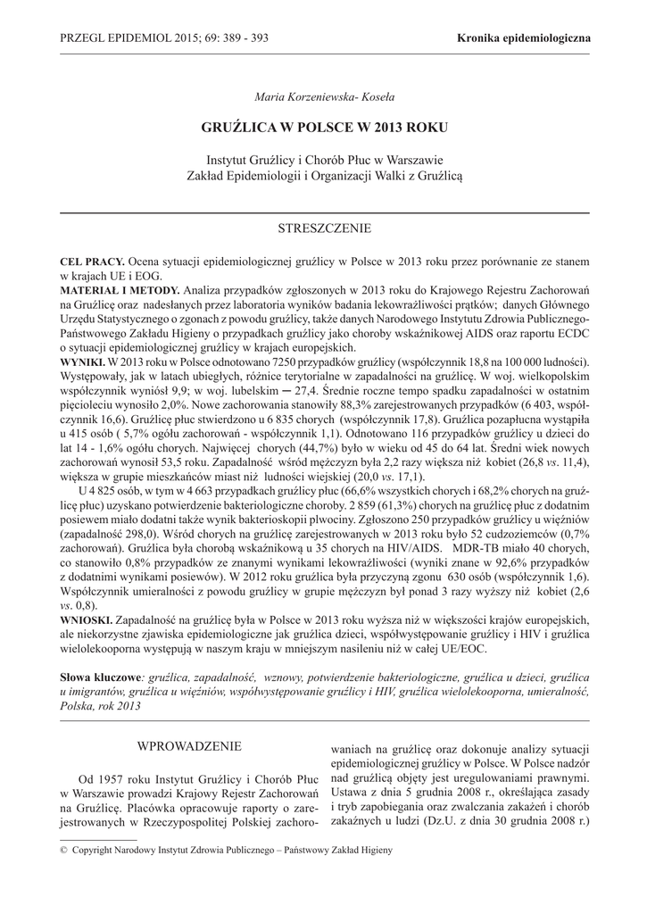 Kronika epidemiologiczna PRZEGL EPIDEMIOL 2015; 69: 389 - 393 Maria Korzeniewska- Koseła GRUŹLICA W POLSCE W 2013 ROKU Instytut Gruźlicy i Chorób Płuc w Warszawie Zakład Epidemiologii i Organizacji Walki z Gruźlicą STRESZCZENIE CEL PRACY. Ocena sytuacji epidemiologicznej gruźlicy w Polsce w 2013 roku przez porównanie ze stanem w krajach UE i EOG. MATERIAŁ I METODY. Analiza przypadków zgłoszonych w 2013 roku do Krajowego Rejestru Zachorowań na Gruźlicę oraz nadesłanych przez laboratoria wyników badania lekowrażliwości prątków; danych Głównego Urzędu Statystycznego o zgonach z powodu gruźlicy, także danych Narodowego Instytutu Zdrowia PublicznegoPaństwowego Zakładu Higieny o przypadkach gruźlicy jako choroby wskaźnikowej AIDS oraz raportu ECDC o sytuacji epidemiologicznej gruźlicy w krajach europejskich. WYNIKI. W 2013 roku w Polsce odnotowano 7250 przypadków gruźlicy (współczynnik 18,8 na 100 000 ludności). Występowały, jak w latach ubiegłych, różnice terytorialne w zapadalności na gruźlicę. W woj. wielkopolskim współczynnik wyniósł 9,9; w woj. lubelskim ─ 27,4. Średnie roczne tempo spadku zapadalności w ostatnim pięcioleciu wynosiło 2,0%. Nowe zachorowania stanowiły 88,3% zarejestrowanych przypadków (6 403, współczynnik 16,6). Gruźlicę płuc stwierdzono u 6 835 chorych (współczynnik 17,8). Gruźlica pozapłucna wystąpiła u 415 osób ( 5,7% ogółu zachorowań - współczynnik 1,1). Odnotowano 116 przypadków gruźlicy u dzieci do lat 14 - 1,6% ogółu chorych. Najwięcej chorych (44,7%) było w wieku od 45 do 64 lat. Średni wiek nowych zachorowań wynosił 53,5 roku. Zapadalność wśród mężczyzn była 2,2 razy większa niż kobiet (26,8 vs. 11,4), większa w grupie mieszkańców miast niż ludności wiejskiej (20,0 vs. 17,1). U 4 825 osób, w tym w 4 663 przypadkach gruźlicy płuc (66,6% wszystkich chorych i 68,2% chorych na gruźlicę płuc) uzyskano potwierdzenie bakteriologiczne choroby. 2 859 (61,3%) chorych na gruźlicę płuc z dodatnim posiewem miało dodatni także wynik bakterioskopii plwociny. Zgłoszono 250 przypadków gruźlicy u więźniów (zapadalność 298,0). Wśród chorych na gruźlicę zarejestrowanych w 2013 roku było 52 cudzoziemców (0,7% zachorowań). Gruźlica była chorobą wskaźnikową u 35 chorych na HIV/AIDS. MDR-TB miało 40 chorych, co stanowiło 0,8% przypadków ze znanymi wynikami lekowrażliwości (wyniki znane w 92,6% przypadków z dodatnimi wynikami posiewów). W 2012 roku gruźlica była przyczyną zgonu 630 osób (współczynnik 1,6). Współczynnik umieralności z powodu gruźlicy w grupie mężczyzn był ponad 3 razy wyższy niż kobiet (2,6 vs. 0,8). WNIOSKI. Zapadalność na gruźlicę była w Polsce w 2013 roku wyższa niż w większości krajów europejskich, ale niekorzystne zjawiska epidemiologiczne jak gruźlica dzieci, współwystępowanie gruźlicy i HIV i gruźlica wielolekooporna występują w naszym kraju w mniejszym nasileniu niż w całej UE/EOC. Słowa kluczowe: gruźlica, zapadalność, wznowy, potwierdzenie bakteriologiczne, gruźlica u dzieci, gruźlica u imigrantów, gruźlica u więźniów, współwystępowanie gruźlicy i HIV, gruźlica wielolekooporna, umieralność, Polska, rok 2013 WPROWADZENIE Od 1957 roku Instytut Gruźlicy i Chorób Płuc w Warszawie prowadzi Krajowy Rejestr Zachorowań na Gruźlicę. Placówka opracowuje raporty o zarejestrowanych w Rzeczypospolitej Polskiej zachoro- waniach na gruźlicę oraz dokonuje analizy sytuacji epidemiologicznej gruźlicy w Polsce. W Polsce nadzór nad gruźlicą objęty jest uregulowaniami prawnymi. Ustawa z dnia 5 grudnia 2008 r., określająca zasady i tryb zapobiegania oraz zwalczania zakażeń i chorób zakaźnych u ludzi (Dz.U. z dnia 30 grudnia 2008 r.) © Copyright Narodowy Instytut Zdrowia Publicznego – Państwowy Zakład Higieny 390 Nr 2 Maria Korzeniewska-Koseła i ustawy z dnia 13 lipca 2012 r. o zmianie ustawy o zapobieganiu oraz zwalczaniu zakażeń i chorób zakaźnych u ludzi oraz o Państwowej Inspekcji Sanitarnej (Dz.U. z dnia 03.08.2012 r.) nakładają na lekarzy i felczerów obowiązek zgłaszania zachorowań na gruźlicę. Przypadki zgłaszane są do Powiatowych Stacji Sanitarno-Epidemiologicznych lub państwowemu granicznemu inspektorowi sanitarnemu właściwemu dla miejsca rozpoznania lub państwowemu wojewódzkiemu inspektorowi sanitarnemu lub innym podmiotom właściwym ze względu na rodzaj choroby zakaźnej, zakażenia lub zgonu z powodu choroby zakaźnej. Wojewódzkie Stacje Sanitarno-Epidemiologiczne wysyłają formularze zgłoszeń zebrane w ciągu kwartału do Instytutu Gruźlicy i Chorób Płuc, który, na mocy umowy z Głównym Inspektoratem Sanitarnym, opracowuje raporty liczbowe o zarejestrowanych przypadkach. Krajowy Rejestr Zachorowań na Gruźlicę prowadzony jest w Zakładzie Epidemiologii i Organizacji Walki z Gruźlicą Instytutu. Cel pracy. Ocena sytuacji epidemiologicznej gruźlicy w Polsce w 2013 roku z uwzględnieniem zapadalności w grupach wieku i płci, udziału nowych zachorowań i wznów oraz gruźlicy płuc i pozapłucnej, odsetka przypadków potwierdzonych bakteriologicznie i zapadalności na gruźlicę z definitywnym potwierdzeniem, gruźlicy u imigrantów i więźniów, współwystępowania gruźlicy i HIV, rozpowszechnienia gruźlicy wielolekoopornej, umieralności i porównanie występujących zjawisk z sytuacją w krajach Unii Europejskiej i Europejskiego Obszaru Gospodarczego. MATERIAŁ I METODY Analiza danych zebranych z formularzy zgłoszenia podejrzenia lub rozpoznania gruźlicy (ZLK-2), dotyczących przypadków zgłoszonych w 2013 roku do Krajowego Rejestru Zachorowań na Gruźlicę, analiza wyników badania lekowrażliwości prątków uzyskanych z laboratoriów, danych Głównego Urzędu Statystycznego o zgonach według przyczyn, danych Narodowego Instytutu Zdrowia Publicznego- Państwowego Zakładu Higieny o przypadkach gruźlicy jako choroby 