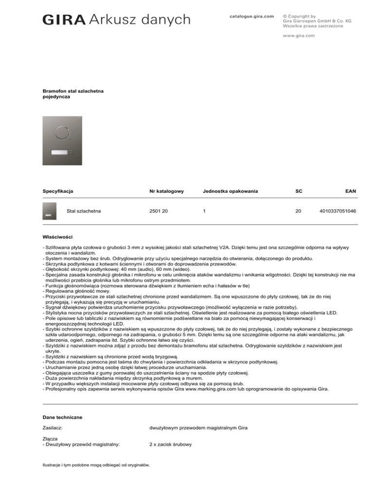 Arkusz danychń catalogue.gira.com © Copyright by Gira Giersiepen GmbH & Co. KG Wszelkie prawa zastrzeżone www.gira.com Bramofon stal szlachetna pojedyncza Specyfikacja Stal szlachetna Nr katalogowy Jednostka opakowania SC EAN 2501 20 1 20 4010337051046 Właściwości - Szlifowana płyta czołowa o grubości 3 mm z wysokiej jakości stali szlachetnej V2A. Dzięki temu jest ona szczególnie odporna na wpływy otoczenia i wandalizm. - System montażowy bez śrub. Odryglowanie przy użyciu specjalnego narzędzia do otwierania, dołączonego do produktu. - Skrzynka podtynkowa z kotwami ściennymi i otworami do doprowadzenia przewodów. - Głębokość skrzynki podtynkowej: 40 mm (audio), 60 mm (wideo). - Specjalna zasada konstrukcji głośnika i mikrofonu w celu uniknięcia ataków wandalizmu i wnikania wilgotności. Dzięki tej konstrukcji nie ma możliwości przebicia głośnika lub mikrofonu ostrym przedmiotem. - Funkcja głośnomówiąca (rozmowa sterowana dźwiękiem z tłumieniem echa i hałasów w tle) - Regulowana głośność mowy. - Przyciski przywoławcze ze stali szlachetnej chronione przed wandalizmem. Są one wpuszczone do płyty czołowej, tak że do niej przylegają, i wykazują się precyzją w uruchamianiu. - Sygnał dźwiękowy potwierdza uruchomienie przycisku przywoławczego (możliwość wyłączenia w razie potrzeby). - Stylistyka nocna przycisków przywoławczych ze stali szlachetnej. Oświetlenie jest realizowane za pomocą białego oświetlenia LED. - Pole opisowe lub tabliczki z nazwiskiem są równomiernie podświetlane na biało za pomocą niewymagającej konserwacji i energooszczędnej technologii LED. - Szybki ochronne szyldzików z nazwiskiem są wpuszczone do płyty czołowej, tak że do niej przylegają, i zostały wykonane z bezpiecznego szkła udaroodpornego, odpornego na zadrapania, o grubości 5 mm. Dzięki temu są one szczególnie odporne na ataki wandalizmu, jak uderzenia, ogień, zadrapania itd. Szybki ochronne łatwo się czyści. - Szyldziki z nazwiskiem można zdjąć z przodu bez demontażu bramofonu stal szlachetna. Odryglowanie szyldzików z nazwiskiem jest ukryte. - Szyldziki z nazwiskiem są chronione przed wodą bryzgową. - Podczas montażu pomocna jest taśma do chwytania i powierzchnia odkładania w skrzynce podtynkowej. - Uruchamianie przez jedną osobę dzięki łatwej procedurze uruchamiania. - Obiegająca uszczelka z gumy porowatej do uszczelnienia ściany na spodzie płyty czołowej. - Duża powierzchnia nakładania między skrzynką podtynkową a murem. - W przypadku większych instalacji mocowanie płyty czołowej odbywa się za pomocą śrub. - Profesjonalny opis zapewnia serwis wykonywania opisów Gira www.marking.gira.com lub oprogramowanie do opisywania Gira. Dane techniczne Zasilacz: dwużyłowym przewodem magistralnym Gira Złącza - Dwużyłowy przewód magistralny: 2 x zacisk śrubowy Ilustracje i tym podobne mogą odbiegać od oryginałów. Arkusz danychń catalogue.gira.com © Copyright by Gira Giersiepen GmbH & Co. KG Wszelkie prawa zastrzeżone www.gira.com - Zasilanie dodatkowe: - Przewód łączący: - Wideo: 2 x zacisk śrubowy 2 x listwa wtyczkowa 1 x listwa wtyczkowa Temperatura otoczenia: -25 °C do +70 °C Stopień ochrony: IP44 Wskazówki - Bramofon ze stali szlachetnej jest gotowy do podłączenia łącznie z głośnikiem do zabudowy. Dzięki temu odpada czasochłonne oprzewodowanie przycisków wywołania. Do bramofonu ze stali szlachetnej wymagane jest tylko podłączenie 2-żyłowego przewodu magistrali Gira. Wymiary w mm Płyta czołowa pojedyncza: Płyta czołowa podwójna: Płyta czołowa potrójna: Płyta czołowa poczwórna: Płyta czołowa sześciokrotna: Płyta czołowa ośmiokrotna: Płyta czołowa dziewięciokrotna: Skrzynka podtynkowa pojedyncza: Skrzynka podtynkowa podwójna: Skrzynka podtynkowa potrójna: Skrzynka podtynkowa poczwórna: Skrzynka podtynkowa sześciokrotna: Skrzynka podtynkowa ośmiokrotna: Skrzynka podtynkowa dziewięciokrotna: Szyldzik z nazwiskiem: S 160 S 160 S 160 S 160 S 160 S 160 S 160 S 140 S 140 S 140 S 140 S 140 S 140 S 140 S 62 Ilustracje i tym podobne mogą odbiegać od oryginałów. W 218 W 218 W 218 W 285 W 285 W 352 W 352 W 198 W 198 W 198 W 265 W 265 W 332 W 332 W 18 GGGGGGGG 40 G 40 G 40 G 40 G 40 G 40 G 40 G-