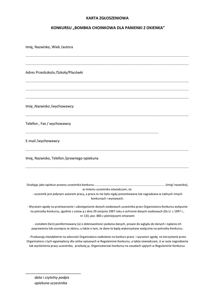 KARTA ZGŁOSZENIOWA KONKURSU „BOMBKA CHOINKOWA DLA PANIENKI Z OKIENKA” Imię, Nazwisko, Wiek /autora ……………………………………………………………………………………………………………………………………………………………………………………………….. ……………………………………………………………………………………………………………………………………………………………………………………………….. Adres Przedszkola /Szkoły/Placówki ……………………………………………………………………………………………………………………………………………………………………………………………….. ……………………………………………………………………………………………………………………………………………………………………………………………….. ……………………………………………………………………………………………………………………………………………………………………………………………….. Imię ,Nazwisko /wychowawcy ……………………………………………………………………………………………………………………………………………………………………………………………….. Telefon , Fax / wychowawcy ……………………………………………………………………………………………………………………………………………………………. E-mail /wychowawcy ……………………………………………………………………………………………………………………………………………………………………………………………….. Imię, Nazwisko, Telefon /prawnego opiekuna ……………………………………………………………………………………………………………………………………………………………………………………………….. Działając jako opiekun prawny uczestnika konkursu …………………………………...……….………………………………….. (imię/ nazwisko), w imieniu uczestnika oświadczam, że: - uczestnik jest jedynym autorem pracy, a praca ta nie była nigdy prezentowana lub nagradzana w żadnych innych konkursach i wystawach. - Wyrażam zgodę na przetwarzanie i udostępnianie danych osobowych uczestnika przez Organizatora Konkursu wyłącznie na potrzeby Konkursu, zgodnie z ustaw ą z dnia 29 sierpnia 1997 roku o ochronie danych osobowych (Dz.U. z 1997 r., nr 133, poz. 883 z późniejszymi zmianami - zostałem (łam) poinformowany (a) o dobrowolności podania danych, prawie do wglądu do danych i żądania ich poprawienia lub usunięcia ze zbioru, a także o tym, że dane te będą wykorzystane wyłącznie na potrzeby Konkursu. - Przekazuję nieodpłatnie na własność Organizatora nadesłane na konkurs prace i wyrażam zgodę na korzystanie przez Organizatora z tych egzemplarzy dla celów opisanych w Regulaminie Konkursu, a także oświadczam, iż w razie nagrodzenia lub wyróżnienia pracy uczestnika, przekażę ją Organizatorowi konkursu na zasadach ujętych w Regulaminie Konkursu. ____________________________ data i czytelny podpis opiekuna uczestnika