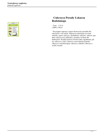 Tytuł główny nagłówka podtytuł nagłówka Cukrzyca Porady Lekarza Rodzinnego Cena: 3.33 zł (-15%) 3.90 zł Przystępnie napisany, bogato ilustrowany poradnik dla cukrzyków i ich rodzin. Najnowsze informacje na temat choroby, typów cukrzycy, profilaktyki, zakazów, zaleceń, opis diety cukrzycowej, jadłospisy i przepisy na dania dla diabetyków. Książka porusza również takie zagadnienia, jak np. cukrzyca a ciąża, cukrzyca a prowadzenie pojazdu, cukrzyca a antykoncepcja, cukrzyca a alkohol, cukrzyca a wybór zawodu. 1/1 Powered by TCPDF (www.tcpdf.org)