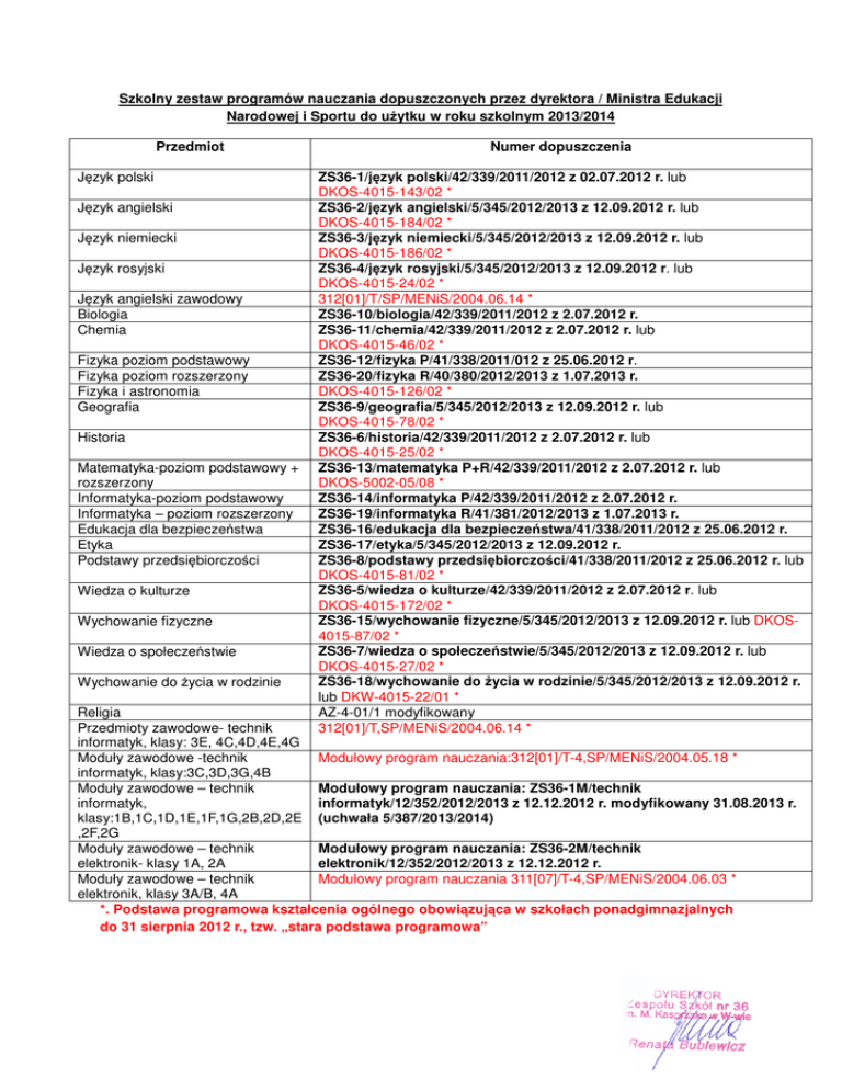 Szkolny zestaw programów nauczania dopuszczonych przez dyrektora / Ministra Edukacji Narodowej i Sportu do użytku w roku szkolnym 2013/2014 Przedmiot Język polski Język angielski Język niemiecki Język rosyjski Język angielski zawodowy Biologia Chemia Fizyka poziom podstawowy Fizyka poziom rozszerzony Fizyka i astronomia Geografia Historia Matematyka-poziom podstawowy + rozszerzony Informatyka-poziom podstawowy Informatyka – poziom rozszerzony Edukacja dla bezpieczeństwa Etyka Podstawy przedsiębiorczości Wiedza o kulturze Wychowanie fizyczne Wiedza o społeczeństwie Wychowanie do życia w rodzinie Numer dopuszczenia ZS36-1/język polski/42/339/2011/2012 z 02.07.2012 r. lub DKOS-4015-143/02 * ZS36-2/język angielski/5/345/2012/2013 z 12.09.2012 r. lub DKOS-4015-184/02 * ZS36-3/język niemiecki/5/345/2012/2013 z 12.09.2012 r. lub DKOS-4015-186/02 * ZS36-4/język rosyjski/5/345/2012/2013 z 12.09.2012 r. lub DKOS-4015-24/02 * 312[01]/T/SP/MENiS/2004.06.14 * ZS36-10/biologia/42/339/2011/2012 z 2.07.2012 r. ZS36-11/chemia/42/339/2011/2012 z 2.07.2012 r. lub DKOS-4015-46/02 * ZS36-12/fizyka P/41/338/2011/012 z 25.06.2012 r. ZS36-20/fizyka R/40/380/2012/2013 z 1.07.2013 r. DKOS-4015-126/02 * ZS36-9/geografia/5/345/2012/2013 z 12.09.2012 r. lub DKOS-4015-78/02 * ZS36-6/historia/42/339/2011/2012 z 2.07.2012 r. lub DKOS-4015-25/02 * ZS36-13/matematyka P+R/42/339/2011/2012 z 2.07.2012 r. lub DKOS-5002-05/08 * ZS36-14/informatyka P/42/339/2011/2012 z 2.07.2012 r. ZS36-19/informatyka R/41/381/2012/2013 z 1.07.2013 r. ZS36-16/edukacja dla bezpieczeństwa/41/338/2011/2012 z 25.06.2012 r. ZS36-17/etyka/5/345/2012/2013 z 12.09.2012 r. ZS36-8/podstawy przedsiębiorczości/41/338/2011/2012 z 25.06.2012 r. lub DKOS-4015-81/02 * ZS36-5/wiedza o kulturze/42/339/2011/2012 z 2.07.2012 r. lub DKOS-4015-172/02 * ZS36-15/wychowanie fizyczne/5/345/2012/2013 z 12.09.2012 r. lub DKOS4015-87/02 * ZS36-7/wiedza o społeczeństwie/5/345/2012/2013 z 12.09.2012 r. lub DKOS-4015-27/02 * ZS36-18/wychowanie do życia w rodzinie/5/345/2012/2013 z 12.09.2012 r. lub DKW-4015-22/01 * AZ-4-01/1 modyfikowany 312[01]/T,SP/MENiS/2004.06.14 * Religia Przedmioty zawodowe- technik informatyk, klasy: 3E, 4C,4D,4E,4G Moduły zawodowe -technik Modułowy program nauczania:312[01]/T-4,SP/MENiS/2004.05.18 * informatyk, klasy:3C,3D,3G,4B Modułowy program nauczania: ZS36-1M/technik Moduły zawodowe – technik informatyk/12/352/2012/2013 z 12.12.2012 r. modyfikowany 31.08.2013 r. informatyk, klasy:1B,1C,1D,1E,1F,1G,2B,2D,2E (uchwała 5/387/2013/2014) ,2F,2G Modułowy program nauczania: ZS36-2M/technik Moduły zawodowe – technik elektronik/12/352/2012/2013 z 12.12.2012 r. elektronik- klasy 1A, 2A Moduły zawodowe – technik Modułowy program nauczania 311[07]/T-4,SP/MENiS/2004.06.03 * elektronik, klasy 3A/B, 4A *. Podstawa programowa kształcenia ogólnego obowiązująca w szkołach ponadgimnazjalnych do 31 sierpnia 2012 r., tzw. „stara podstawa programowa”
