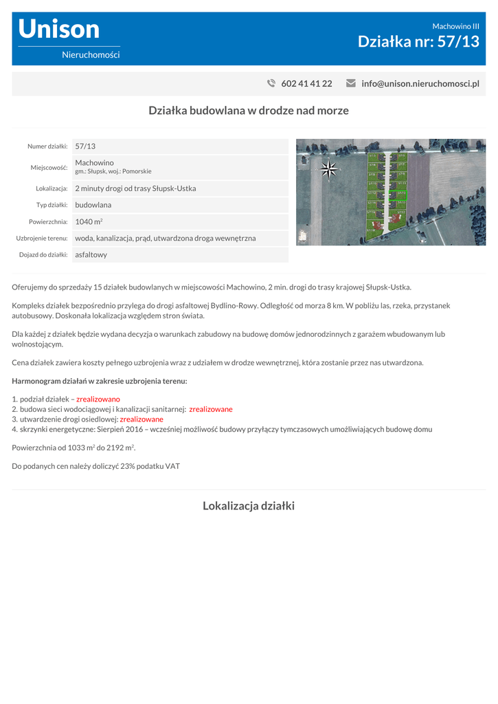 Unison Machowino III Działka nr: 57/13 Nieruchomości 602 41 41 22 [email protected] Działka budowlana w drodze nad morze Numer działki: Miejscowość: 57/13 Machowino gm.: Słupsk, woj.: Pomorskie Lokalizacja: 2 minuty drogi od trasy Słupsk-Ustka Typ działki: budowlana Powierzchnia: Uzbrojenie terenu: Dojazd do działki: 1040 m2 woda, kanalizacja, prąd, utwardzona droga wewnętrzna asfaltowy Oferujemy do sprzedaży 15 działek budowlanych w miejscowości Machowino, 2 min. drogi do trasy krajowej Słupsk-Ustka. Kompleks działek bezpośrednio przylega do drogi asfaltowej Bydlino-Rowy. Odległość od morza 8 km. W pobliżu las, rzeka, przystanek autobusowy. Doskonała lokalizacja względem stron świata. Dla każdej z działek będzie wydana decyzja o warunkach zabudowy na budowę domów jednorodzinnych z garażem wbudowanym lub wolnostojącym. Cena działek zawiera koszty pełnego uzbrojenia wraz z udziałem w drodze wewnętrznej, która zostanie przez nas utwardzona. Harmonogram działań w zakresie uzbrojenia terenu: 1. podział działek – zrealizowano 2. budowa sieci wodociągowej i kanalizacji sanitarnej: zrealizowane 3. utwardzenie drogi osiedlowej: zrealizowane 4. skrzynki energetyczne: Sierpień 2016 – wcześniej możliwość budowy przyłączy tymczasowych umożliwiających budowę domu Powierzchnia od 1033 m2 do 2192 m2. Do podanych cen należy doliczyć 23% podatku VAT Lokalizacja działki