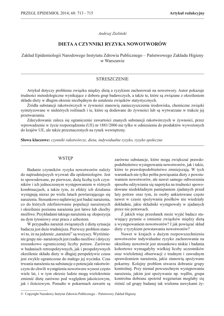 Artykuł redakcyjny PRZEGL EPIDEMIOL 2014; 68: 713 - 715 Andrzej Zieliński DIETA A CZYNNIKI RYZYKA NOWOTWORÓW Zakład Epidemiologii Narodowego Instytutu Zdrowia Publicznego – Państwowego Zakładu Higieny w Warszawie STRESZCZENIE Artykuł dotyczy problemu związku między dietą a ryzykiem zachorowań na nowotwory. Autor pokazuje trudności metodologiczne wynikające z doboru grup badawczych, a także te, które są związane z określeniem składu diety w długim okresie niezbędnym do ustalenia związków statystycznych. Źródła substancji rakotwórczych w żywności stanowią zanieczyszczenia środowiska, chemiczne związki syntetyzowane w niektórych roślinach i te, które są dodawane do żywności lub są wytwarzane w trakcie jej przetwarzania. Zdecydowanie zaleca się ograniczenie zawartości znanych substancji rakotwórczych w żywności, przez wprowadzenie w życie rozporządzenia (UE) nr 1881/2006 nie tylko w odniesieniu do produktów wywożonych do krajów UE, ale także przeznaczonych na rynek wewnętrzny. Słowa kluczowe: czynniki rakotwórcze, dieta, indywidualne ryzyko, ryzyko społeczne WSTĘP Badanie czynników ryzyka nowotworów należy do najtrudniejszych wyzwań dla epidemiologów. Jest to spowodowane, po pierwsze, dużą liczbą tych czynników i ich jednoczesnym występowaniem w różnych kombinacjach, a także tym, że efekty ich działania występują nieraz po wielu latach powtarzającego się narażenia. Stosunkowo najłatwiej jest badać narażenia, co do których zdefiniowanie populacji narażonych i określenie poziomu narażenia jest łatwe lub choćby możliwe. Przykładami takiego narażenia są: ekspozycja na dym tytoniowy oraz praca z azbestem. W przypadku narażeń związanych z dietą sytuacja badacza jest dużo trudniejsza. Pierwszy problem stanowi to, że na jedzenie „narażeni” są wszyscy. Wyróżnienie grupy nie- narażonych jest rzadko możliwe i dotyczy stosunkowo ograniczonej liczby potraw. Zarówno w badaniach retrospektywnych, jak i prospektywnych określenie składu diety w długiej perspektywie czasu jest zwykle ograniczone do małego jej wycinka. Czas trwania narażenia na substancje o potencjale rakotwórczym do chwili wystąpienia nowotworu wynosi często wiele lat, i w tym okresie ludzie mogą wielokrotnie zmienić dietę zarówno pod względem jakościowym, jak i ilościowym. Ponadto w pokarmach zawarte są zarówno substancje, które mogą zwiększać prawdopodobieństwo występowania nowotworów, jak i takie, które to prawdopodobieństwo zmniejszają. W tych warunkach nie tylko próba powiązania diety z powstawaniem nowotworów, ale nawet samego odtworzenia sposobu odżywiania się napotyka na trudności spowodowane niedokładnym pamiętaniem zjadanych przed laty potraw oraz tym, że osoby ankietowane często nawet w czasie spożywania posiłków nie wiedziały dokładnie, jakie składniki występowały w zjadanych przez nie potrawach. Z jakich więc przesłanek może wyjść badacz stawiający pytanie o istnienie związków między dietą a występowaniem nowotworów? I jak powiązać skład diety z ryzykiem powstawania nowotworów? Nawet w krajach o dużym rozpowszechnieniu nowotworów indywidualne ryzyko zachorowania na określony nowotwór jest stosunkowo niskie i badania kohortowe wymagałyby wielkiej liczby uczestników oraz wieloletniej obserwacji z trudnym i zawodnym sprawdzaniem narażenia, jakie stanowią spożywane pokarmy. Kolejny problem stwarza dobranie grupy kontrolnej. Przy niemal powszechnym występowaniu narażenia, jakim jest spożywanie np. wędlin, grupa kontrolna dobrana spośród wegetarian mogłaby się różnić od grupy badanej tak wieloma nawykami ży- © Copyright Narodowy Instytut Zdrowia Publicznego – Państwowy Zakład Higieny 714 Andrzej Zieliński wieniowymi, a także innymi cechami, że wybranie do analizy jednej określonej zmiennej budziłoby wiele metodologicznych zastrzeżeń. Są jednak dane, które pośrednio wskazują na związek między rozpowszechnieniem nowotworów w danej populacji a dominującymi w tej populacji obyczajami żywieniowymi. Mianowicie różne populacje zamieszkujące różne obszary geograficzne i różniące się zwyczajami żywieniowymi wykazują dość znaczne różnice w występowaniu różnych typów nowotworów. Nie można tych związków traktować jako dowód, ze względu na możliwość występowania tzw. „błędu ekologicznego”. W populacjach o dużym rozpowszechnieniu narażenia i dużym rozpowszechnieniu choroby, narażenie nie musi koniecznie dotyczyć tych samych osób, u których występuje choroba. Ale mając powyższe wstępne dane jest już łatwiej zbadać to indywidualne powiązanie w badaniach kliniczno-kontrolnych traktując jako zmienną nawet nie sam fakt spożywania danego typu potrawy, ale oszacowany poziom spożycia. Nawet jeżeli uznamy, że tak uzyskana wiedza ma ograniczone prawdopodobieństwo, wnioski dla zdrowia publicznego i działania zapobiegawcze powinny zawsze stać po stronie zapobiegania chorobom, a nie po stronie interesów grupowych producentów żywności. Po stronie przeciwnej jest jednak argument, którego lekceważyć nie należy. Ludzie, którzy wszystkie wątpliwości chcą wykorzystać do pozostania przy szkodliwej dla nich diecie, mają do tego prawo. Tak jak ma to miejsce w przypadku palenia papierosów, których szkodliwe efekty w stosunku do nowotworów i chorób serca są dowiedzione ponad wszelką wątpliwość, jednak nie ma prawnych ani moralnych podstaw, aby osobie dorosłej zabronić palenia. Co najwyżej można promować niepalenie papierosów i zakazywać palenia tam, gdzie dym może oddziaływać na inne niepalące osoby. Podobnie potrawy zawierające w odpowiednio dużych stężeniach substancje, których efekt karcinogenny został dowiedziony z wysokim stopniem prawdopodobieństwa, powinny być oznakowane, jako powodujące zagrożenie zachorowaniem na nowotwór. I zdecydowanie nie powinny być 