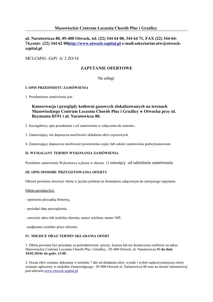 zapytanie ofertowe konserwacja kotłowni gazowych 2 ZO 2016