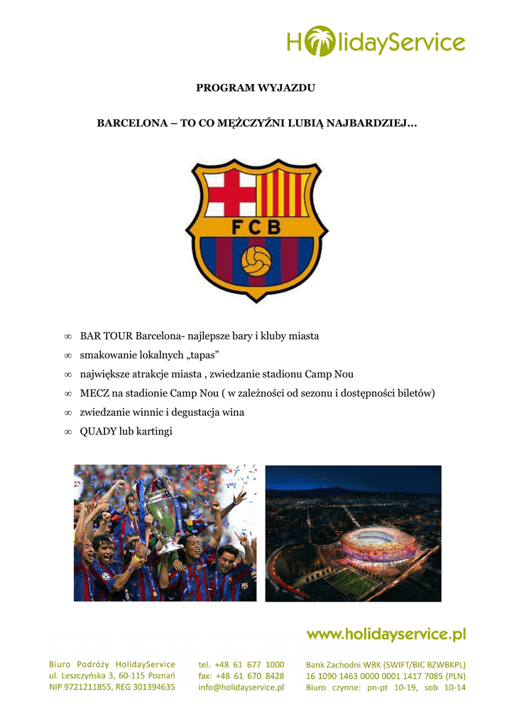 PROGRAM WYJAZDU BARCELONA – TO CO MĘŻCZYŹNI LUBIĄ NAJBARDZIEJ... • BAR TOUR Barcelona- najlepsze bary i kluby miasta • smakowanie lokalnych „tapas” • największe atrakcje miasta , zwiedzanie stadionu Camp Nou • MECZ na stadionie Camp Nou ( w zależności od sezonu i dostępności biletów) • zwiedzanie winnic i degustacja wina • QUADY lub kartingi Świadczenia: • przelot samolotem z lokalnego lotniska w Polsce do Barcelony • realizacja programu wg życzenia grupy • zakwaterowanie w hotelu, pełne wyżywienie • transfery • opieka pilota grupy • ubezpieczenie
