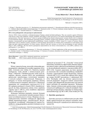 PATOGENNOÆ WIRUSÓW RNA A ZJAWISKO QUASISPECIES POST. MIKROBIOL., 2009, 48, 4, 255265 http://www.pm.microbiology.pl Iwona Bukowska*, Marek Radkowski Zak³ad Immunopatologii Chorób Zakanych i Paso¿ytniczych, Warszawski Uniwersytet Medyczny, ul. Pawiñskiego 3c, 02-106 Warszawa Wp³ynê³o w listopadzie 2009 r. 1. Wstêp. 2. Zjawisko quasispecies. 2.1. Mechanizmy powstawania zmiennoci. 3. Konsekwencje kliniczne zjawiska quasispecies. 3.1. Unikanie odpowiedzi uk³adu immunologicznego. 3.2. Opornoæ na leki. 3.3. Wzrost wirulencji, zmiana tropizmu. 3.4. Szczepionki przeciwwirusowe. 4. Techniki badawcze. 5. Podsumowanie RNA virus pathogenicity and quasispecies phenomenon Abstract: RNA viruses constitute a widespread group of human, animal and plant pathogens. They are causative agents of diseases with diverse course and symptoms. Genetic instability and ability to form quasispecies are features determining their pathogenesis and persistence. The term quasispecies refers to a group of different but closely related genetic variants which evolve in response to environmental changes. The mechanisms generating genetic variability include point mutations, genetic rearrangements (recombination, reassortment) and post-replicational modifications. Genetic instability of RNA viruses is a source of serious clinical implications such as immune evasion, resistance to antiviral drugs and increase of virulence due to alterations in cell tropism, host range and gene expression patterns. For these reasons, effective and safe vaccines as well as the development of more tolerable drugs is still a challenge. The best known quasispecies representatives are human immunodeficiency virus (HIV), influenza virus and hepatitis C virus (HCV). 1. Introduction. 2. quasispecies phenomenon. 2.1. Diversity mechanisms. 3. Clinical implications of the quasispecies phenomenon. 3.1. Immune evasion. 3.2. Resistance to antiviral drugs. 3.3. Increase of virulence, alterations in cell tropism. 3.4. Antiviral vaccines. 4. Research techniques. 5. Sumary S³owa kluczowe: wirusy RNA, zmiennoæ genetyczna, quasispecies Key words: RNA viruses, genetic diversity, quasispecies 1. Wstêp Wirusy stanowi¹ liczn¹, niezwykle ró¿norodn¹ grupê patogenów zaka¿aj¹cych wszystkie organizmy ¿ywe: ludzi, zwierzêta oraz roliny [1]. Stanowi¹ czynnik etiologiczny wielu chorób o zró¿nicowanym przebiegu i objawach. Charakterystyczn¹ cech¹ tych patogenów, g³ównie wirusów RNA jest niestabilnoæ genetyczna, umo¿liwiaj¹ca wytworzenie mutantów o nowych cechach i w³aciwociach. Wykazano, i¿ patogeny te tworz¹ heterogenn¹ populacjê z³o¿on¹ z zró¿nicowanych wariantów obecnych w zaka¿onym organizmie tzw. pseudotypów (quasispecies) [25]. Do najlepiej poznanych wirusów RNA charakteryzuj¹cych siê du¿¹ zmiennoci¹ nale¿¹ wirus zapalenia w¹troby typu C (HCV), wirus niedoboru odpornoci (HIV) i wirus grypy [27]. Wykazano zale¿noæ pomiêdzy ró¿nymi formami quasispecies, a powa¿nymi konsekwencjami klinicznymi wywo³anymi przez te wirusy. Obejmuje ona wyselekcjonowanie mutantów unikaj¹cych odpowiedzi uk³adu immunologicznego, nieuchwytnych dla potencjalnych szczepionek, zmieniaj¹cych tropizm komórkowy, zasiêg gospodarza, poziom wirulencji czy te¿ opornych na leczenie [79]. Ucieczka wirusa przed humoraln¹ i komórkow¹ odpowiedzi¹ obronn¹ organizmu stanowi jeden z g³ównych mechanizmów prowadz¹cy do przechodzenia zaka¿eñ w stan przewlek³y (HCV, HIV) [10]. Czêstoæ pojawiania siê form opornych na stosowane leki wymusi³a modyfikacjê standardów leczenia i wprowadzenia terapii skojarzonej, z³o¿onej z dwóch (HCV) [11], trzech lub wiêkszej iloci leków, np. terapia HAART prowadzona w zaka¿eniach HIV [12]. Niezbêdne sta³o siê równie¿ opracowywanie nowych preparatów mog¹cych znaleæ zastosowanie w terapii, gdy¿ d³ugotrwa³e przyjmowanie tych samych leków prowadzi do narastania opornoci. Wykazano tak¿e, istnienie zró¿nicowania genetycznego szczepów wirusowych replikuj¹cych w ró¿nych narz¹dach i tkankach tego samego pacjenta, wskazuj¹c na zmianê tropizmu komórkowego, np. HCV, HIV, wirus winki [1014]. 2. Zjawisko quasispecies Zjawisko quasispecies definiowanie jest jako zbiór blisko spokrewnionych ale ró¿nych wariantów molekularnych obecnych w pojedynczym zaka¿onym organizmie [4]. * Autor korespondencyjny: Zak³ad Immunopatologii Chorób Zakanych i Paso¿ytniczych, Warszawski Uniwersytet Medyczny, ul. Pawiñskiego 3c 02-106 Warszawa; tel. (22) 57 20 709, e-mail: [email protected] 256 IWONA BUKOWSKA, MAREK RADKOWSKI Po raz pierwszy zjawisko zmiennoci przedstawione zosta³o w 1971 roku przez M a n f r e d a E i g e n a [15]. Wysuniêta przez niego teoria, nazwana póniej przez S c h u s t e r a terminem quasispecies, dotyczy³a grupy samoreplikuj¹cych siê, blisko spokrewnionych lecz ró¿ni¹cych siê miêdzy sob¹ cz¹stek, ewoluuj¹cych wobec zmieniaj¹cych siê warunków rodowiska [16]. Wykazano, i¿ sformu³owan¹ przez E i g e n a teoriê mo¿na odnieæ do zjawisk zachodz¹cych w ewolucji m. in. faga Q$ [17] oraz wirusów RNA [18]. Spe³niaj¹ one bowiem wiêkszoæ za³o¿eñ teorii quasispecies takich jak odpowiednia: wielkoæ populacji (wystarczaj¹co du¿a aby móc zdominowaæ zajmowan¹ przestrzeñ) oraz czêstotliwoæ mutacji (wystarczaj¹co wysoka aby wygenerowaæ heterogenn¹ populacjê mutantów o stale zachowanej podstawowej sekwencji) [19]. Bardziej trafne wydaje siê natomiast ujêcie genomu wirusów RNA jako pewien zbiór zró¿nicowanych i specyficznych a nie pojedynczych sekwencji [17]. Poziom zró¿nicowania wirusowych form quasispecies zale¿y od czêstoci zachodz¹cych w genomie mutacji jak równie¿ od ró¿nych czynników wewnêtrznych (charakter wprowadzanych mutacji oraz oddzia³ywania pomiêdzy ró¿nymi sk³adowymi populacji) i zewnêtrznych (presja rodowiska) kszta³tuj¹cych populacjê [20]. W wyniku zmiennoci powstaj¹ wiêc stale nowe formy quasispecies po