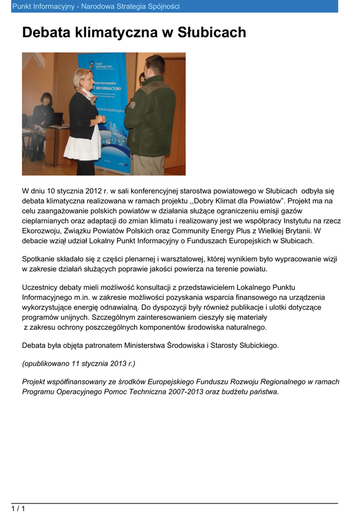 Punkt Informacyjny - Narodowa Strategia Spójności Debata klimatyczna w Słubicach W dniu 10 stycznia 2012 r. w sali konferencyjnej starostwa powiatowego w Słubicach odbyła się debata klimatyczna realizowana w ramach projektu ,,Dobry Klimat dla Powiatów”. Projekt ma na celu zaangażowanie polskich powiatów w działania służące ograniczeniu emisji gazów cieplarnianych oraz adaptacji do zmian klimatu i realizowany jest we współpracy Instytutu na rzecz Ekorozwoju, Związku Powiatów Polskich oraz Community Energy Plus z Wielkiej Brytanii. W debacie wziął udział Lokalny Punkt Informacyjny o Funduszach Europejskich w Słubicach. Spotkanie składało się z części plenarnej i warsztatowej, której wynikiem było wypracowanie wizji w zakresie działań służących poprawie jakości powierza na terenie powiatu. Uczestnicy debaty mieli możliwość konsultacji z przedstawicielem Lokalnego Punktu Informacyjnego m.in. w zakresie możliwości pozyskania wsparcia finansowego na urządzenia wykorzystujące energię odnawialną. Do dyspozycji były również publikacje i ulotki dotyczące programów unijnych. Szczególnym zainteresowaniem cieszyły się materiały z zakresu ochrony poszczególnych komponentów środowiska naturalnego. Debata była objęta patronatem Ministerstwa Środowiska i Starosty Słubickiego. (opublikowano 11 stycznia 2013 r.) Projekt współfinansowany ze środków Europejskiego Funduszu Rozwoju Regionalnego w ramach Programu Operacyjnego Pomoc Techniczna 2007-2013 oraz budżetu państwa. 1/1