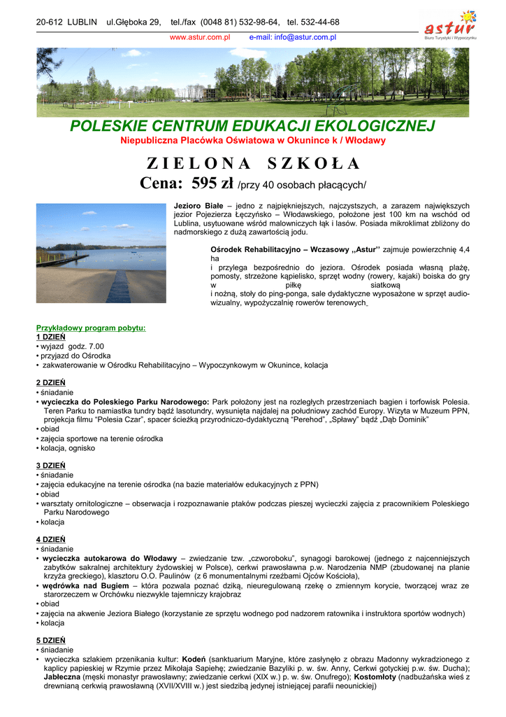 20-612 LUBLIN ul.Głęboka 29, tel./fax (0048 81) 532-98-64, tel. 532-44-68 www.astur.com.pl e-mail: [email protected] POLESKIE CENTRUM EDUKACJI EKOLOGICZNEJ Niepubliczna Placówka Oświatowa w Okunince k / Włodawy ZIELONA SZKOŁA Cena: 595 zł /przy 40 osobach płacących/ Jezioro Białe – jedno z najpiękniejszych, najczystszych, a zarazem największych jezior Pojezierza Łęczyńsko – Włodawskiego, położone jest 100 km na wschód od Lublina, usytuowane wśród malowniczych łąk i lasów. Posiada mikroklimat zbliżony do nadmorskiego z dużą zawartością jodu. Ośrodek Rehabilitacyjno – Wczasowy ,,Astur’’ zajmuje powierzchnię 4,4 ha i przylega bezpośrednio do jeziora. Ośrodek posiada własną plażę, pomosty, strzeżone kąpielisko, sprzęt wodny (rowery, kajaki) boiska do gry w piłkę siatkową i nożną, stoły do ping-ponga, sale dydaktyczne wyposażone w sprzęt audiowizualny, wypożyczalnię rowerów terenowych Przykładowy program pobytu: 1 DZIEŃ • wyjazd godz. 7.00 • przyjazd do Ośrodka • zakwaterowanie w Ośrodku Rehabilitacyjno – Wypoczynkowym w Okunince, kolacja 2 DZIEŃ • śniadanie • wycieczka do Poleskiego Parku Narodowego: Park położony jest na rozległych przestrzeniach bagien i torfowisk Polesia. Teren Parku to namiastka tundry bądź lasotundry, wysunięta najdalej na południowy zachód Europy. Wizyta w Muzeum PPN, projekcja filmu “Polesia Czar”, spacer ścieżką przyrodniczo-dydaktyczną “Perehod”, „Spławy” bądź „Dąb Dominik” • obiad • zajęcia sportowe na terenie ośrodka • kolacja, ognisko 3 DZIEŃ • śniadanie • zajęcia edukacyjne na terenie ośrodka (na bazie materiałów edukacyjnych z PPN) • obiad • warsztaty ornitologiczne – obserwacja i rozpoznawanie ptaków podczas pieszej wycieczki zajęcia z pracownikiem Poleskiego Parku Narodowego • kolacja 4 DZIEŃ • śniadanie • wycieczka autokarowa do Włodawy – zwiedzanie tzw. „czworoboku”, synagogi barokowej (jednego z najcenniejszych zabytków sakralnej architektury żydowskiej w Polsce), cerkwi prawosławna p.w. Narodzenia NMP (zbudowanej na planie krzyża greckiego), klasztoru O.O. Paulinów (z 6 monumentalnymi rzeźbami Ojców Kościoła), • wędrówka nad Bugiem – która pozwala poznać dziką, nieuregulowaną rzekę o zmiennym korycie, tworzącej wraz ze starorzeczem w Orchówku niezwykle tajemniczy krajobraz • obiad • zajęcia na akwenie Jeziora Białego (korzystanie ze sprzętu wodnego pod nadzorem ratownika i instruktora sportów wodnych) • kolacja 5 DZIEŃ • śniadanie • wycieczka szlakiem przenikania kultur: Kodeń (sanktuarium Maryjne, które zasłynęło z obrazu Madonny wykradzionego z kaplicy papieskiej w Rzymie przez Mikołaja Sapiehę; zwiedzanie Bazyliki p. w. św. Anny, Cerkwi gotyckiej p.w. św. Ducha); Jabłeczna (męski monastyr prawosławny; zwiedzanie cerkwi (XIX w.) p. w. św. Onufrego); Kostomłoty (nadbużańska wieś z drewnianą cerkwią prawosławną (XVII/XVIII w.) jest siedzibą jedynej istniejącej parafii neounickiej) • obiad • zajęcia sportowo – rekreacyjne na terenie Ośrodka • kolacja, dyskoteka 6 DZIEŃ •śniadanie • całodzienna wycieczka : Chełm - miasto pogranicza (zwiedzanie podziemi kredowych, Wzgórza Zamkowego, Starego Miasta), Zamość - „Padwa Północy” jako najdoskonalszego osiągnięcia epoki renesansu; • kolacja 7 DZIEŃ • śniadanie (prowiant na drogę) • w drodze powrotnej zwiedzanie Lublina (Stare Miasto, Zamek Lubelski, Archikatedra Lubelska, Muzeum Wsi Lubelskiej lub Ogród Botaniczny) Świadczenia: • zakwaterowanie: Ośrodek Rehabilitacyjno – Wypoczynkowy w Okunince k/ Włodawy nad Jeziorem Białym /w pawilonie hotelowym – pokoje 2, 3, 4, 5 – osobowe, bądź w murowanych bungalowach 2 – pokojowych ( 5,6 osobowych) • wyżywienie zgodnie z programem • ubezpieczenie NW • realizacja programu • opieka pilota – przewodnika • korzystanie ze sprzętu wodnego (kajaki, rowery wodne) • korzystanie z boisk oraz sal dydaktycznych UWAGA: Bilety wstępu płatne we własnym zakresie.