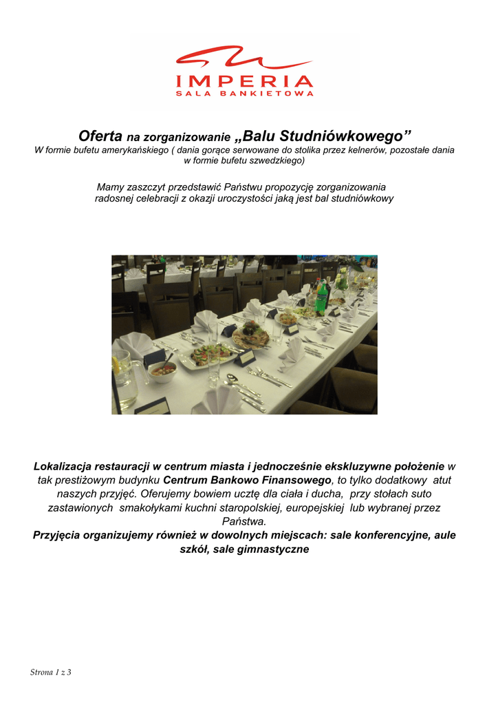 Oferta na zorganizowanie „Balu Studniówkowego” W formie bufetu amerykańskiego ( dania gorące serwowane do stolika przez kelnerów, pozostałe dania w formie bufetu szwedzkiego) Mamy zaszczyt przedstawić Państwu propozycję zorganizowania radosnej celebracji z okazji uroczystości jaką jest bal studniówkowy Lokalizacja restauracji w centrum miasta i jednocześnie ekskluzywne położenie w tak prestiżowym budynku Centrum Bankowo Finansowego, to tylko dodatkowy atut naszych przyjęć. Oferujemy bowiem ucztę dla ciała i ducha, przy stołach suto zastawionych smakołykami kuchni staropolskiej, europejskiej lub wybranej przez Państwa. Przyjęcia organizujemy również w dowolnych miejscach: sale konferencyjne, aule szkół, sale gimnastyczne Strona 1 z 3 W trakcie trwania przyjęcia zapewniamy bezpłatnie: Stały nadzór managera Dekoracje stołu, bufetów Starannie dobrany zespól profesjonalnych kelnerów i kucharzy który bierze pełną odpowiedzialność za zapewnienie kompleksowej realizacji Państwa zlecenia. Zimne przystawki Śledzie w trzech smakach ( w oleju z cebulą, po kaszubsku, po tatarsku) Wybór mięs pieczonych: schab karkowy, boczek zawijany, pasztet z dzika z żurawiną Półmisek Szefa: schab z faszerowanym jajkiem, z marchewką junior, z pasta ziołową, Rożki z szynki szpikowane musem jajecznym i marynowana cebulką Tęczowa terrina z kurczaka i pieczonych warzy Półmiski ze świeżymi warzywami Pieczywo pełnoziarniste, bankietowe Sałatki Sałatka grecka z fetą i oliwkami, Sałatka Jarzynowa, , Sałatka ze świeżymi warzywami, grillowanym kurczakiem i vinegrette musztardową, Zupa Rosół domowy z makaronem Drugie danie Eskalopki schabowe z sosem kremowym, smażonymi ziemniakami fasolka szparagową lub Pierś z indyka w sosie gruszkowo – żurawinowym z brokułami oraz pieczonymi ziemniakami Strona 2 z 3 Napoje zimne: Sok pomarańczowy, jabłkowy, woda mineralna z cytryną, coca cola, sprite Bufet z napojami gorącymi i deserami: Bufet z kawą i herbatą Wybór ciast domowych: Szarlotka domowa z prażonymi jabłkami, sernik w polewie czekoladowej, ciasto snickers z orzechami w polewie miodowej, mus czekoladowy z gruszką i inne Danie gorące Półmiski z ręcznie lepionym mixem pierogów: ruskie z okrasą, z kapusta i grzybami, z mięsem podane z okrasą Danie gorące Żurek z jajkiem i kiełbaską Koszt proponowanego przyjęcia wynosi 145 zł brutto od osoby Strona 3 z 3