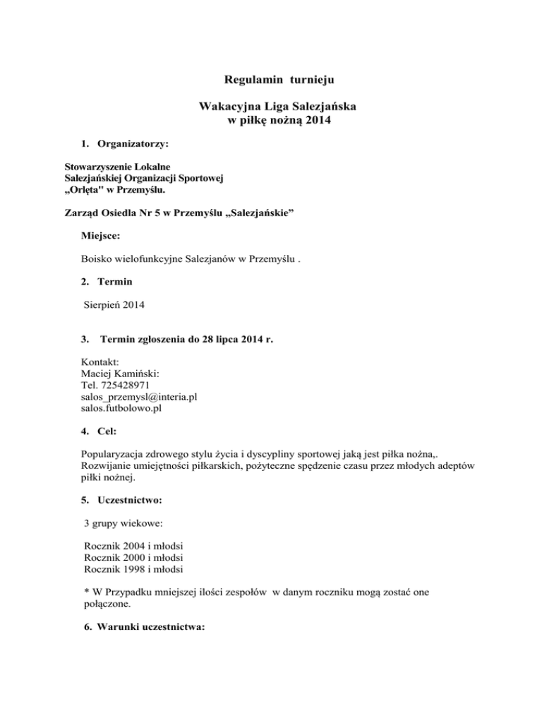 Regulamin turnieju Wakacyjna Liga Salezjańska w piłkę nożną 2014 1. Organizatorzy: Stowarzyszenie Lokalne Salezjańskiej Organizacji Sportowej „Orlęta" w Przemyślu. Zarząd Osiedla Nr 5 w Przemyślu „Salezjańskie” Miejsce: Boisko wielofunkcyjne Salezjanów w Przemyślu . 2. Termin Sierpień 2014 3. Termin zgłoszenia do 28 lipca 2014 r. Kontakt: Maciej Kamiński: Tel. 725428971 [email protected] salos.futbolowo.pl 4. Cel: Popularyzacja zdrowego stylu życia i dyscypliny sportowej jaką jest piłka nożna,. Rozwijanie umiejętności piłkarskich, pożyteczne spędzenie czasu przez młodych adeptów piłki nożnej. 5. Uczestnictwo: 3 grupy wiekowe: Rocznik 2004 i młodsi Rocznik 2000 i młodsi Rocznik 1998 i młodsi * W Przypadku mniejszej ilości zespołów w danym roczniku mogą zostać one połączone. 6. Warunki uczestnictwa: a. Każda drużyna przed rozpoczęciem rozgrywek doręczy imienną listę zawodników, podpisaną przez kierownika grupy. b. Zawodnik może występować tylko w jednej drużynie. c. Drużyna występuje w wybranych przez siebie strojach. 7. Zasady gry: a) Drużyna może zgłosić maksymalnie 10 zawodników bez możliwości dokonywania zmian w czasie rozgrywek, na boisku 4+1 bramkarz). b) Zespoły będą rywalizowały systemem ligowym lub grupowym. c) Czas gry wynosi 2 x 10 min. W przypadku mniejszej liczby zespołów czas może ulec zmianie d) Zawody rozgrywane będą piłką nożną. e) Zmiany zawodników powrotne „systemem halowym”. f) Po wybiciu piłki na widownię, aut boczny wykonywany jest nogą z miejsca, gdzie piłka opuściła pole gry. g) Wprowadzenie piłki do gry z autu bramkowego może odbywać się ręką lub nogą przez bramkarza. h) Pole karne oznaczone w obrębie jego linii. i) Pozostałe przepisy Reguluje PZPN - zgodnie z przepisami piłki nożnej. 8. Punktacja: Za zwycięstwo drużyna otrzymuje 2 pkt. Za remis 1 pkt. Za przegraną 0 pkt. 9. Kolejność: O zajęciu miejsca decyduje: ilość zdobytych punktów. Przy dwóch zespołach z jednakową ilością punktów o zajęciu miejsca decyduje: różnica bramek, większa liczba strzelonych goli. bezpośredni pojedynek zainteresowanych zespołów. 10. Dyscyplina: a) W rozgrywkach obowiązują kary upomnienia: 1 min, 2 min, całkowite wykluczenie. b) W przypadku niesportowego zachowania zawodnik może być odsunięty od trzech spotkań lub całkowicie wykluczony z rozgrywek. 11. Nagrody: Zespołowe: Każda drużyna 1-3 otrzymuje puchar, dyplomy i piłki. Indywidualne: Najlepszy zawodnik. Najlepszy bramkarz. Najlepszy strzelec Najlepszy obrońca Najlepszy napastnik 12. Sprawy inne: Organizatorzy zabezpieczają: Obsługę sędziowską. Opiekę medyczną. Prowadzenie dokumentacji rozgrywek. . Drużyny – opieka nauczyciela. Drużyny ubezpieczają się na swój koszt. Gra Fair play. Narzutki. Organizator nie ponosi odpowiedzialności z tytułu odszkodowania za zaginione mienie i przedmioty osobiste uczestników rozgrywek. Organizator nie ponosi odpowiedzialności za ewentualne kontuzje. Organizator zastrzega sobie zmianę w regulaminie rozgrywek.