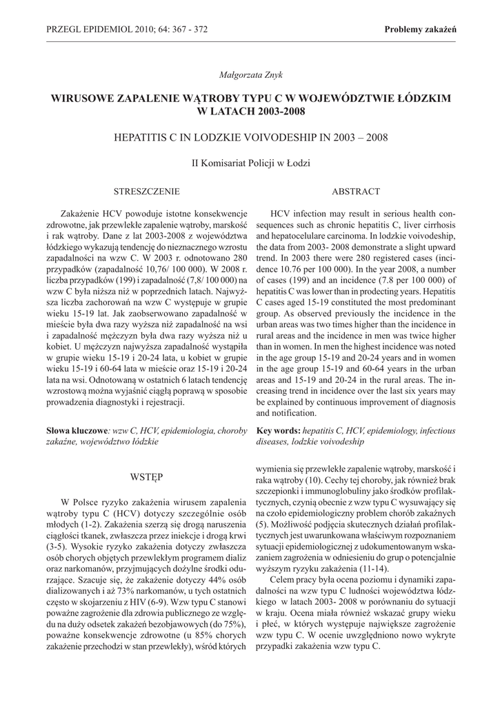 Problemy zakażeń PRZEGL EPIDEMIOL 2010; 64: 367 - 372 Małgorzata Znyk WIRUSOWE ZAPALENIE WĄTROBY TYPU C W WOJEWÓDZTWIE ŁÓDZKIM W LATACH 2003-2008 HEPATITIS C IN LODZKIE VOIVODESHIP IN 2003 – 2008 II Komisariat Policji w Łodzi STRESZCZENIE ABSTRACT Zakażenie HCV powoduje istotne konsekwencje zdrowotne, jak przewlekłe zapalenie wątroby, marskość i rak wątroby. Dane z lat 2003-2008 z województwa łódzkiego wykazują tendencję do nieznacznego wzrostu zapadalności na wzw C. W 2003 r. odnotowano 280 przypadków (zapadalność 10,76/ 100 000). W 2008 r. liczba przypadków (199) i zapadalność (7,8/ 100 000) na wzw C była niższa niż w poprzednich latach. Najwyższa liczba zachorowań na wzw C występuje w grupie wieku 15-19 lat. Jak zaobserwowano zapadalność w mieście była dwa razy wyższa niż zapadalność na wsi i zapadalność mężczyzn była dwa razy wyższa niż u kobiet. U mężczyzn najwyższa zapadalność wystąpiła w grupie wieku 15-19 i 20-24 lata, u kobiet w grupie wieku 15-19 i 60-64 lata w mieście oraz 15-19 i 20-24 lata na wsi. Odnotowaną w ostatnich 6 latach tendencję wzrostową można wyjaśnić ciągłą poprawą w sposobie prowadzenia diagnostyki i rejestracji. HCV infection may result in serious health consequences such as chronic hepatitis C, liver cirrhosis and hepatocelulare carcinoma. In lodzkie voivodeship, the data from 2003- 2008 demonstrate a slight upward trend. In 2003 there were 280 registered cases (incidence 10.76 per 100 000). In the year 2008, a number of cases (199) and an incidence (7.8 per 100 000) of hepatitis C was lower than in prodecting years. Hepatitis C cases aged 15-19 constituted the most predominant group. As observed previously the incidence in the urban areas was two times higher than the incidence in rural areas and the incidence in men was twice higher than in women. In men the highest incidence was noted in the age group 15-19 and 20-24 years and in women in the age group 15-19 and 60-64 years in the urban areas and 15-19 and 20-24 in the rural areas. The increasing trend in incidence over the last six years may be explained by continuous improvement of diagnosis and notification. Słowa kluczowe: wzw C, HCV, epidemiologia, choroby Key words: hepatitis C, HCV, epidemiology, infectious zakaźne, województwo łódzkie diseases, lodzkie voivodeship WSTĘP W Polsce ryzyko zakażenia wirusem zapalenia wątroby typu C (HCV) dotyczy szczególnie osób młodych (1-2). Zakażenia szerzą się drogą naruszenia ciągłości tkanek, zwłaszcza przez iniekcje i drogą krwi (3-5). Wysokie ryzyko zakażenia dotyczy zwłaszcza osób chorych objętych przewlekłym programem dializ oraz narkomanów, przyjmujących dożylne środki odurzające. Szacuje się, że zakażenie dotyczy 44% osób dializowanych i aż 73% narkomanów, u tych ostatnich często w skojarzeniu z HIV (6-9). Wzw typu C stanowi poważne zagrożenie dla zdrowia publicznego ze względu na duży odsetek zakażeń bezobjawowych (do 75%), poważne konsekwencje zdrowotne (u 85% chorych zakażenie przechodzi w stan przewlekły), wśród których wymienia się przewlekłe zapalenie wątroby, marskość i raka wątroby (10). Cechy tej choroby, jak również brak szczepionki i immunoglobuliny jako środków profilaktycznych, czynią obecnie z wzw typu C wysuwający się na czoło epidemiologiczny problem chorób zakaźnych (5). Możliwość podjęcia skutecznych działań profilaktycznych jest uwarunkowana właściwym rozpoznaniem sytuacji epidemiologicznej z udokumentowanym wskazaniem zagrożenia w odniesieniu do grup o potencjalnie wyższym ryzyku zakażenia (11-14). Celem pracy była ocena poziomu i dynamiki zapadalności na wzw typu C ludności województwa łódzkiego w latach 2003- 2008 w porównaniu do sytuacji w kraju. Ocena miała również wskazać grupy wieku i płeć, w których występuje największe zagrożenie wzw typu C. W ocenie uwzględniono nowo wykryte przypadki zakażenia wzw typu C. 368 Nr 3 Małgorzata Znyk MATERIAŁY I METODY zapadalności ogólnokrajowej) i łódzkim (10,8; 82,3%); podobnie było w latach 2006 i 2007 (w świętokrzyskim odpowiednio: 16,1 i 13,6; w łódzkim: 12,8 i 12,3). W 2008 r. zapadalność w województwie łódzkim była na 6 miejscu (7,8), za województwami: świętokrzyskim (12,5), dolnośląskim (11,5), wielkopolskim (8,9), kujawsko- pomorskim (8,8) i mazowieckim (8,2) (tab. II). Zmiany zapadalności obserwowane w kolejnych latach w poszczególnych województwach nie miały wpływu na rozmieszczenie zachorowań na wzw C w Polsce, rokrocznie w grupie województw o najwyższej i najniższej zapadalności występują te same województwa. Duże zróżnicowanie pomiędzy województwami wynika przypuszczalnie z różnic w czułości nadzoru epidemiologicznego i zgłaszaniu oraz rejestracji wyłącznie przypadków objawowych. W Polsce, jak i województwie łódzkim obserwowano do 2005 roku tylko niewielką tendencję wzrostu zapadalności a wzrost, który miał miejsce po 2005 r., wystąpił wraz z wdrożeniem do stosowania w Polsce definicji przypadku na potrzeby nadzoru epidemiologicznego, opracowanej we Wspólnocie Europejskiej (Decyzja Komisji Europejskiej 2002/253/KE) oraz nasileniem działań Inspekcji Sanitarnej, ukierunkowanych na zwiększenie czułości nadzoru. Wprowadzona definicja przypadku powinna przyczynić się do większej porównywalności danych pomiędzy województwami. Należy jednak zaznaczyć, że częstość wykrywania zakażenia HCV wśród dawców krwi wskazuje jednak na dość znaczne różnice w rozpowszechnieniu HCV na terenie Polski (16). W 2003 r. zarejestrowano w województwie łódzkim 280 zachorowań na wzw typu C, w tym 10 (3,6%) wywołanych przez zakażenia mieszane HCV i HBV. Analiza epidemiologiczna występowania wzw typu C w województwie łódzkim w latach 2003-2008 została przeprowadzona na podstawie danych zbiorczych opublikowanych w biuletynach rocznych (Czarkowski MP, Cielebąk E