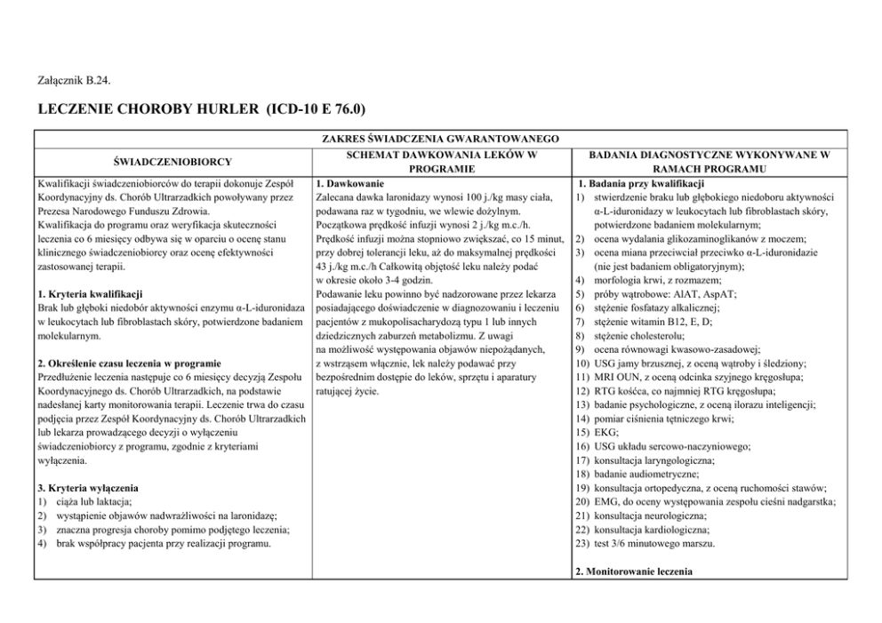 Załącznik B.24. LECZENIE CHOROBY HURLER (ICD-10 E 76.0) ZAKRES ŚWIADCZENIA GWARANTOWANEGO ŚWIADCZENIOBIORCY Kwalifikacji świadczeniobiorców do terapii dokonuje Zespół Koordynacyjny ds. Chorób Ultrarzadkich powoływany przez Prezesa Narodowego Funduszu Zdrowia. Kwalifikacja do programu oraz weryfikacja skuteczności leczenia co 6 miesięcy odbywa się w oparciu o ocenę stanu klinicznego świadczeniobiorcy oraz ocenę efektywności zastosowanej terapii. 1. Kryteria kwalifikacji Brak lub głęboki niedobór aktywności enzymu α-L-iduronidaza w leukocytach lub fibroblastach skóry, potwierdzone badaniem molekularnym. 2. Określenie czasu leczenia w programie Przedłużenie leczenia następuje co 6 miesięcy decyzją Zespołu Koordynacyjnego ds. Chorób Ultrarzadkich, na podstawie nadesłanej karty monitorowania terapii. Leczenie trwa do czasu podjęcia przez Zespół Koordynacyjny ds. Chorób Ultrarzadkich lub lekarza prowadzącego decyzji o wyłączeniu świadczeniobiorcy z programu, zgodnie z kryteriami wyłączenia. 3. Kryteria wyłączenia 1) ciąża lub laktacja; 2) wystąpienie objawów nadwrażliwości na laronidazę; 3) znaczna progresja choroby pomimo podjętego leczenia; 4) brak współpracy pacjenta przy realizacji programu. SCHEMAT DAWKOWANIA LEKÓW W PROGRAMIE 1. Dawkowanie Zalecana dawka laronidazy wynosi 100 j./kg masy ciała, podawana raz w tygodniu, we wlewie dożylnym. Początkowa prędkość infuzji wynosi 2 j./kg m.c./h. Prędkość infuzji można stopniowo zwiększać, co 15 minut, przy dobrej tolerancji leku, aż do maksymalnej prędkości 43 j./kg m.c./h Całkowitą objętość leku należy podać w okresie około 3-4 godzin. Podawanie leku powinno być nadzorowane przez lekarza posiadającego doświadczenie w diagnozowaniu i leczeniu pacjentów z mukopolisacharydozą typu 1 lub innych dziedzicznych zaburzeń metabolizmu. Z uwagi na możliwość występowania objawów niepożądanych, z wstrząsem włącznie, lek należy podawać przy bezpośrednim dostępie do leków, sprzętu i aparatury ratującej życie. BADANIA DIAGNOSTYCZNE WYKONYWANE W RAMACH PROGRAMU 1. Badania przy kwalifikacji 1) stwierdzenie braku lub głębokiego niedoboru aktywności α-L-iduronidazy w leukocytach lub fibroblastach skóry, potwierdzone badaniem molekularnym; 2) ocena wydalania glikozaminoglikanów z moczem; 3) ocena miana przeciwciał przeciwko α-L-iduronidazie (nie jest badaniem obligatoryjnym); 4) morfologia krwi, z rozmazem; 5) próby wątrobowe: AlAT, AspAT; 6) stężenie fosfatazy alkalicznej; 7) stężenie witamin B12, E, D; 8) stężenie cholesterolu; 9) ocena równowagi kwasowo-zasadowej; 10) USG jamy brzusznej, z oceną wątroby i śledziony; 11) MRI OUN, z oceną odcinka szyjnego kręgosłupa; 12) RTG kośćca, co najmniej RTG kręgosłupa; 13) badanie psychologiczne, z oceną ilorazu inteligencji; 14) pomiar ciśnienia tętniczego krwi; 15) EKG; 16) USG układu sercowo-naczyniowego; 17) konsultacja laryngologiczna; 18) badanie audiometryczne; 19) konsultacja ortopedyczna, z oceną ruchomości stawów; 20) EMG, do oceny występowania zespołu cieśni nadgarstka; 21) konsultacja neurologiczna; 22) konsultacja kardiologiczna; 23) test 3/6 minutowego marszu. 2. Monitorowanie leczenia 2.1 Raz na 180 dni 1) morfologia krwi, z rozmazem; 2) próby wątrobowe: AlAT, AspAT; 3) stężenie fosfatazy alkalicznej; 4) ocena równowagi kwasowo-zasadowej; 5) badanie okulistyczne, z oceną w lampie szczelinowej; 6) badanie spirometryczne układu oddechowego; 7) pomiary antropometryczne; 8) pomiar ciśnienia tętniczego krwi; 9) test 3/6 minutowego marszu. Okresowej oceny skuteczności terapii dokonuje lekarz niezaangażowany w leczenie pacjentów z chorobą Hurler. Przedłużenie leczenia następuje, co 6 miesięcy, decyzją Zespołu Koordynacyjnego ds. Chorób Ultrarzadkich, na podstawie nadesłanej karty monitorowania terapii. 2.2 Co 365 dni 1) ocena wydalania glikozaminoglikanów z moczem (po 6 miesiącach od wprowadzenia terapii, a następnie co 365 dni); 2) ocena miana przeciwciał przeciwko α-L-iduronidazie (badanie obligatoryjne w przypadku decyzji o zwiększeniu dawki leku lub braku efektywności dotychczasowej dawki leku); 3) stężenie witamin B12, E, D; 4) stężenie cholesterolu; 5) USG jamy brzusznej, z oceną wątroby i śledziony; 6) MRI OUN, z oceną odcinka szyjnego kręgosłupa (MRI OUN w przypadku nieprawidłowości w poprzednim badaniu lub pojawienia się lub nasilenia objawów neurologicznych); 7) RTG kośćca, co najmniej RTG kręgosłupa; 8) badanie psychologiczne, z oceną ilorazu inteligencji; 9) EKG; 10) USG układu sercowo-naczyniowego (w przypadku nieprawidłowości w układzie sercowo-naczyniowym konsultacja kardiologiczna - co 180 dni lub częściej); 11) 12) 13) 14) 15) 16) konsultacja laryngologiczna; badanie audiometryczne; konsultacja ortopedyczna, z oceną ruchomości stawów; EMG, do oceny występowania zespołu cieśni nadgarstka; konsultacja neurologiczna; konsultacja kardiologiczna. 3. Monitorowanie programu 1) gromadzenie w dokumentacji medycznej pacjenta danych dotyczących monitorowania leczenia i każdorazowe ich przedstawianie na żądanie kontrolerów Narodowego Funduszu Zdrowia; 2) uzupełnienie danych zawartych w rejestrze (SMPT) dostępnym za pomocą aplikacji internetowej udostępnionej przez OW NFZ, z częstotliwością zgodną z opisem programu oraz na zakończenie leczenia; 3) przekazywanie informacji sprawozdawczorozliczeniowych do NFZ: informacje przekazuje się do NFZ w formie papierowej lub w formie elektronicznej, zgodnie z wymaganiami opublikowanymi przez Narodowy Fundusz Zdrowia.