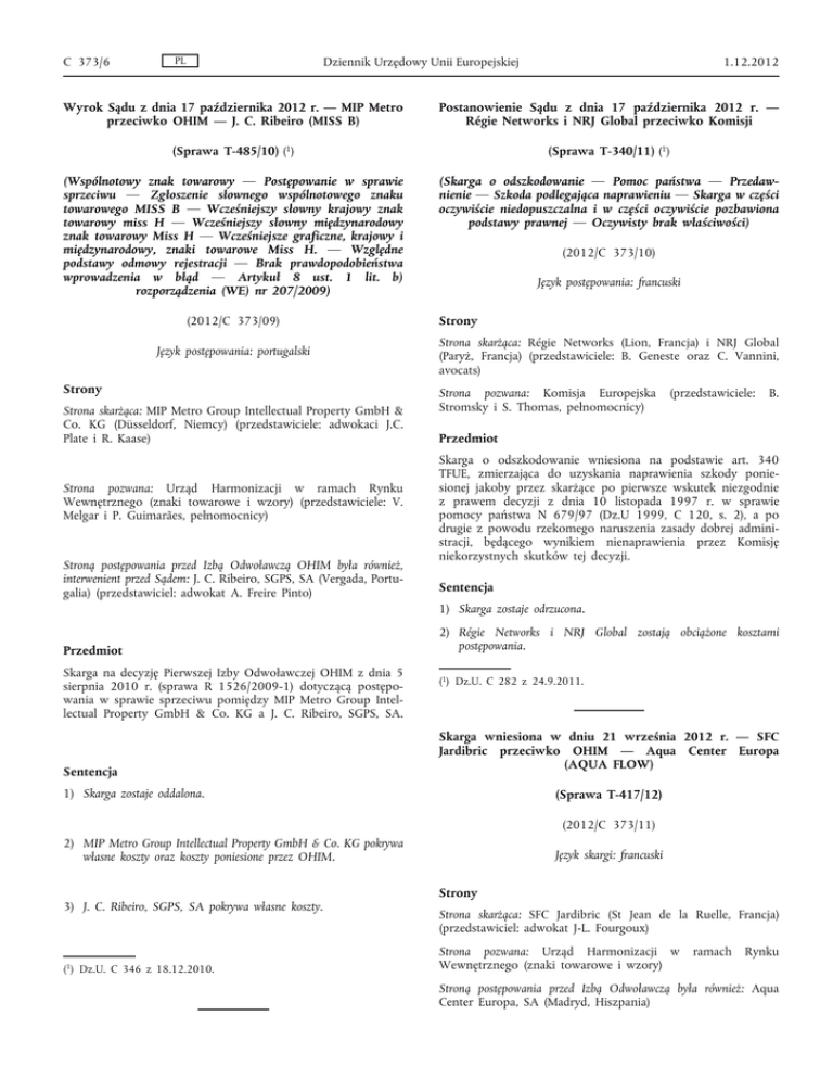 C 373/6 PL Dziennik Urzędowy Unii Europejskiej 1.12.2012 Wyrok Sądu z dnia 17 października 2012 r. — MIP Metro przeciwko OHIM — J. C. Ribeiro (MISS B) Postanowienie Sądu z dnia 17 października 2012 r. — Régie Networks i NRJ Global przeciwko Komisji (Sprawa T-485/10) (1) (Sprawa T-340/11) (1) (Wspólnotowy znak towarowy — Postępowanie w sprawie sprzeciwu — Zgłoszenie słownego wspólnotowego znaku towarowego MISS B — Wcześniejszy słowny krajowy znak towarowy miss H — Wcześniejszy słowny międzynarodowy znak towarowy Miss H — Wcześniejsze graficzne, krajowy i międzynarodowy, znaki towarowe Miss H. — Względne podstawy odmowy rejestracji — Brak prawdopodobieństwa wprowadzenia w błąd — Artykuł 8 ust. 1 lit. b) rozporządzenia (WE) nr 207/2009) (Skarga o odszkodowanie — Pomoc państwa — Przedaw nienie — Szkoda podlegająca naprawieniu — Skarga w części oczywiście niedopuszczalna i w części oczywiście pozbawiona podstawy prawnej — Oczywisty brak właściwości) (2012/C 373/09) Język postępowania: portugalski Strony Strona skarżąca: MIP Metro Group Intellectual Property GmbH & Co. KG (Düsseldorf, Niemcy) (przedstawiciele: adwokaci J.C. Plate i R. Kaase) Strona pozwana: Urząd Harmonizacji w ramach Rynku Wewnętrznego (znaki towarowe i wzory) (przedstawiciele: V. Melgar i P. Guimarães, pełnomocnicy) Stroną postępowania przed Izbą Odwoławczą OHIM była również, interwenient przed Sądem: J. C. Ribeiro, SGPS, SA (Vergada, Portu galia) (przedstawiciel: adwokat A. Freire Pinto) (2012/C 373/10) Język postępowania: francuski Strony Strona skarżąca: Régie Networks (Lion, Francja) i NRJ Global (Paryż, Francja) (przedstawiciele: B. Geneste oraz C. Vannini, avocats) Strona pozwana: Komisja Europejska Stromsky i S. Thomas, pełnomocnicy) (przedstawiciele: B. Przedmiot Skarga o odszkodowanie wniesiona na podstawie art. 340 TFUE, zmierzająca do uzyskania naprawienia szkody ponie sionej jakoby przez skarżące po pierwsze wskutek niezgodnie z prawem decyzji z dnia 10 listopada 1997 r. w sprawie pomocy państwa N 679/97 (Dz.U 1999, C 120, s. 2), a po drugie z powodu rzekomego naruszenia zasady dobrej admini stracji, będącego wynikiem nienaprawienia przez Komisję niekorzystnych skutków tej decyzji. Sentencja 1) Skarga zostaje odrzucona. Przedmiot Skarga na decyzję Pierwszej Izby Odwoławczej OHIM z dnia 5 sierpnia 2010 r. (sprawa R 1526/2009-1) dotyczącą postępo wania w sprawie sprzeciwu pomiędzy MIP Metro Group Intel lectual Property GmbH & Co. KG a J. C. Ribeiro, SGPS, SA. Sentencja 2) Régie Networks i NRJ Global zostają obciążone kosztami postępowania. (1) Dz.U. C 282 z 24.9.2011. Skarga wniesiona w dniu 21 września 2012 r. — SFC Jardibric przeciwko OHIM — Aqua Center Europa (AQUA FLOW) 1) Skarga zostaje oddalona. (Sprawa T-417/12) (2012/C 373/11) 2) MIP Metro Group Intellectual Property GmbH & Co. KG pokrywa własne koszty oraz koszty poniesione przez OHIM. 3) J. C. Ribeiro, SGPS, SA pokrywa własne koszty. (1) Dz.U. C 346 z 18.12.2010. Język skargi: francuski Strony Strona skarżąca: SFC Jardibric (St Jean de la Ruelle, Francja) (przedstawiciel: adwokat J-L. Fourgoux) Strona pozwana: Urząd Harmonizacji w Wewnętrznego (znaki towarowe i wzory) ramach Rynku Stroną postępowania przed Izbą Odwoławczą była również: Aqua Center Europa, SA (Madryd, Hiszpania)