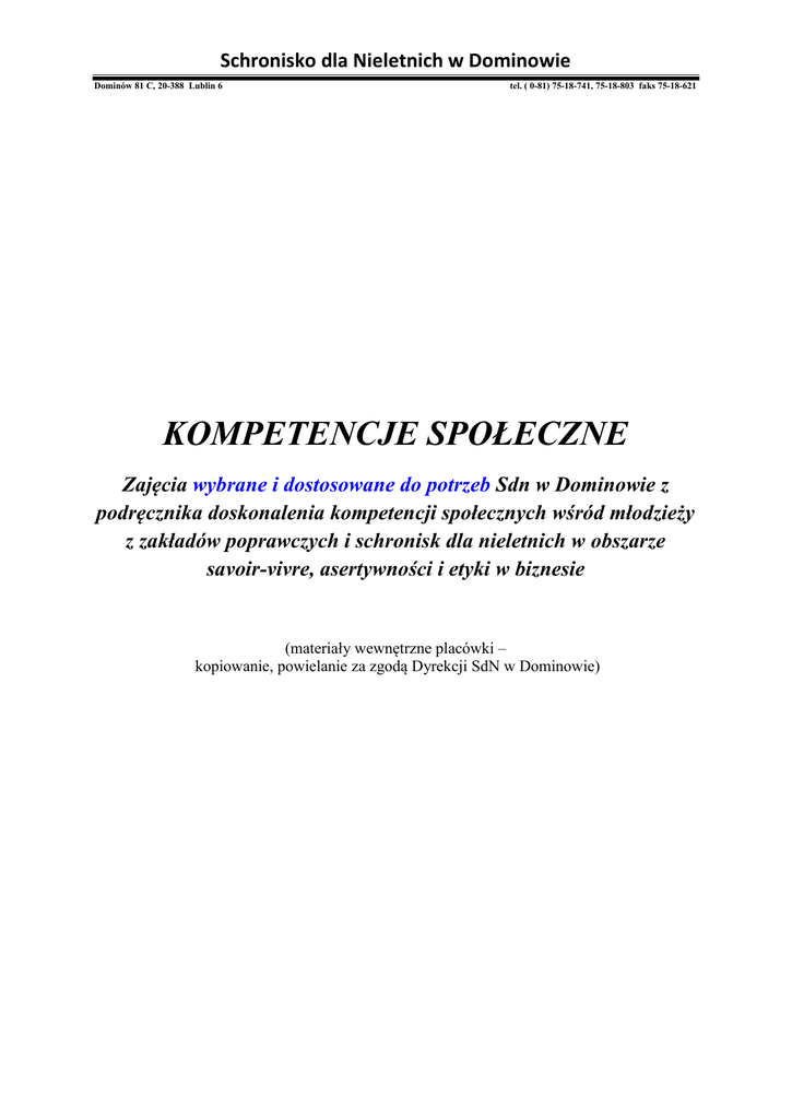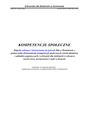 Schronisko dla Nieletnich w Dominowie Dominów 81 C, 20-388 Lublin 6 tel. ( 0-81) 75-18-741, 75-18-803 faks 75-18-621 KOMPETENCJE SPOŁECZNE Zajęcia wybrane i dostosowane do potrzeb Sdn w Dominowie z podręcznika doskonalenia kompetencji społecznych wśród młodzieży z zakładów poprawczych i schronisk dla nieletnich w obszarze savoir-vivre, asertywności i etyki w biznesie (materiały wewnętrzne placówki – kopiowanie, powielanie za zgodą Dyrekcji SdN w Dominowie) Zadania szczegółowe L.p. 1 2 3 4 5 6 7 8 9 10 1 2 3 4 5 6 7 8 9 10 Zadania Sposoby realizacji CZĘŚĆ I – SAVOIR - VIVRE Zajęcia edukacyjne przeprowadzone na podstawie opracowanego scenariusza. Zajęcia edukacyjne przeprowadzone na Komunikacja werbalna (słowna). podstawie opracowanego scenariusza. Zajęcia edukacyjne przeprowadzone na Zwroty grzecznościowe. podstawie opracowanego scenariusza. Zajęcia edukacyjne przeprowadzone na Komunikacja niewerbalna. podstawie opracowanego scenariusza. Zajęcia edukacyjne przeprowadzone na Zachowanie w sytuacjach oficjalnych. podstawie opracowanego scenariusza. Zajęcia edukacyjne przeprowadzone na Savoir-vivre przy stole. podstawie opracowanego scenariusza. Organizacja przyjęcia a rola a rola Zajęcia edukacyjne przeprowadzone na gospodarza. podstawie opracowanego scenariusza. Netykieta, czyli zasady komunikacji Zajęcia edukacyjne przeprowadzone na elektronicznej. podstawie opracowanego scenariusza. Zajęcia edukacyjne przeprowadzone na Rozmowy telefoniczne. podstawie opracowanego scenariusza. Zajęcia edukacyjne przeprowadzone na Pisma urzędowe. podstawie opracowanego scenariusza. CZĘŚĆ II - ASERTYWNOŚĆ Zajęcia edukacyjne przeprowadzone na Asertywna reakcja na ocenę. podstawie opracowanego scenariusza. Zajęcia edukacyjne przeprowadzone na Asertywne wyrażanie opinii i ocen. podstawie opracowanego scenariusza. Zajęcia edukacyjne przeprowadzone na Asertywna reakcja na atak werbalny. podstawie opracowanego scenariusza. Asertywna odmowa w sytuacji Zajęcia edukacyjne przeprowadzone na towarzyskiej. podstawie opracowanego scenariusza. Powiedz „TAK” swojemu zdrowiu, Zajęcia edukacyjne przeprowadzone na powiedz „NIE” używkom. podstawie opracowanego scenariusza. Asertywna odmowa w sytuacji Zajęcia edukacyjne przeprowadzone na zawodowej. podstawie opracowanego scenariusza. Zajęcia edukacyjne przeprowadzone na Asertywne wyrażanie gniewu. podstawie opracowanego scenariusza. Zajęcia edukacyjne przeprowadzone na Asertywne reagowanie na agresję fizyczną. podstawie opracowanego scenariusza. Asertywne reagowanie w konfliktach osób Zajęcia edukacyjne przeprowadzone na trzecich. podstawie opracowanego scenariusza. Ktoś ma przewagę? Odzyskaj równowagę Zajęcia edukacyjne przeprowadzone na dzięki asertywności! podstawie opracowanego scenariusza. Wygląd zewnętrzny. SCHRONISKO DLA NIELETNICH W DOMINOWIE Strona 2 1 2 3 4 5 6 7 8 9 10 CZĘŚĆ III – ETYKA W BIZNESIE Zajęcia edukacyjne przeprowadzone na Mobbing w miejscu pracy. podstawie opracowanego scenariusza. Zajęcia edukacyjne przeprowadzone na Dyskryminacja w miejscu pracy. podstawie opracowanego scenariusza. Zajęcia edukacyjne przeprowadzone na Działania na szkodę pracodawcy. podstawie opracowanego scenariusza. Zajęcia edukacyjne przeprowadzone na Zasady kontaktów damsko – męskich. podstawie opracowanego scenariusza. Zajęcia edukacyjne przeprowadzone na Zjawiska patologiczne w miejscu pracy. podstawie opracowanego scenariusza. Zajęcia edukacyjne przeprowadzone na Etyczne reagowanie na donosicielstwo. podstawie opracowanego scenariusza. Ochrona danych osobowych i sfery Zajęcia edukacyjne przeprowadzone na prywatnej w miejscu pracy. podstawie opracowanego scenariusza. Profesjonalne zarządzanie informacjami o Zajęcia edukacyjne przeprowadzone na sobie. podstawie opracowanego scenariusza. Zajęcia edukacyjne przeprowadzone na Kodeks etyczny w miejscu pracy. podstawie opracowanego scenariusza. Zajęcia edukacyjne przeprowadzone na Społeczne zaangażowanie biznesu CSR. podstawie opracowanego scenariusza. SCHRONISKO DLA NIELETNICH W DOMINOWIE Strona 3