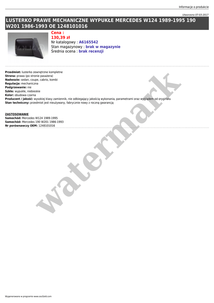Informacje o produkcie Utworzono 07-03-2017 LUSTERKO PRAWE MECHANICZNE WYPUKŁE MERCEDES W124 1989-1995 190 W201 1986-1993 OE 1248101016 Cena : 130,39 zł Nr katalogowy : A6165542 Stan magazynowy : brak w magazynie Średnia ocena : brak recenzji er m ar k Przedmiot: lusterko zewnętrzne kompletne Strona: prawa (po stronie pasażera) Nadwozie: sedan, coupe, cabrio, kombi Regulacja: mechaniczna Podgrzewanie: nie Szkło: wypukłe, niebieskie Kolor: obudowa czarna Producent / jakość: wysokiej klasy zamiennik, nie odbiegający jakością wykonania, parametrami oraz wyglądem od oryginału Stan techniczny: przedmiot jest nieużywany, fabrycznie nowy z roczną gwarancją w at ZASTOSOWANIE Samochód: Mercedes W124 1989-1995 Samochód: Mercedes 190 W201 1986-1993 Nr porównawczy OEM: 1248101016 Wygenerowano w programie www.oscGold.com