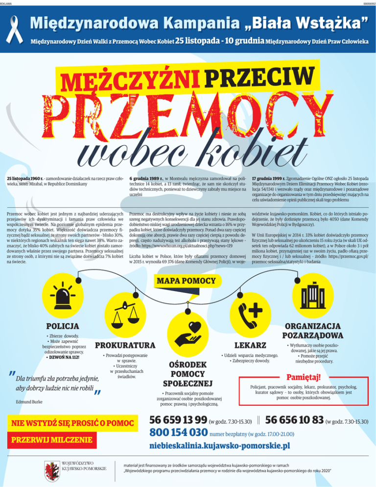 REKLAMA 006906902 Międzynarodowa Kampania „Biała Wstążka” Międzynarodowy Dzień Walki z Przemocą Wobec Kobiet 25 listopada - 10 grudnia Międzynarodowy Dzień Praw Człowieka MĘŻCZYŹNI PRZECIW y c o m e Przemocy z Pr wobec kobiet 25 listopada 1960 r. - zamordowanie działaczek na rzecz praw człowieka, sióstr Mirabal, w Republice Dominikany 6 grudnia 1989 r., w Montrealu mężczyzna zamordował na politechnice 14 kobiet, a 13 ranił, twierdząc, że sam nie skończył studiów technicznych, ponieważ to dziewczyny zabrały mu miejsce na uczelni 17 grudnia 1999 r. Zgromadzenie Ogólne ONZ ogłosiło 25 listopada Międzynarodowym Dniem Eliminacji Przemocy Wobec Kobiet (rezolucja 54/134) i wezwało rządy oraz międzynarodowe i pozarządowe organizacje do organizowania w tym dniu przedsięwzięć mających na celu uświadomienie opinii publicznej skali tego problemu Przemoc wobec kobiet jest jednym z najbardziej uderzających przejawów ich dyskryminacji i łamania praw człowieka we współczesnym świecie. Na poziomie globalnym epidemia przemocy dotyka 35% kobiet. Większość doświadcza przemocy fizycznej bądź seksualnej ze strony swoich partnerów - blisko 30%, w niektórych regionach wskaźnik ten sięga nawet 38%. Warto zaznaczyć, że blisko 40% zabitych na świecie kobiet zostało zamordowanych właśnie przez swojego partnera. Przemocy seksualnej ze strony osób, z którymi nie są związane doświadcza 7% kobiet na świecie. Przemoc ma destrukcyjny wpływ na życie kobiety i niesie ze sobą szereg negatywnych konsekwencji dla jej stanu zdrowia. Prawdopodobieństwo niskiej wagi urodzeniowej dziecka wzrasta o 16% w przypadku kobiet, które doświadczyły przemocy. Ponad dwa razy częściej dokonują one aborcji, prawie dwa razy częściej cierpią z powodu depresji, często nadużywają też alkoholu i przeżywają stany lękowe źródło: https://www.who.un.org.pl/aktualnosci.php?news=119 wództwie kujawsko-pomorskim. Kobiet, co do których istniało podejrzenie, że były dotknięte przemocą było 4050 (dane Komendy Wojewódzkiej Policji w Bydgoszczy). Liczba kobiet w Polsce, które były ofiarami przemocy domowej w 2015 r. wynosiła 69 376 (dane Komendy Głównej Policji), w woje- W Unii Europejskiej w 2014 r. 33% kobiet doświadczyło przemocy fizycznej lub seksualnej po ukończeniu 15 roku życia (w skali UE odsetek ten odpowiada 62 milionom kobiet), a w Polsce około 3 i pół miliona kobiet, przynajmniej raz w swoim życiu, padło ofiarą przemocy fizycznej i / lub seksualnej – źródło: https://przemoc.gov.pl/ przemoc-seksualna/statystyki-i-badania MAPA POMOCY POLICJA • Zbierze dowody. • Może zapewnić bezpieczeństwo poprzez odizolowanie sprawcy. • DZWOŃ NA 112! ” PROKURATURA LEKARZ • Prowadzi postępowanie w sprawie. • Uczestniczy w przesłuchaniach świadków. • Udzieli wsparcia medycznego. • Zabezpieczy dowody. Dla triumfu zła potrzeba jedynie, aby dobrzy ludzie nic nie robili Edmund Burke ” • Pracownik socjalny pomoże zorganizować osobie poszkodowanej pomoc prawną i psychologiczną. NIE WSTYDŹ SIĘ PROSIĆ O POMOC PRZERWIJ MILCZENIE OŚRODEK POMOCY SPOŁECZNEJ ORGANIZACJA POZARZĄDOWA • Wytłumaczy osobie poszkodowanej, jakie są jej prawa. • Pomoże przejść niezbędne procedury. Pamiętaj! Policjant, pracownik socjalny, lekarz, prokurator, psycholog, kurator sądowy – to osoby, których obowiązkiem jest pomoc osobie poszkodowanej. 56 659 13 99 (w godz. 7.30-15.30) 56 656 10 83 (w godz. 7.30-15.30) 800 154 030 numer bezpłatny (w godz. 17.00-21.00) niebieskalinia.kujawsko-pomorskie.pl materiał jest finansowany ze środków samorządu województwa kujawsko-pomorskiego w ramach „Wojewódzkiego programu przeciwdziałania przemocy w rodzinie dla województwa kujawsko-pomorskiego do roku 2020”