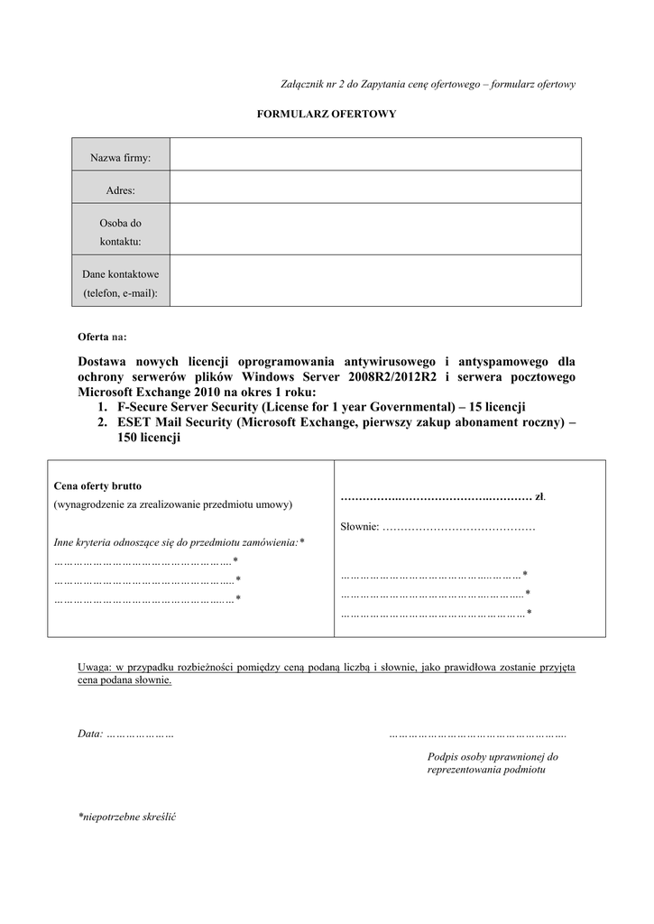 Załącznik nr 2 do Zapytania cenę ofertowego – formularz ofertowy FORMULARZ OFERTOWY Nazwa firmy: Adres: Osoba do kontaktu: Dane kontaktowe (telefon, e-mail): Oferta na: Dostawa nowych licencji oprogramowania antywirusowego i antyspamowego dla ochrony serwerów plików Windows Server 2008R2/2012R2 i serwera pocztowego Microsoft Exchange 2010 na okres 1 roku: 1. F-Secure Server Security (License for 1 year Governmental) – 15 licencji 2. ESET Mail Security (Microsoft Exchange, pierwszy zakup abonament roczny) – 150 licencji Cena oferty brutto (wynagrodzenie za zrealizowanie przedmiotu umowy) …………….…………………….………… zł. Słownie: …………………………………… Inne kryteria odnoszące się do przedmiotu zamówienia:* ……………………………………………….* ………………………………………………..* ………………………………………..………* ……………………………………………..…* ……………………………………….………..* …………………………………………………* Uwaga: w przypadku rozbieżności pomiędzy ceną podaną liczbą i słownie, jako prawidłowa zostanie przyjęta cena podana słownie. Data: ………………… ………………………………………………. Podpis osoby uprawnionej do reprezentowania podmiotu *niepotrzebne skreślić