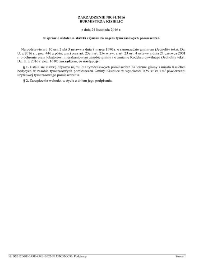ZARZĄDZENIE NR 91/2016 BURMISTRZA KISIELIC z dnia 24 listopada 2016 r. w sprawie ustalenia stawki czynszu za najem tymczasowych pomieszczeń Na podstawie art. 30 ust. 2 pkt 3 ustawy z dnia 8 marca 1990 r. o samorządzie gminnym (Jednolity tekst: Dz. U. z 2016 r. , poz. 446 z późn. zm.) oraz art. 25a i art. 25e w zw. z art. 23 ust. 4 ustawy z dnia 21 czerwca 2001 r. o ochronie praw lokatorów, mieszkaniowym zasobie gminy i o zmianie Kodeksu cywilnego (Jednolity tekst: Dz. U. z 2016 r. poz. 1610) zarządzam, co następuje: § 1. Ustala się stawkę czynszu najmu dla tymczasowych pomieszczeń na terenie gminy i miasta Kisielice będących w zasobie tymczasowych pomieszczeń Gminy Kisielice w wysokości 0,59 zł za 1m2 powierzchni użytkowej tymczasowego pomieszczenia. § 2. Zarządzenie wchodzi w życie z dniem jego podpisania. Id: D2B12DBE-0A9E-454B-BF23-F1353C33CC86. Podpisany Strona 1 Uzasadnienie Zgodnie z Zarządzeniem nr 43/2016 Burmistrza Kisielic z dnia 24 maja 2016 r. w sprawie ustalenia stawki czynszu za wynajem lokali mieszkalnych i lokali socjalnych stawka czynszu za najem 1m2 powierzchni użytkowej lokalu mieszkalnego na terenie gminy i miasta Kisielice została ustalona w wysokości 1,98 zł, a po uwzględnieniu czynników zmniejszających wysokość tej stawki najniższy czynsz obowiązujący w gminnym zasobie mieszkaniowym wynosi 1,18 zł. Ustawa z dnia 21 czerwca 2001 r. o ochronie praw lokatorów, mieszkaniowym zasobie gminy i o zmianie Kodeksu cywilnego (t.j.: Dz. U. z 2016 r. poz. 1610) w art. 23 ust. 4 stanowi, że stawka czynszu za lokal socjalny nie może przekraczać połowy stawki najniższego czynszu obowiązującego w gminnym zasobie mieszkaniowym. W myśl art. 25e powołanej ustawy przepis ten stosuje się odpowiednio do tymczasowych pomieszczeń z zasobu utworzonego przez gminę. Id: D2B12DBE-0A9E-454B-BF23-F1353C33CC86. Podpisany Strona 1
