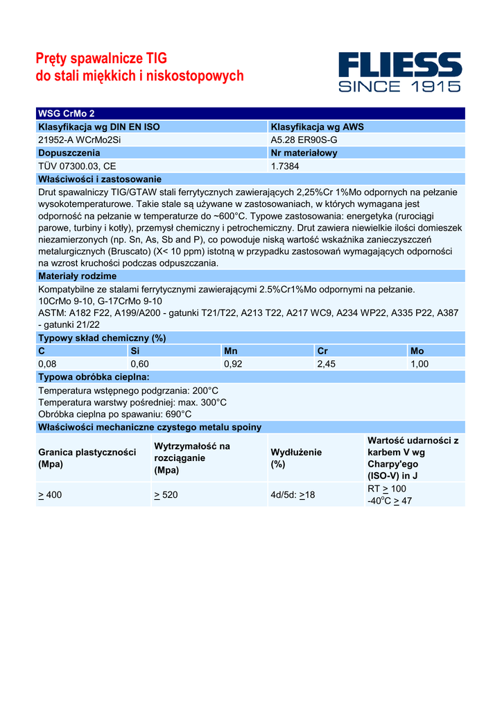 Pręty spawalnicze TIG do stali miękkich i niskostopowych WSG CrMo 2 Klasyfikacja wg DIN EN ISO Klasyfikacja wg AWS 21952-A WCrMo2Si A5.28 ER90S-G Dopuszczenia Nr materiałowy TÜV 07300.03, CE 1.7384 Właściwości i zastosowanie Drut spawalniczy TIG/GTAW stali ferrytycznych zawierających 2,25%Cr 1%Mo odpornych na pełzanie wysokotemperaturowe. Takie stale są używane w zastosowaniach, w których wymagana jest odporność na pełzanie w temperaturze do ~600°C. Typowe zastosowania: energetyka (rurociągi parowe, turbiny i kotły), przemysł chemiczny i petrochemiczny. Drut zawiera niewielkie ilości domieszek niezamierzonych (np. Sn, As, Sb and P), co powoduje niską wartość wskaźnika zanieczyszczeń metalurgicznych (Bruscato) (X< 10 ppm) istotną w przypadku zastosowań wymagających odporności na wzrost kruchości podczas odpuszczania. Materiały rodzime Kompatybilne ze stalami ferrytycznymi zawierającymi 2.5%Cr1%Mo odpornymi na pełzanie. 10CrMo 9-10, G-17CrMo 9-10 ASTM: A182 F22, A199/A200 - gatunki T21/T22, A213 T22, A217 WC9, A234 WP22, A335 P22, A387 - gatunki 21/22 Typowy skład chemiczny (%) C Si Mn Cr Mo 0,08 0,60 0,92 2,45 1,00 Typowa obróbka cieplna: Temperatura wstępnego podgrzania: 200°C Temperatura warstwy pośredniej: max. 300°C Obróbka cieplna po spawaniu: 690°C Właściwości mechaniczne czystego metalu spoiny Wartość udarności z Wytrzymałość na Granica plastyczności Wydłużenie karbem V wg rozciąganie (Mpa) (%) Charpy'ego (Mpa) (ISO-V) in J RT > 100 > 400 > 520 4d/5d: >18 -40oC > 47
